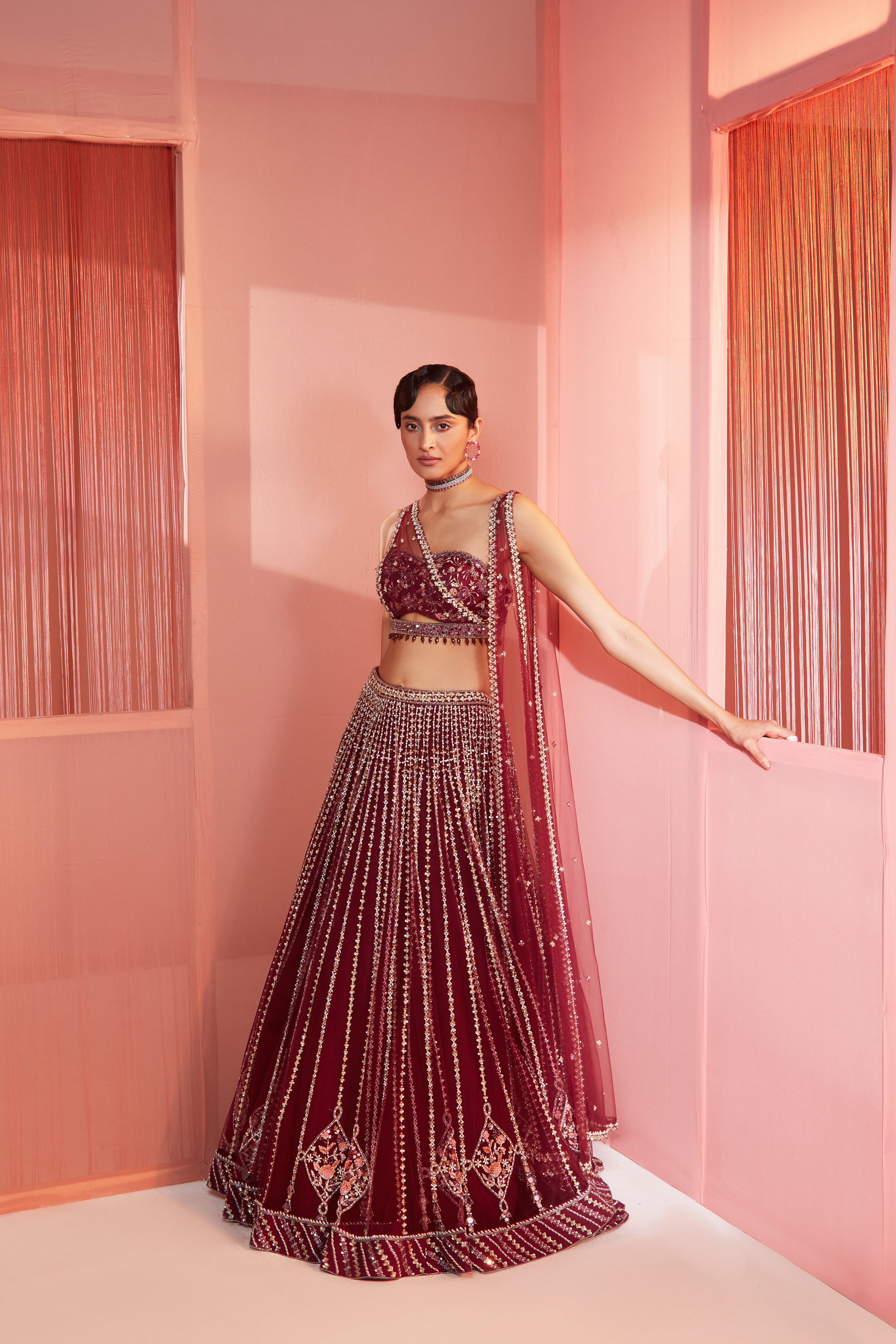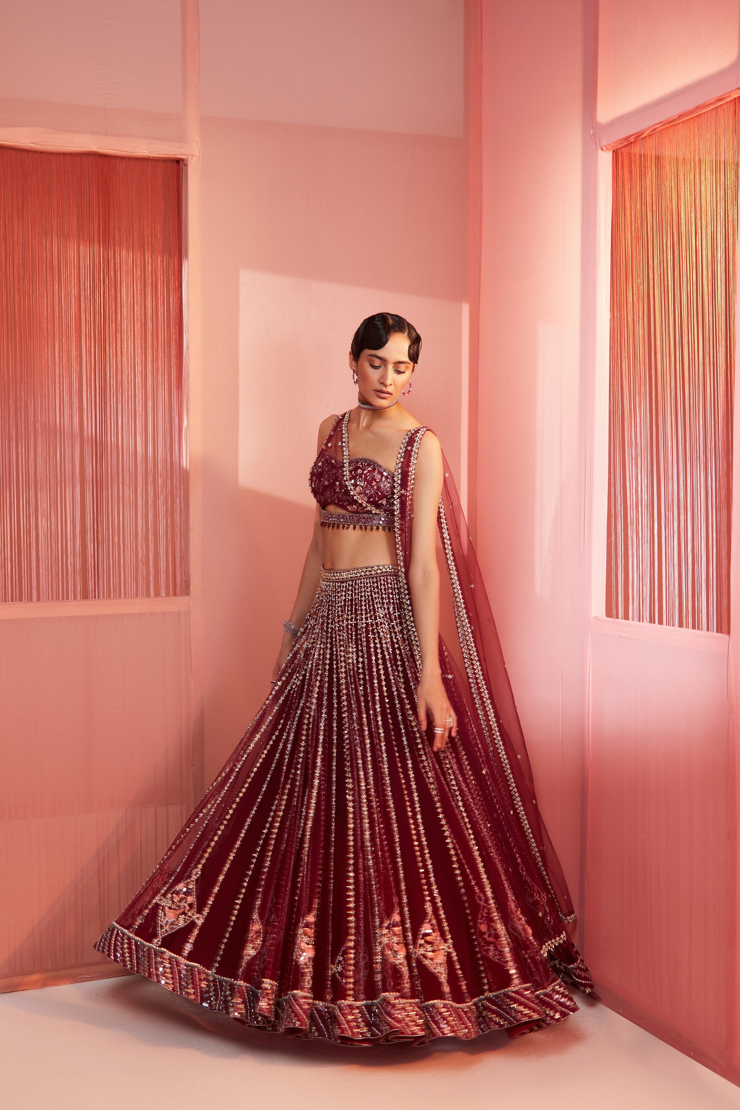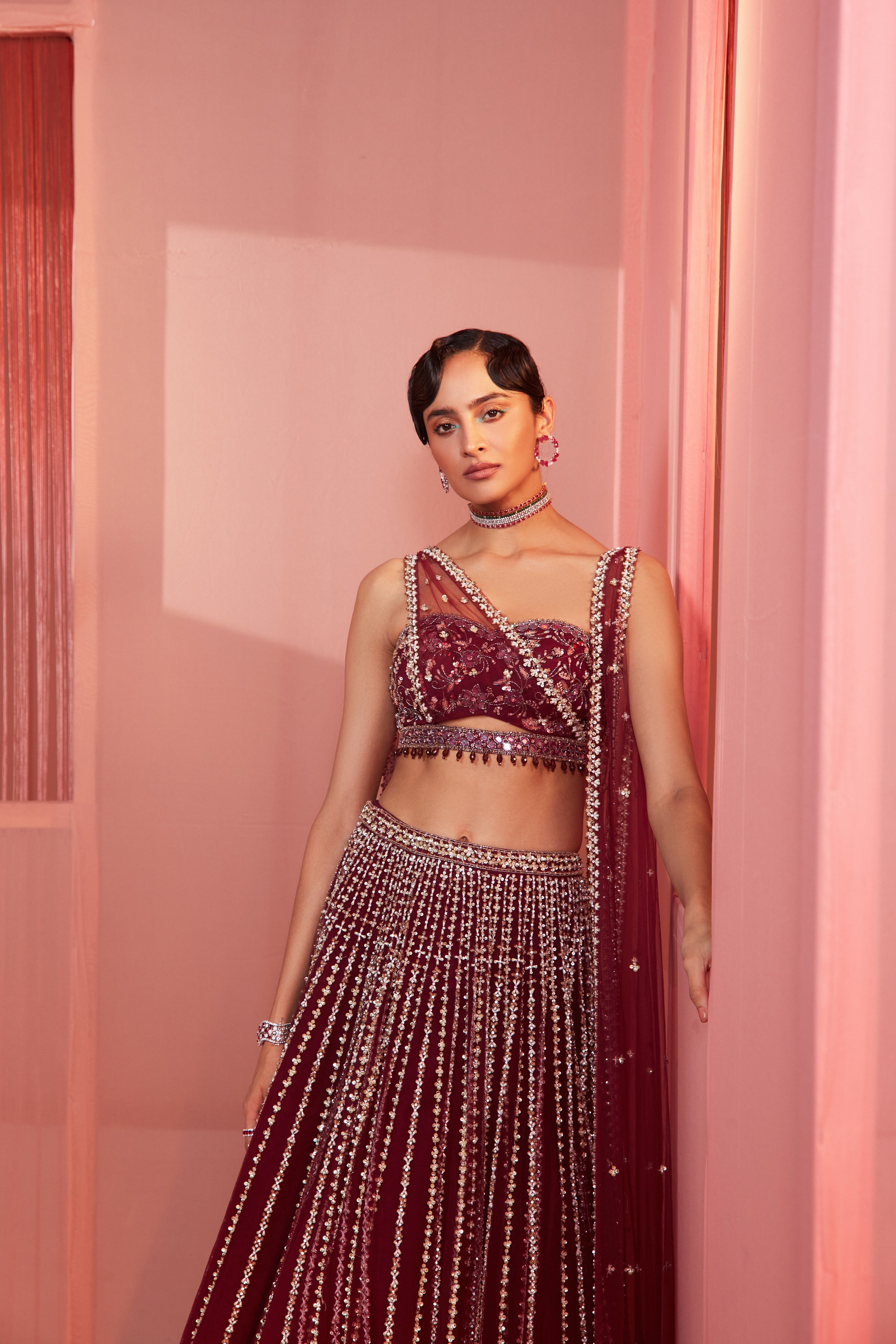 Plum embroidered lehenga and blouse with double dupatta