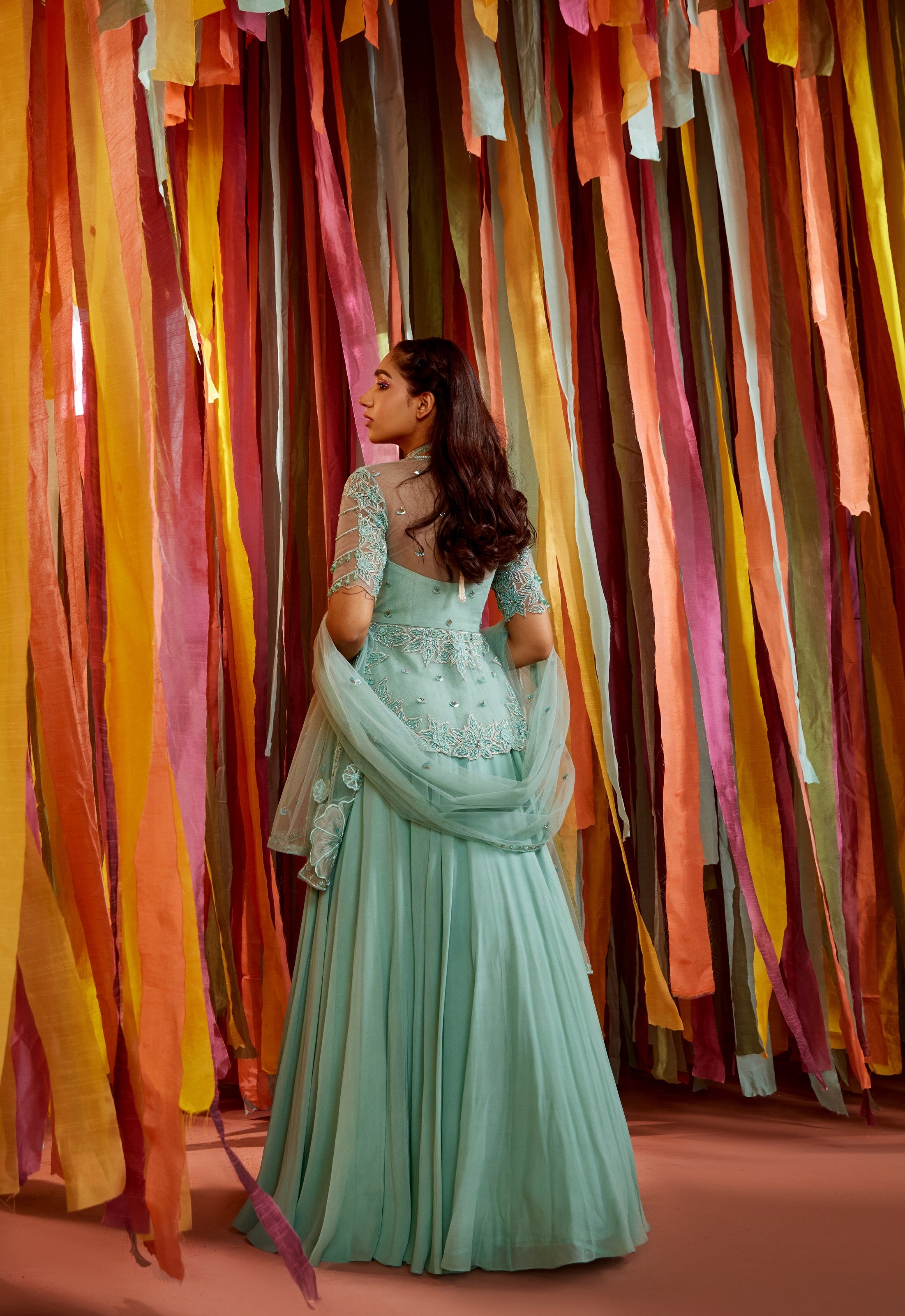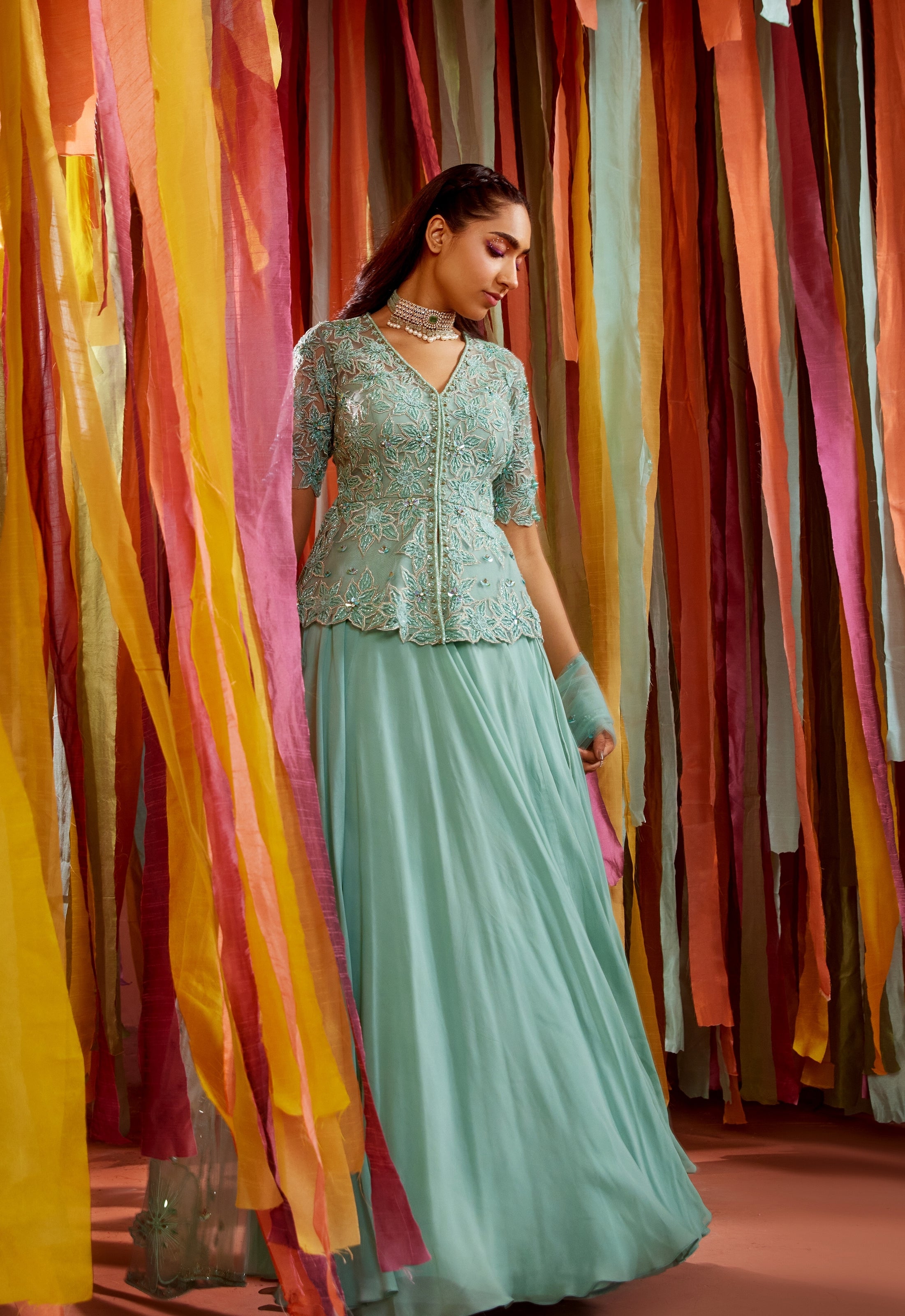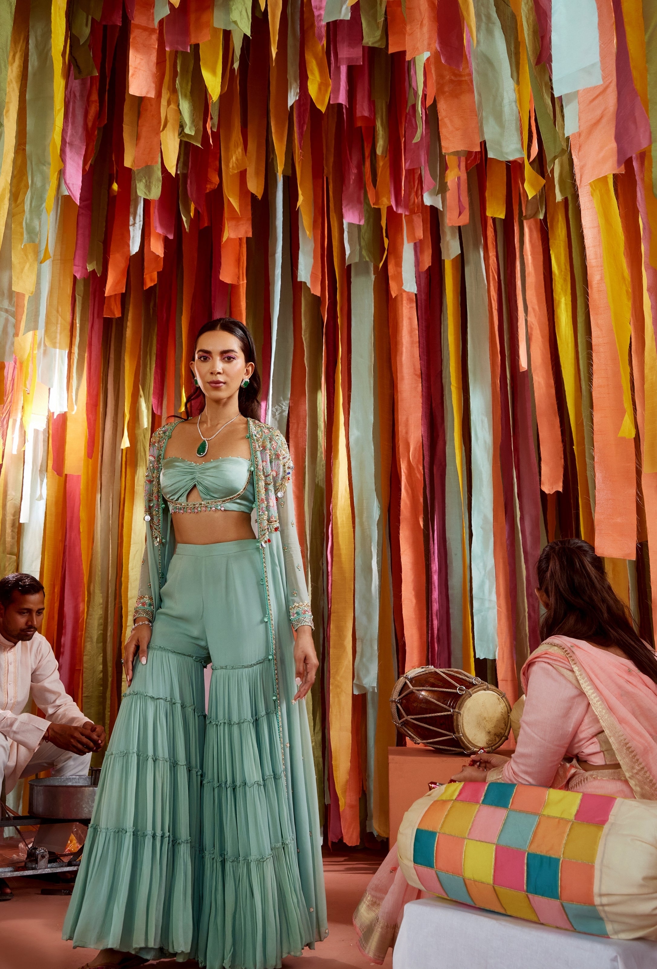 Mint green cape and sharara set with cut-out bustier