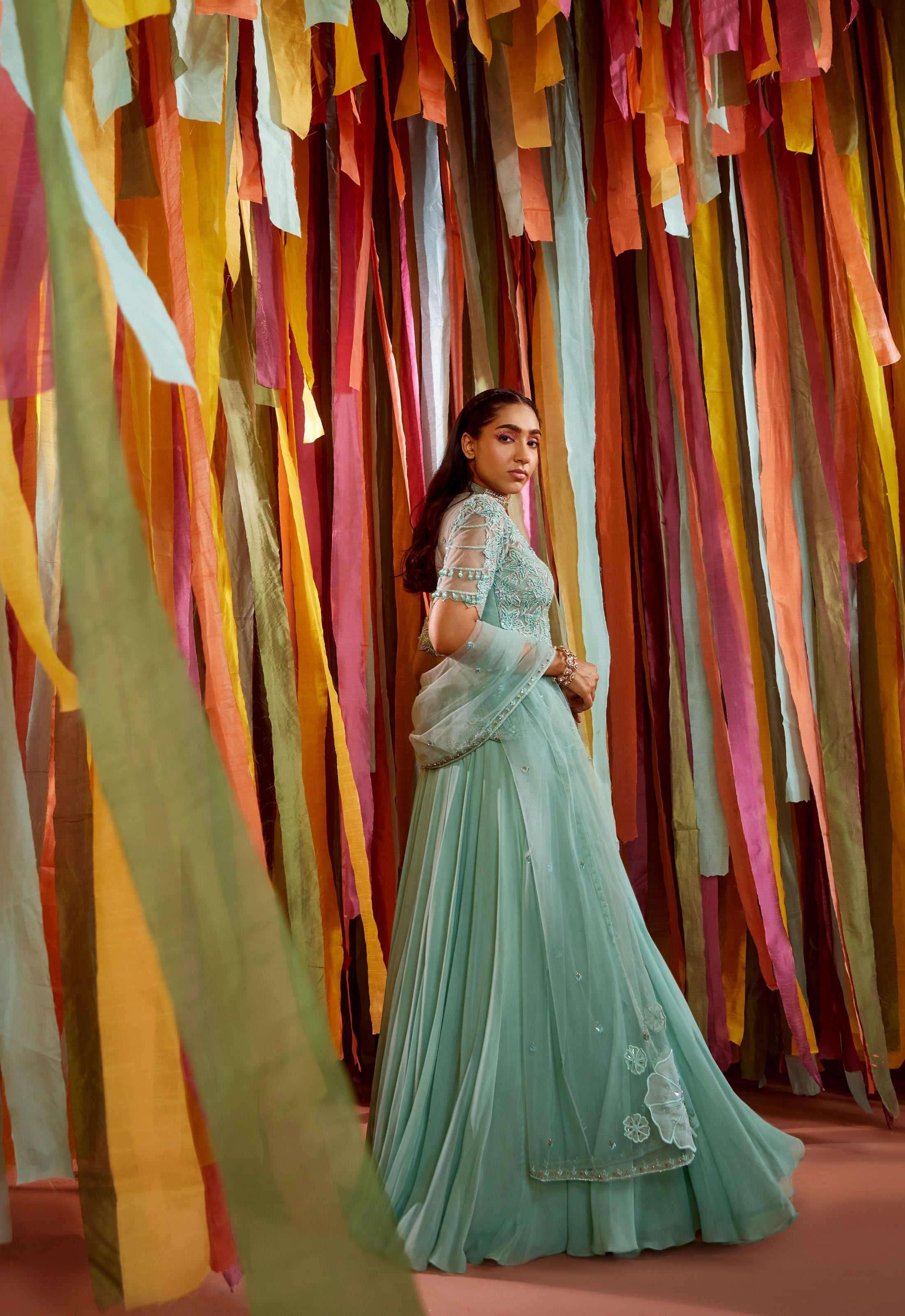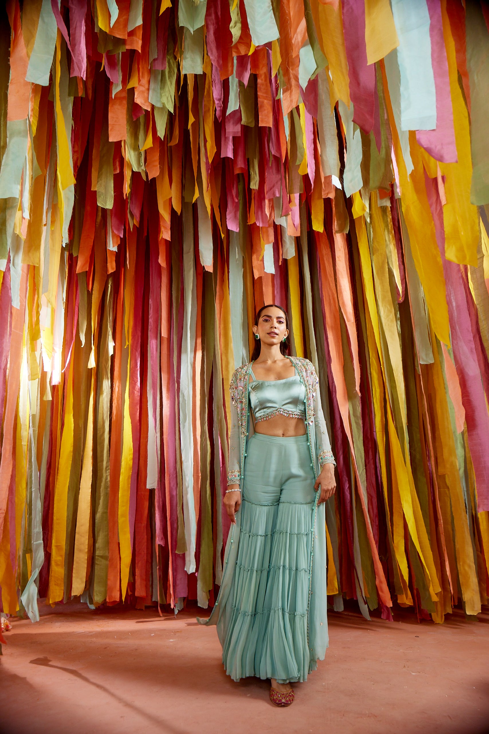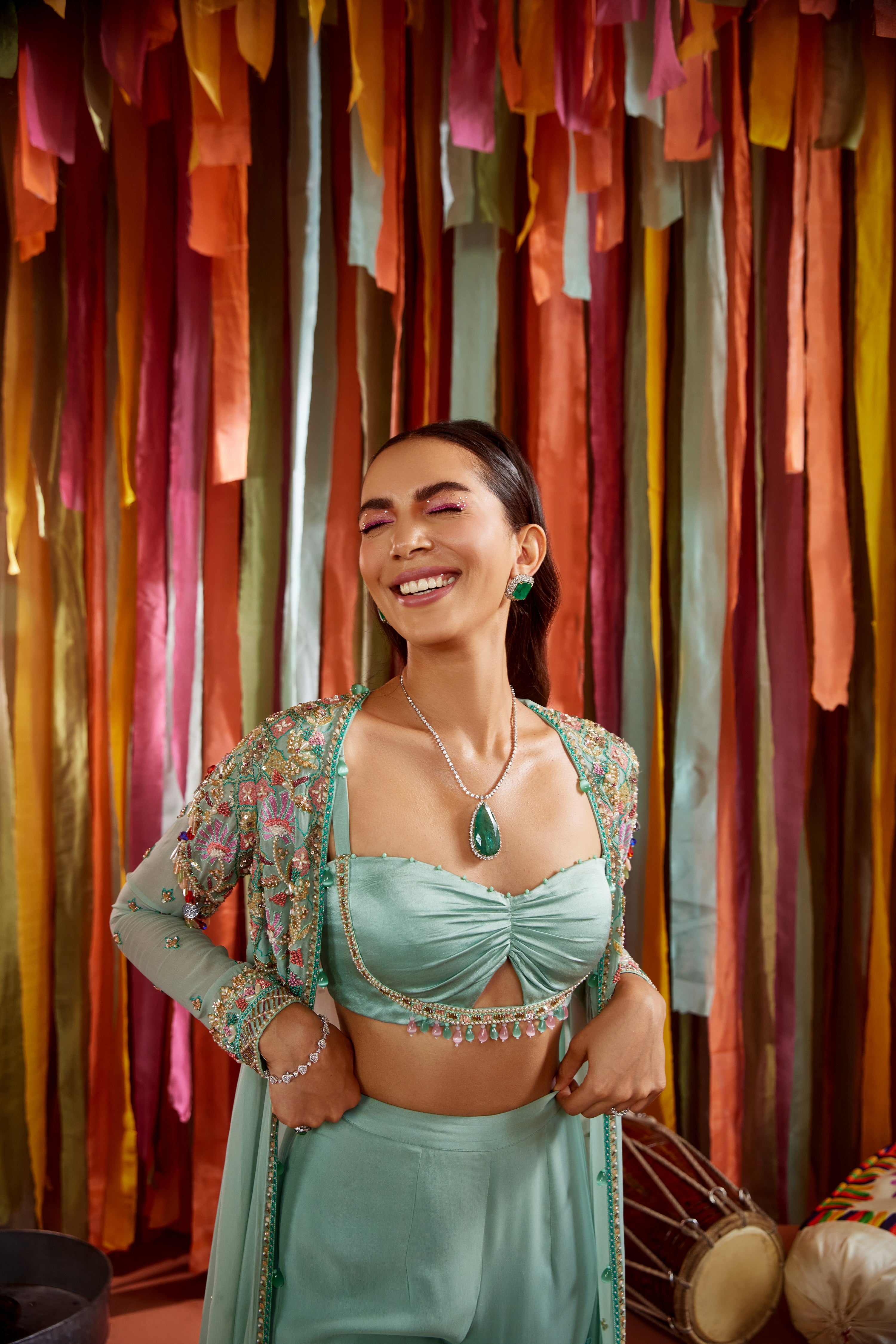 Mint green cape and sharara set with cut-out bustier