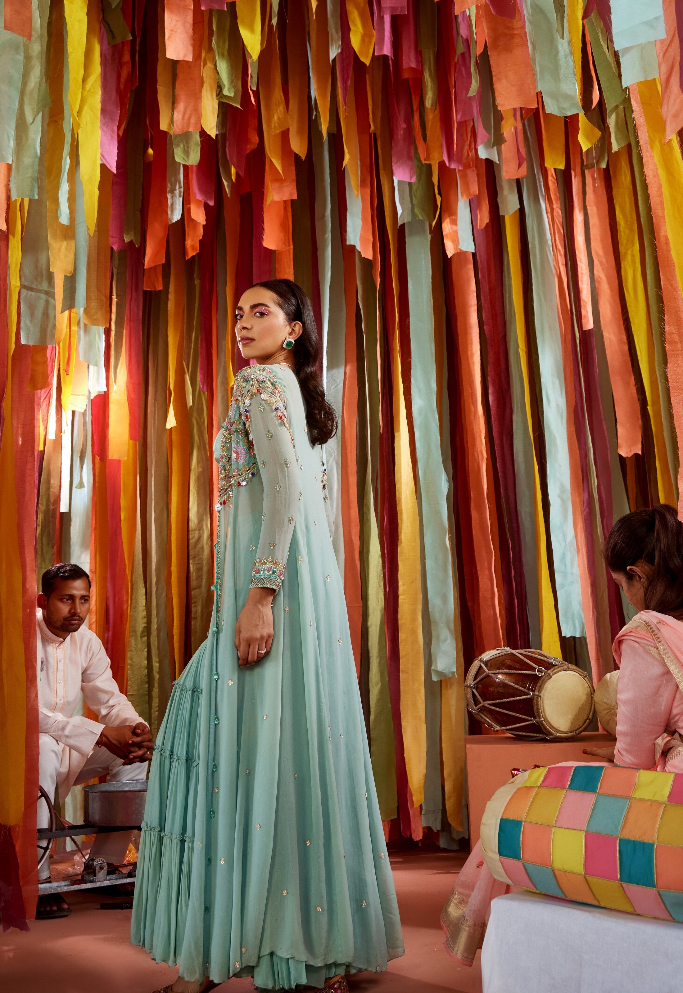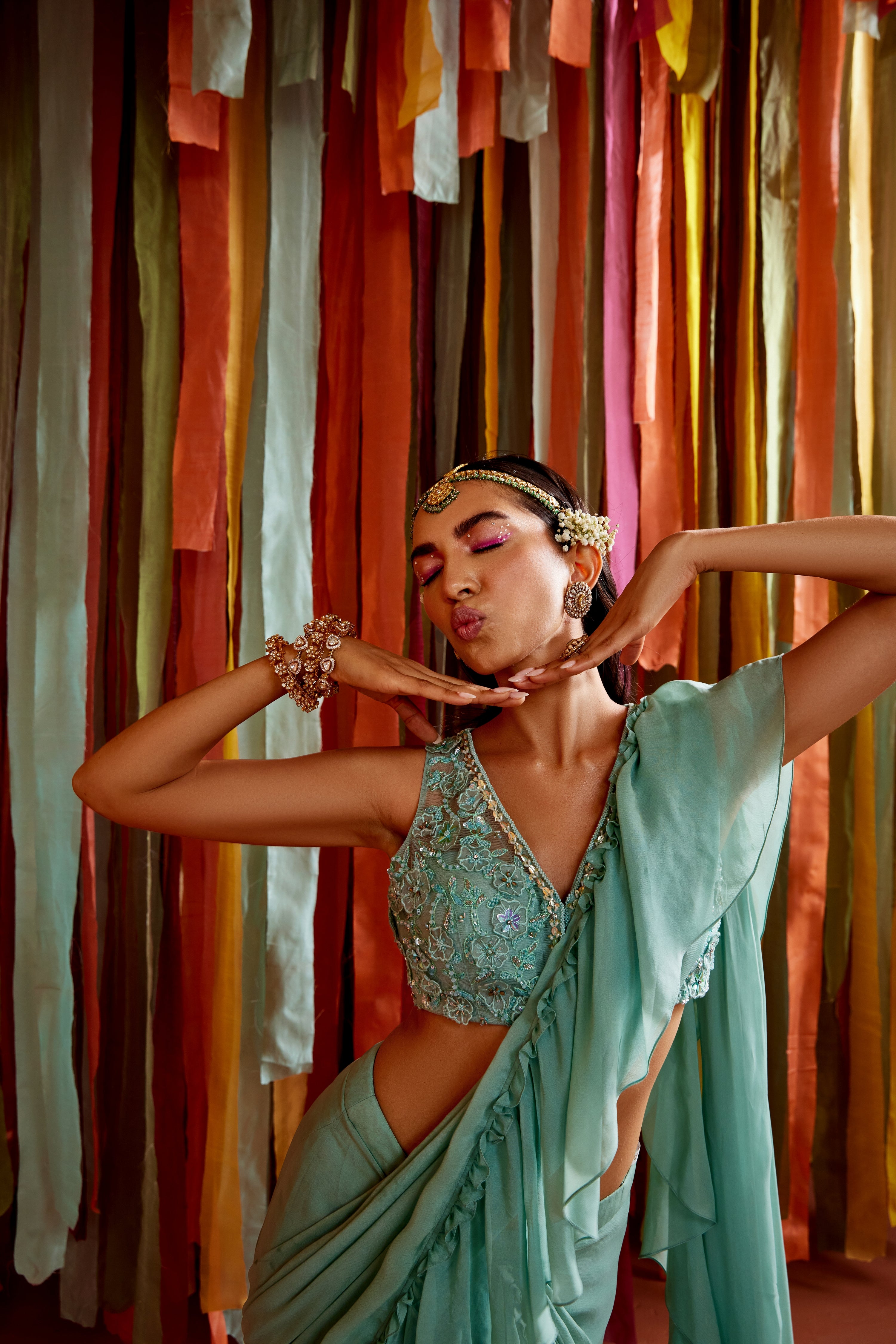 Mint green tiered ruffle saree