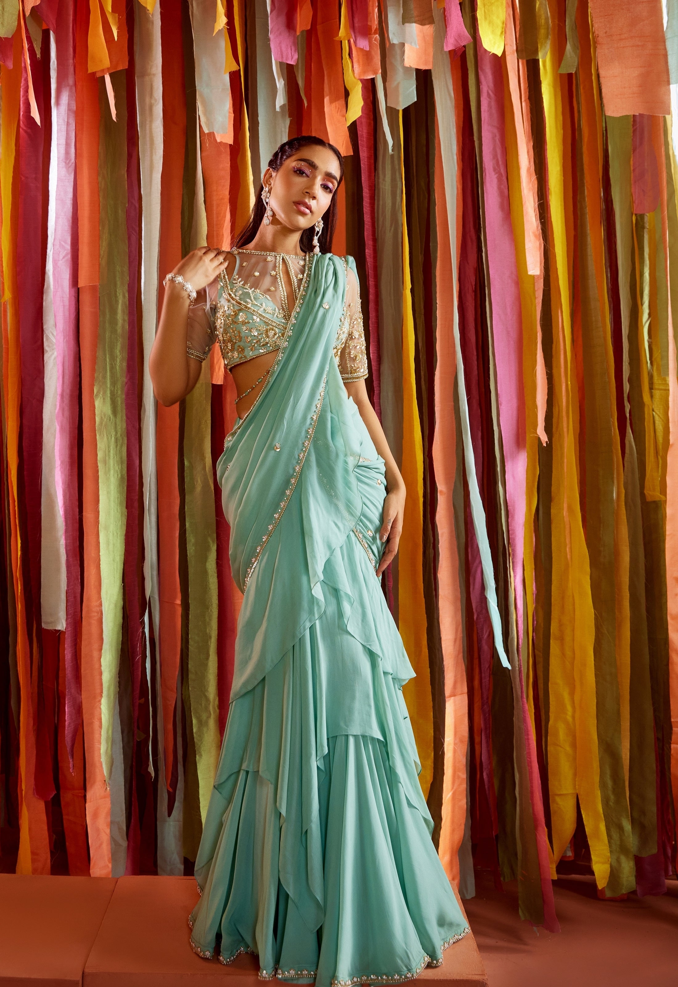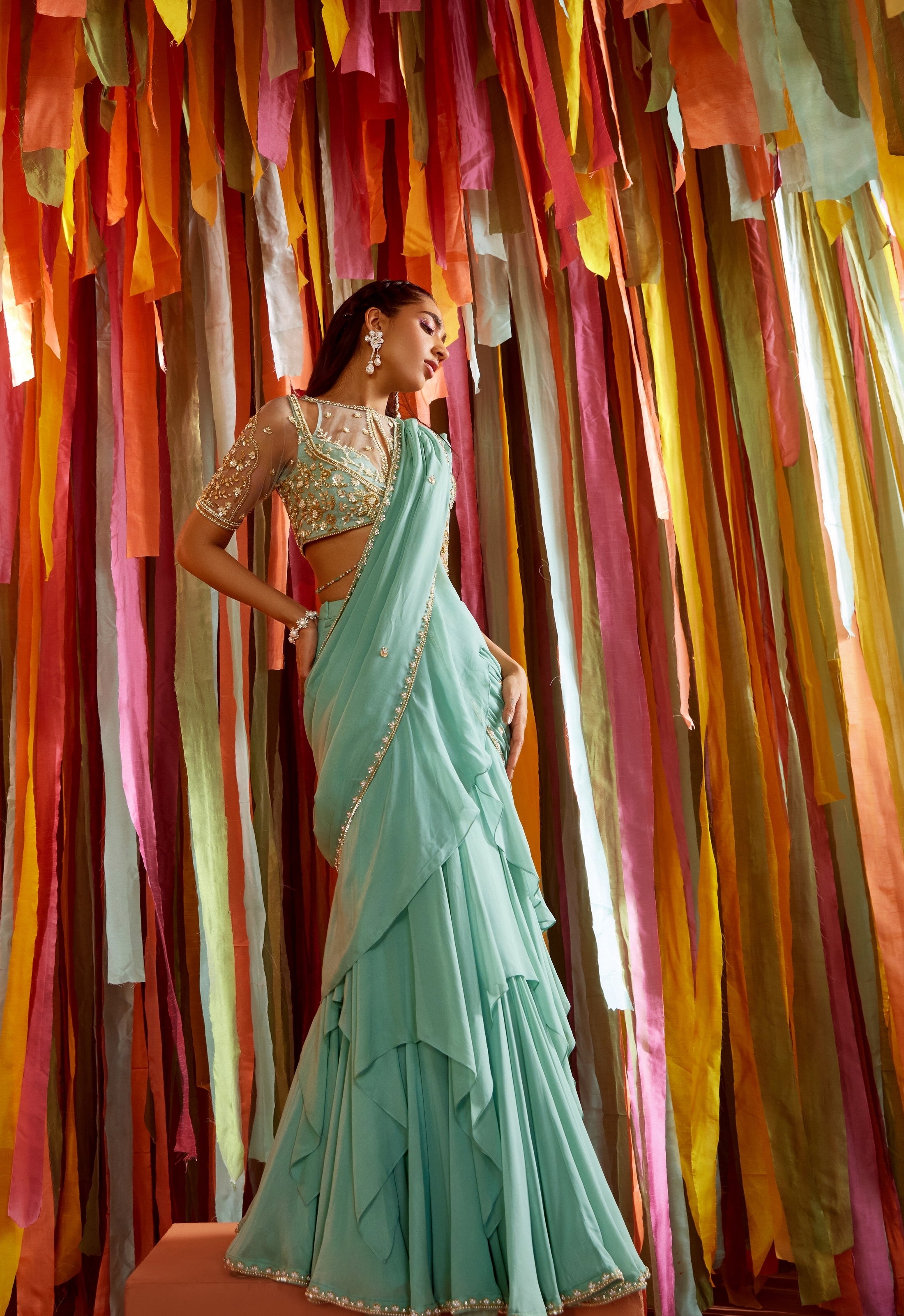 Mint green ruffle saree