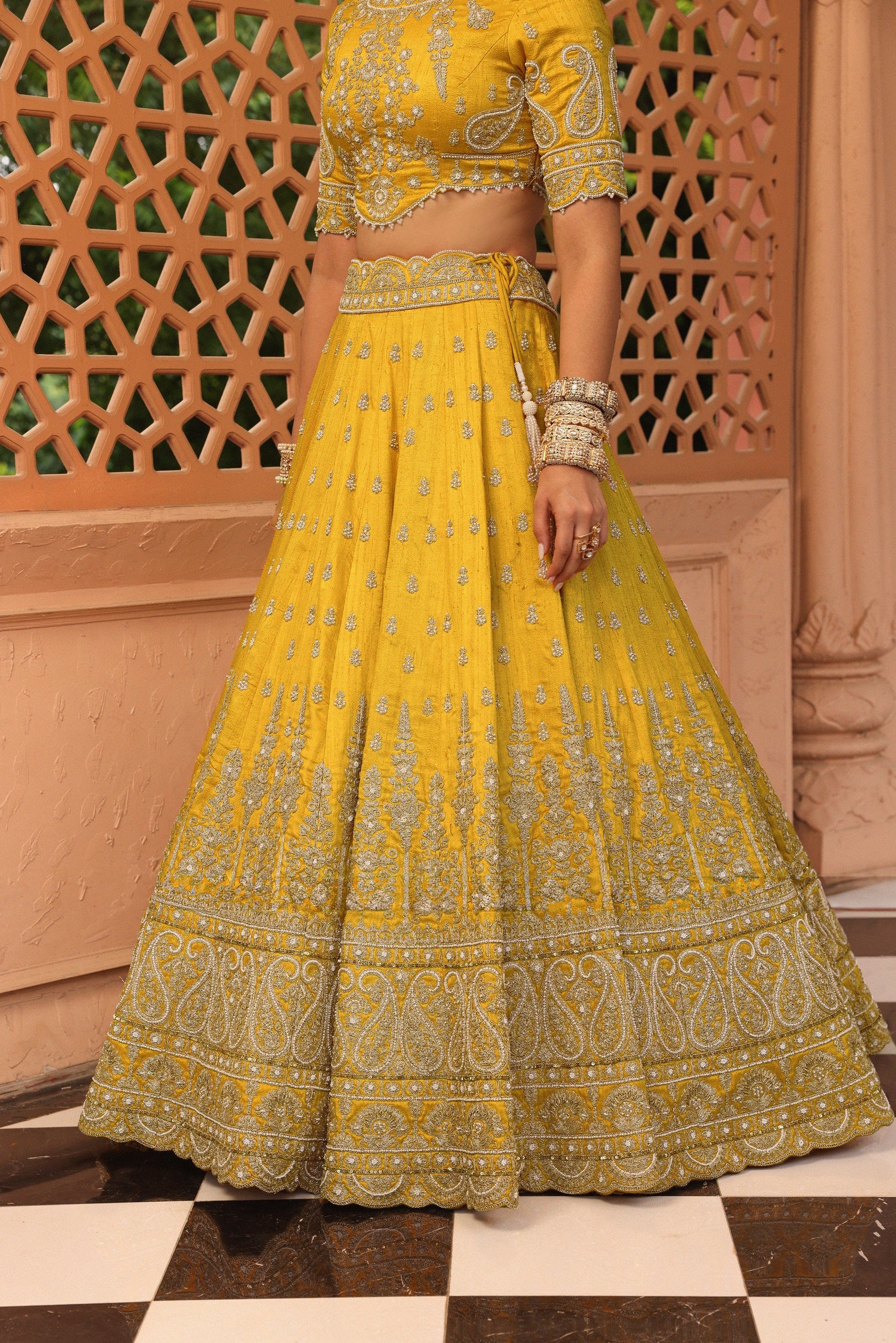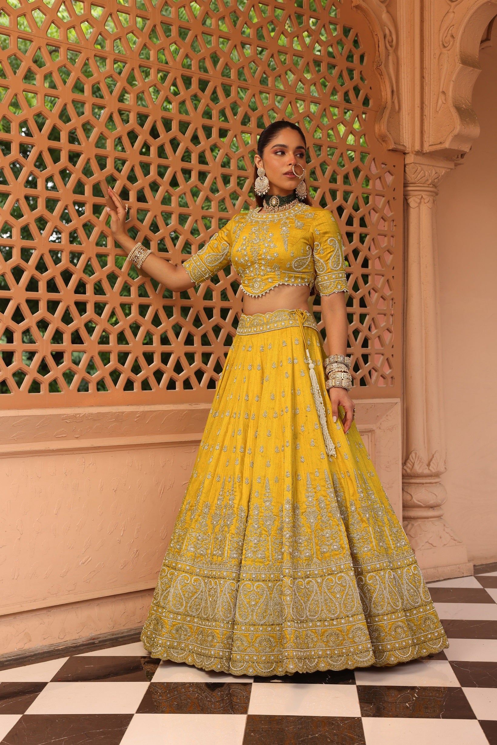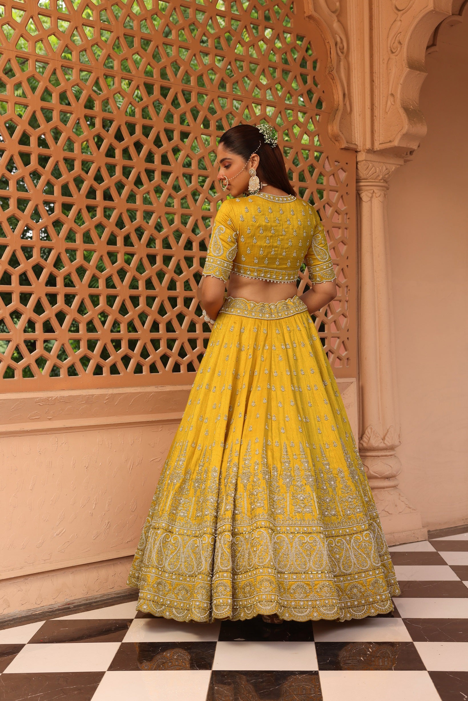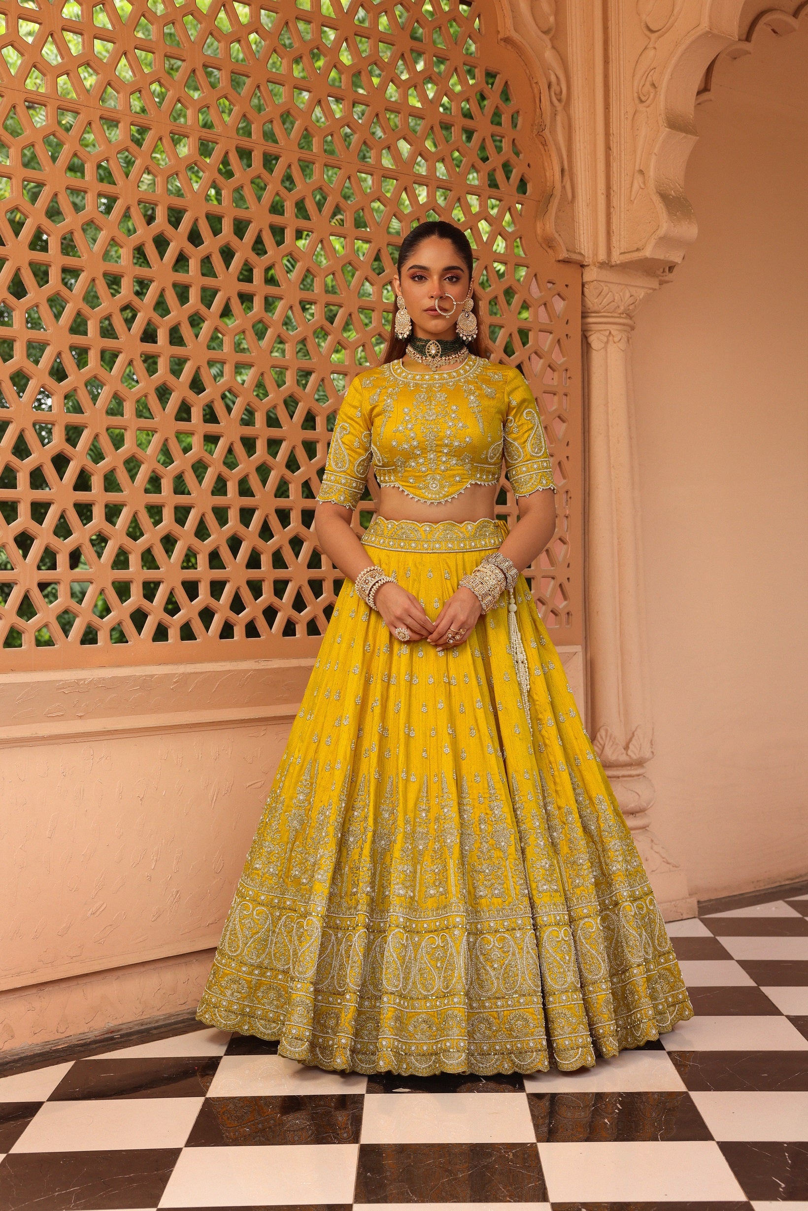 The Mazhum Lehenga from our collection is crafted from pure silk, adorned with exquisite kirandori embroidery highlighted with dabka zardozi and pearls. The blouse features a wide, deep V-neck at the front and a plunging back. The dupatta is made from silk organza, showcasing an embroidered border and delicate pearl bootis in the center.