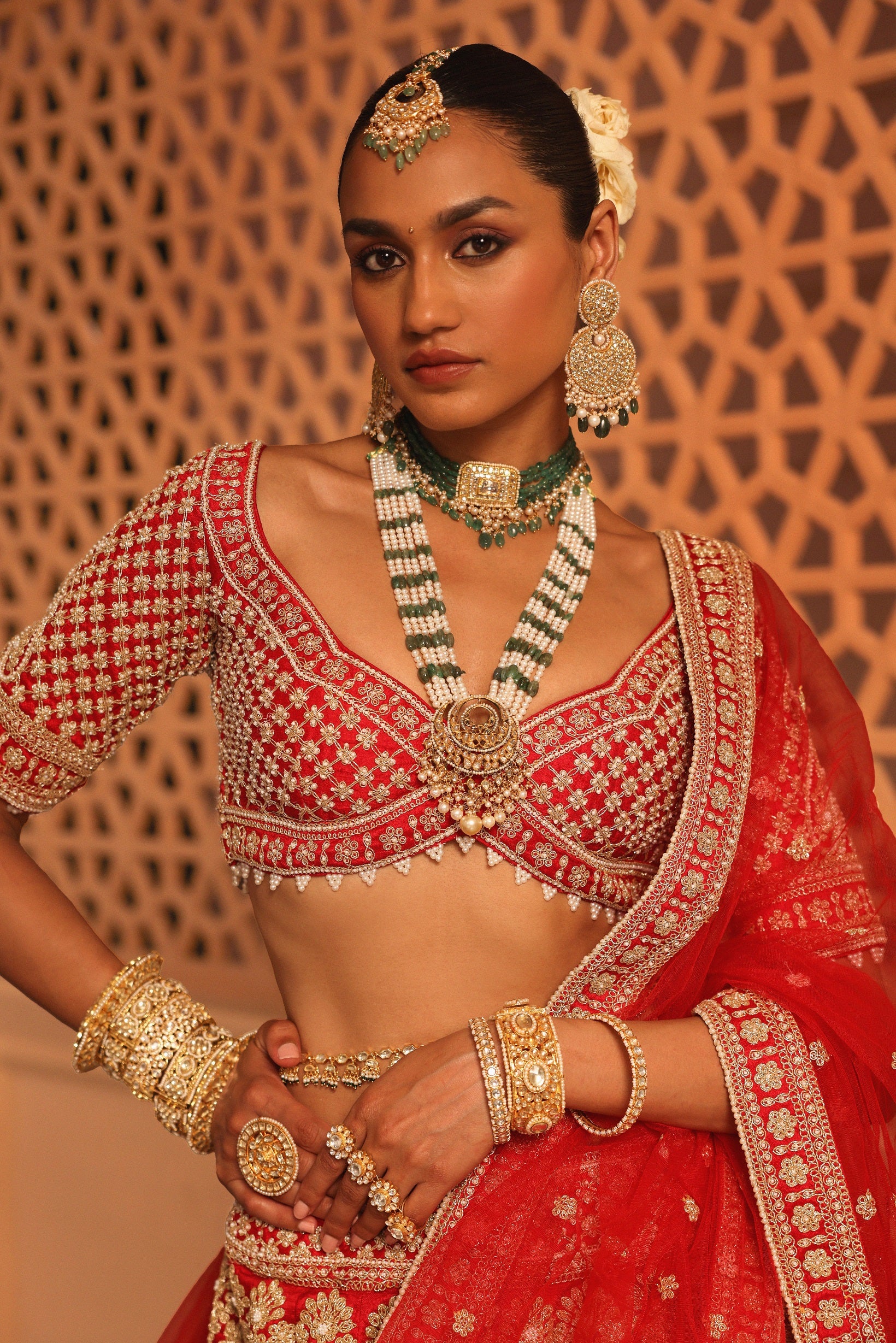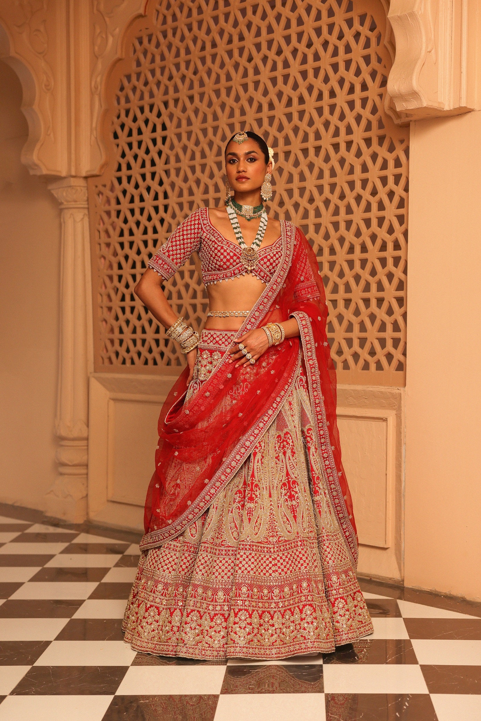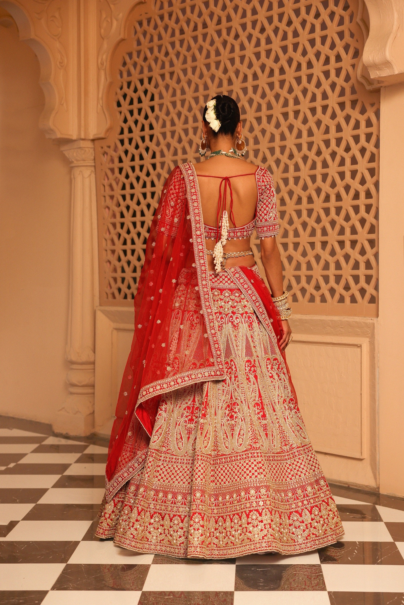 The Naazreen lehenga from our Noorjahaan collection is crafted from pure silk, embellished with intricate Kirandori embroidery and accented with dabka zardozi and pearls. Featuring stunning paisley and floral designs, the lehenga boasts a beautifully tailored blouse with a sweetheart neckline in the front, a deep back, and elegant elbow-length sleeves. Pearls add a lovely finish to the lehenga. The accompanying dupatta showcases an embroidered border adorned with heavy bootis. The blouse style can be modified to fit your preferences with no additional charges.