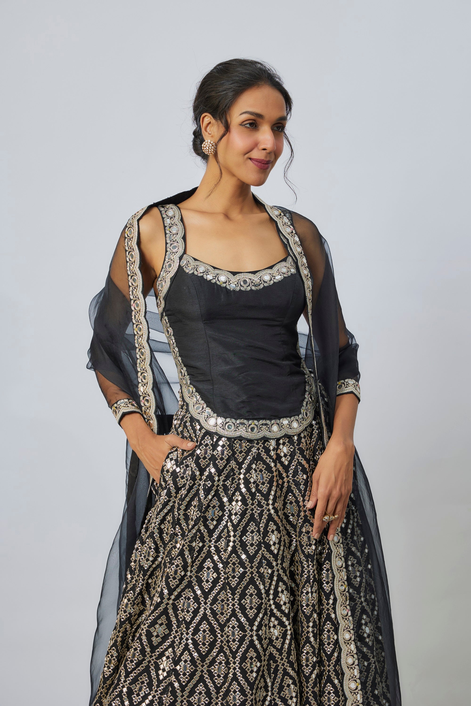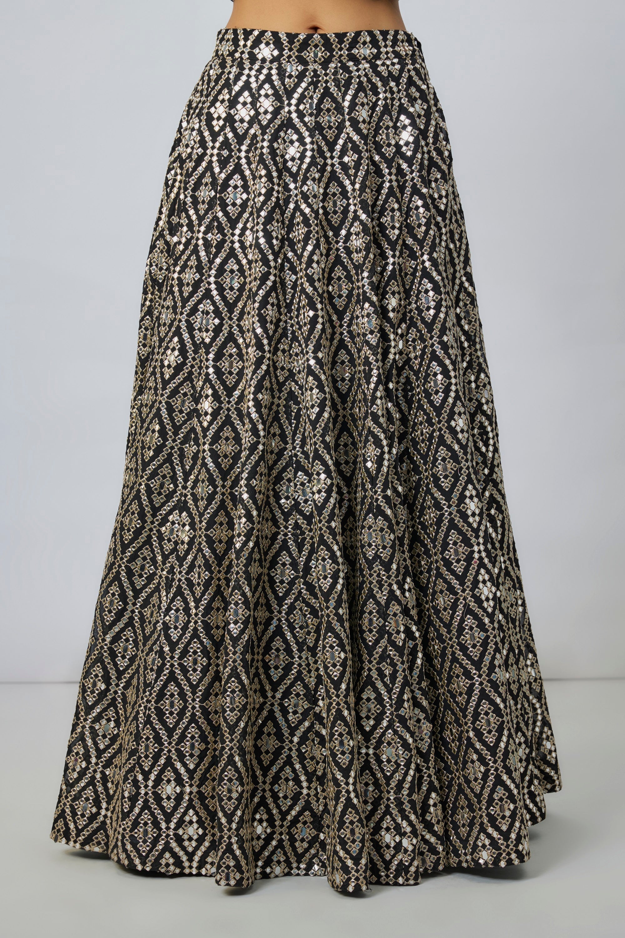Featuring Blouse With Intricate Embroidery Along The Neckline And Straps. Paired With It Is A Voluminous Lehenga Adorned With Mirror Work And Geometric Patterns, Creating A Striking Visual Impact. The Look Is Completed With A Net Dupatta, Subtly Embellished With Accents For A Graceful Touch.
