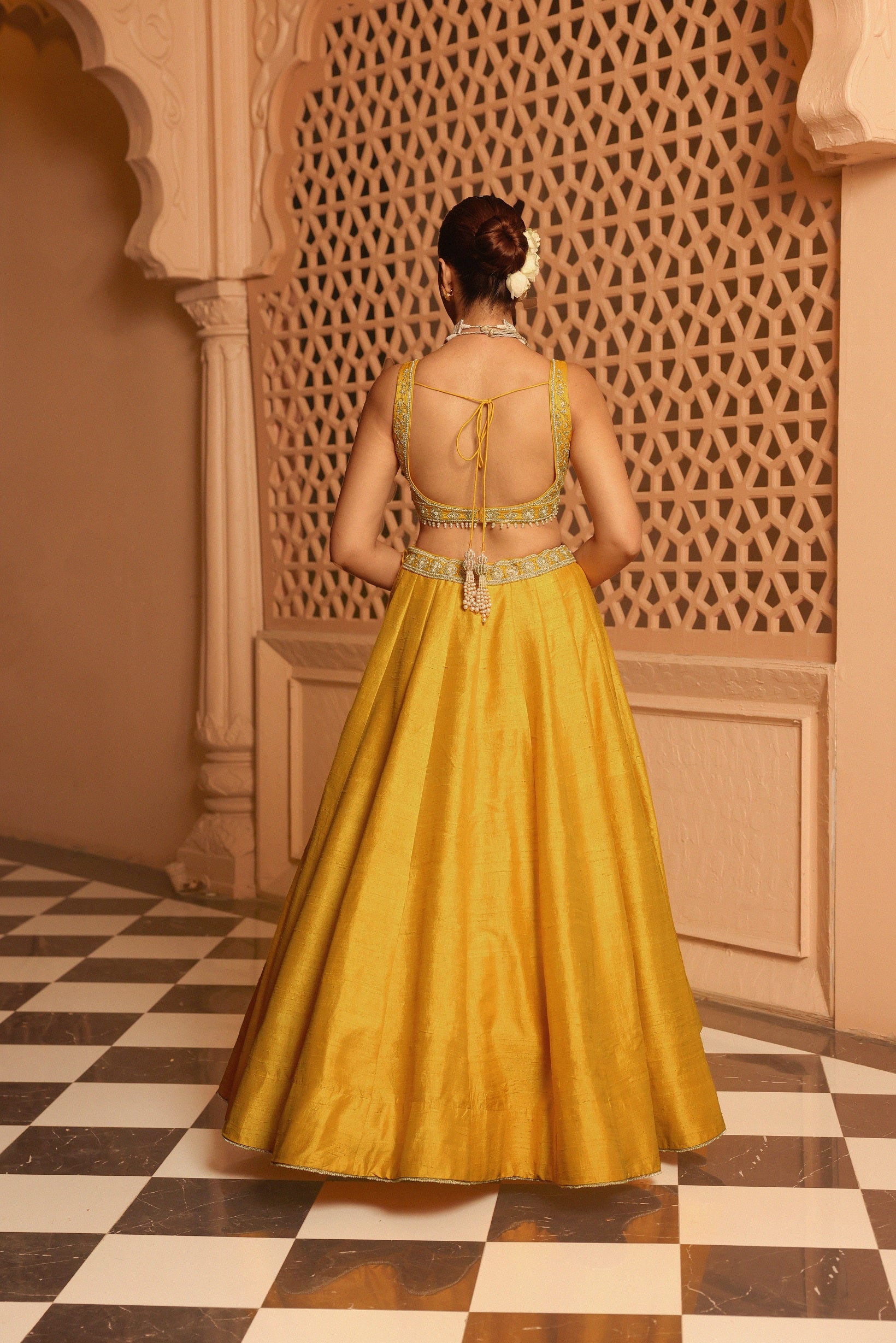 | The Uzma lehenga from our collection is crafted from pure silk and embellished with intricate Kirandori embroidery, enhanced by delicate dabka zardozi and pearls. Featuring exquisite floral motifs, the design is truly stunning. The blouse showcases a zero neckline and elegant elbow sleeves. The lehenga is elegantly completed with hanging pearls. The dupatta is adorned with an embroidered border and finished off with pearl detailing. |