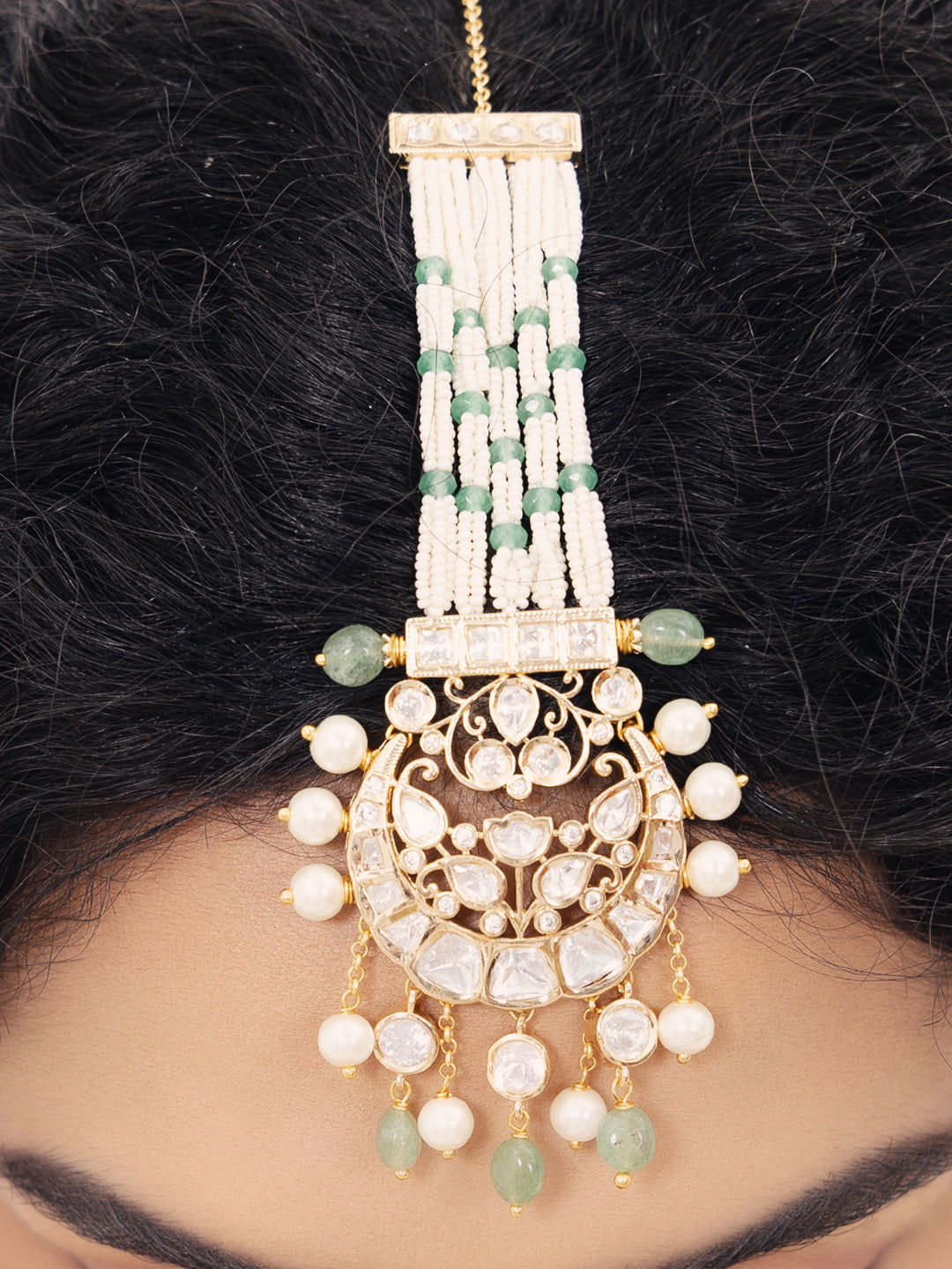 A radiant maang tikka adorned with polki pearls, white, and green stones.