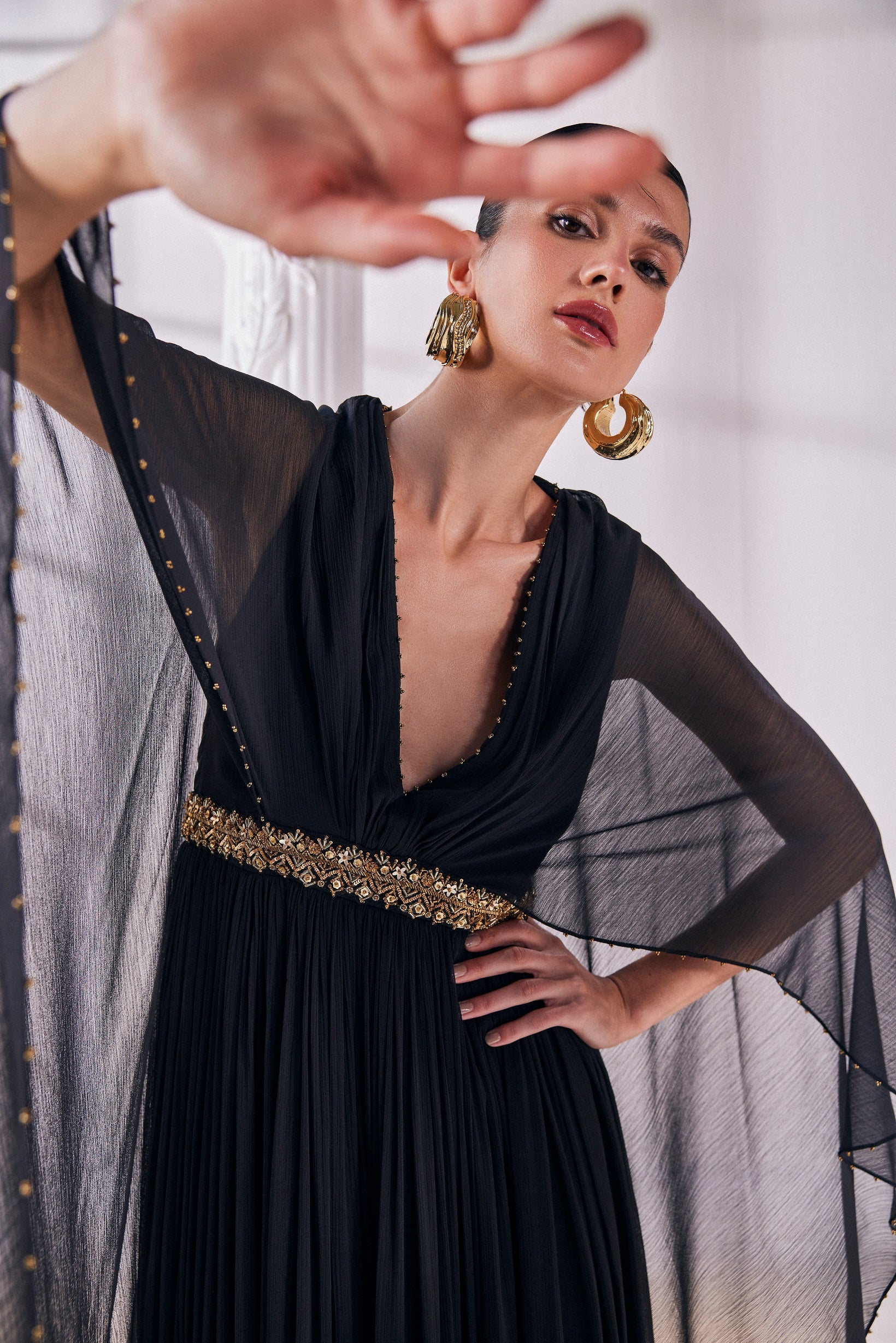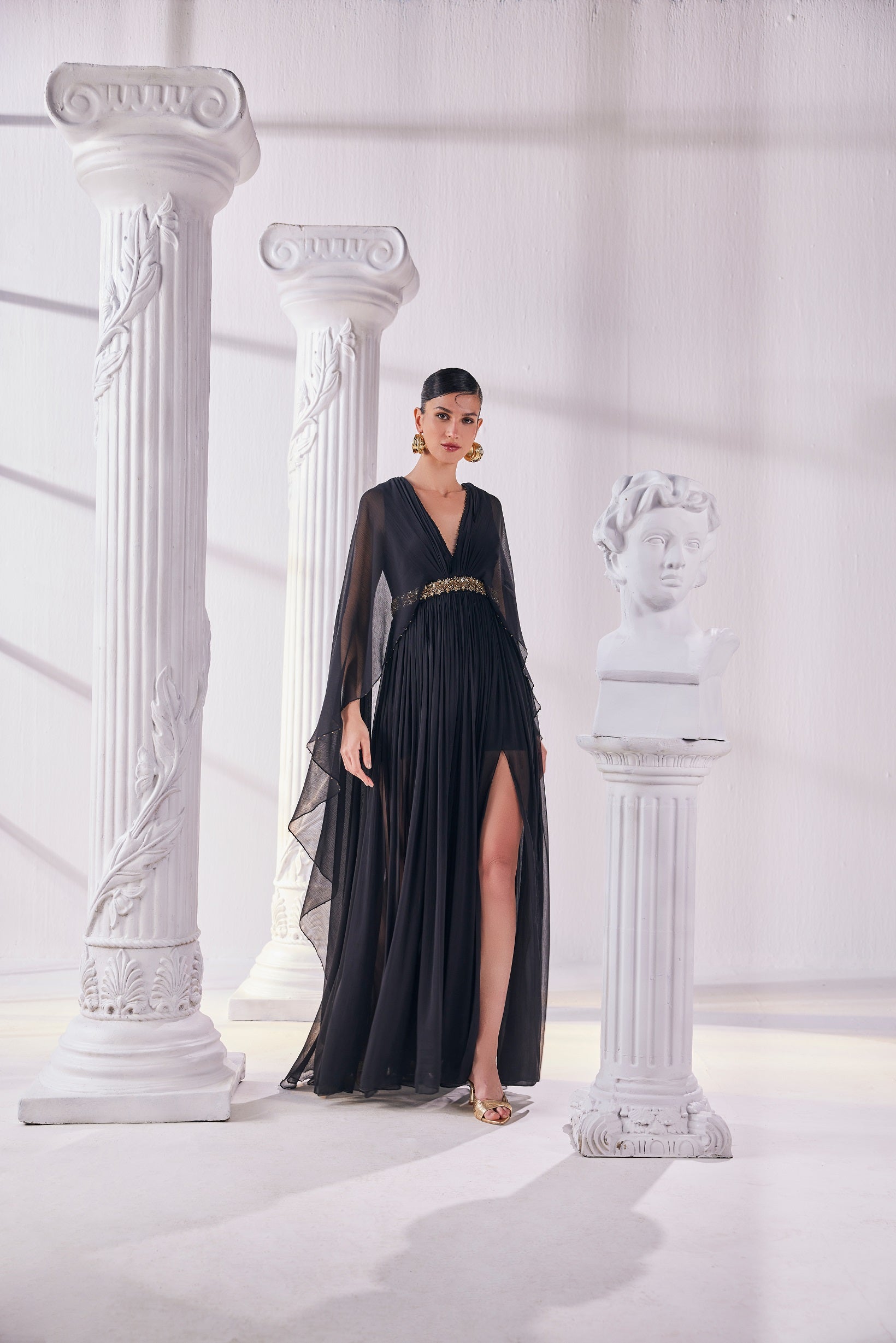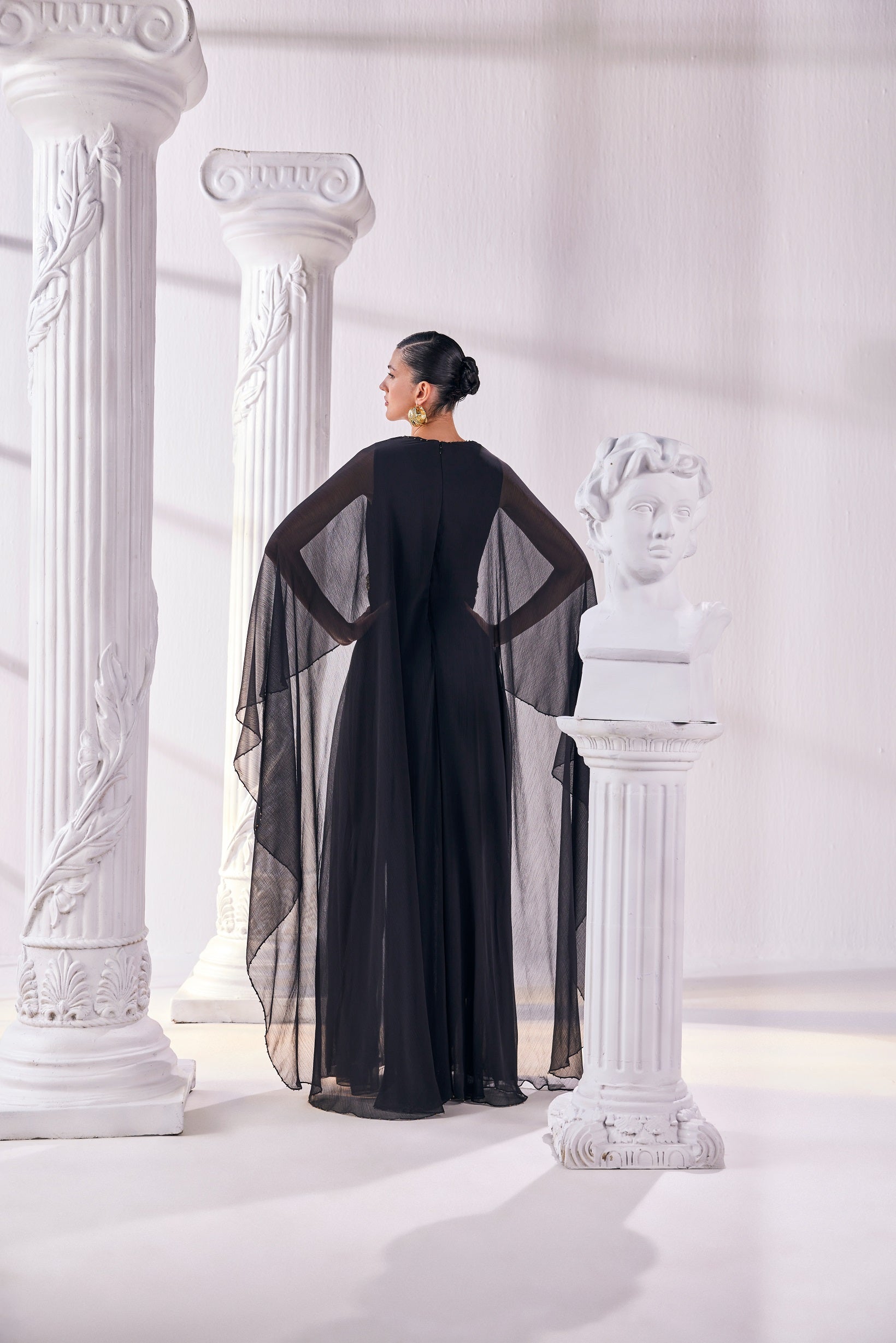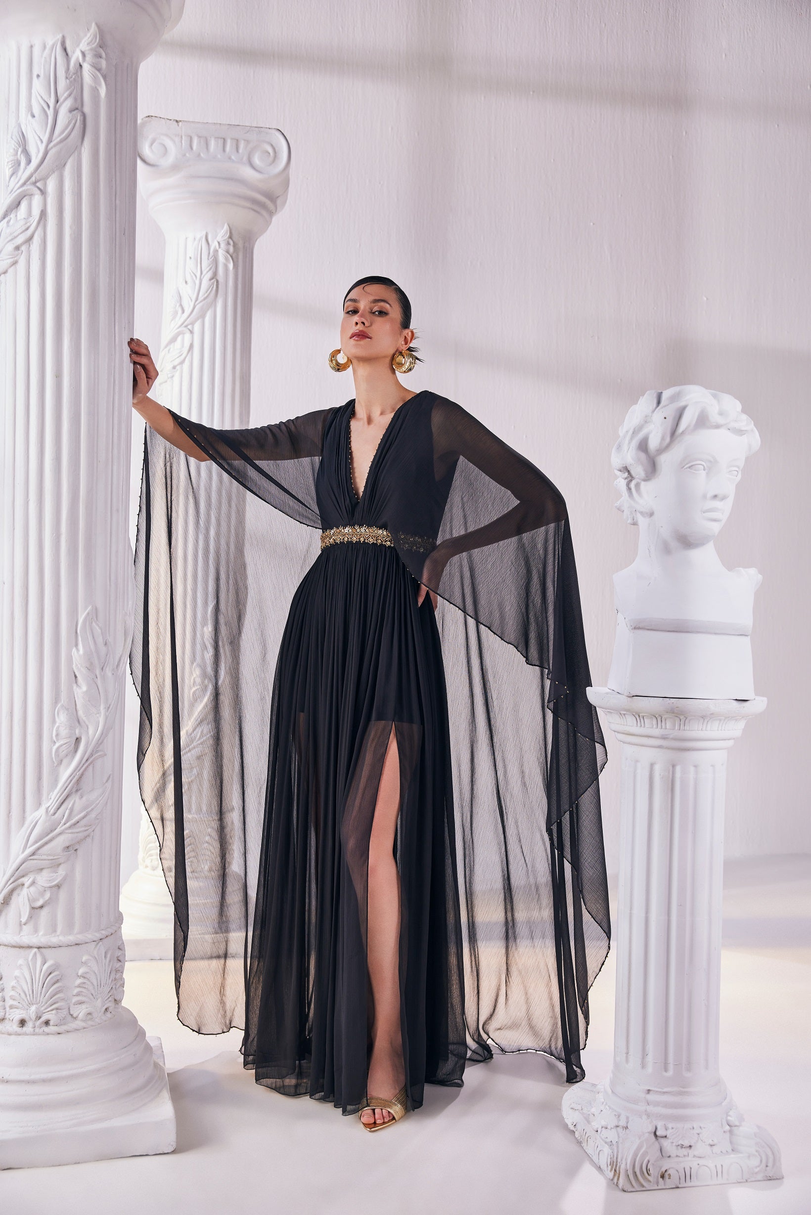 | Stylized kaftan made of black chiffon with an embroidered waist detail maintaining the essense of a silhoutte.It offers a graceful drape and a breathable feel |