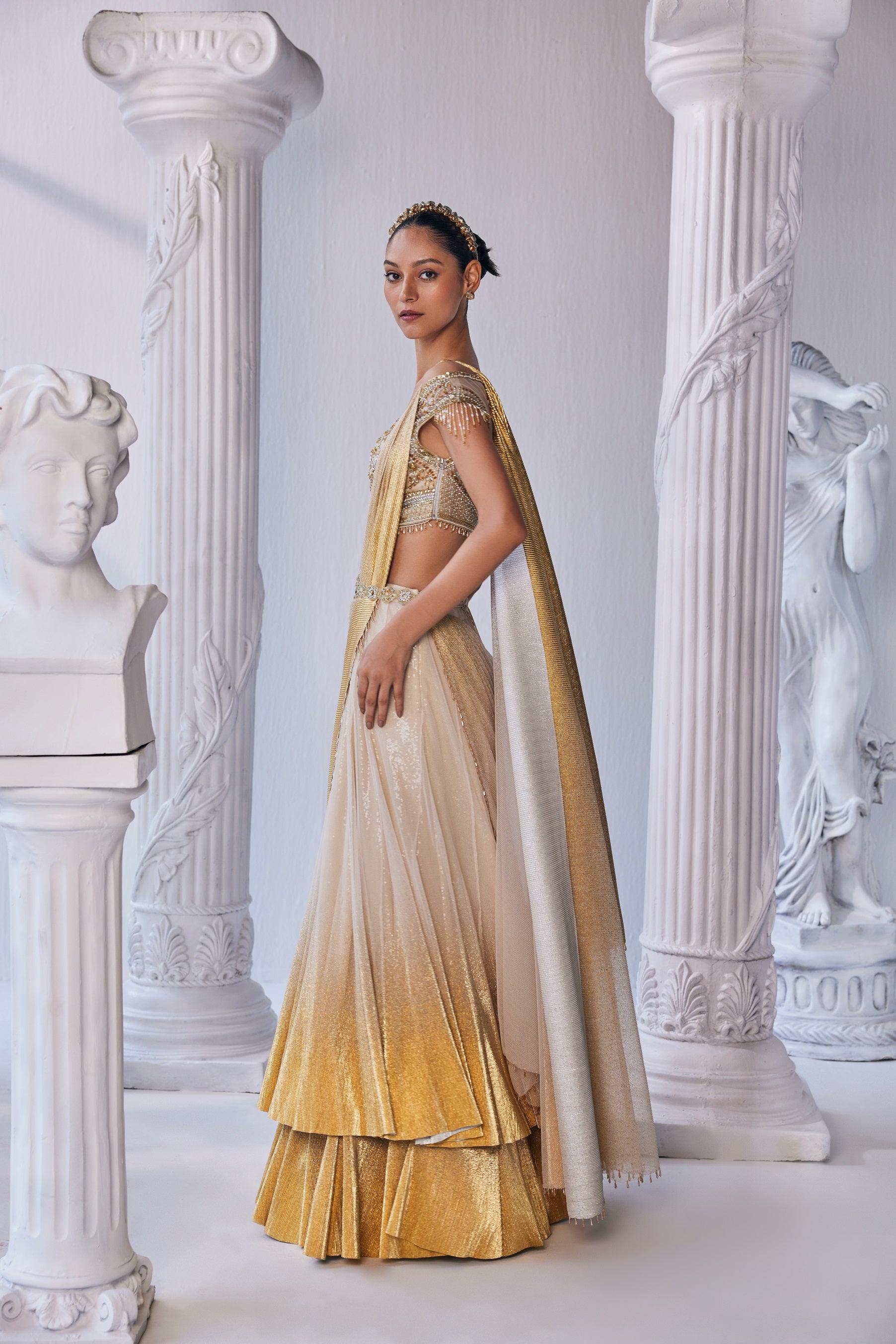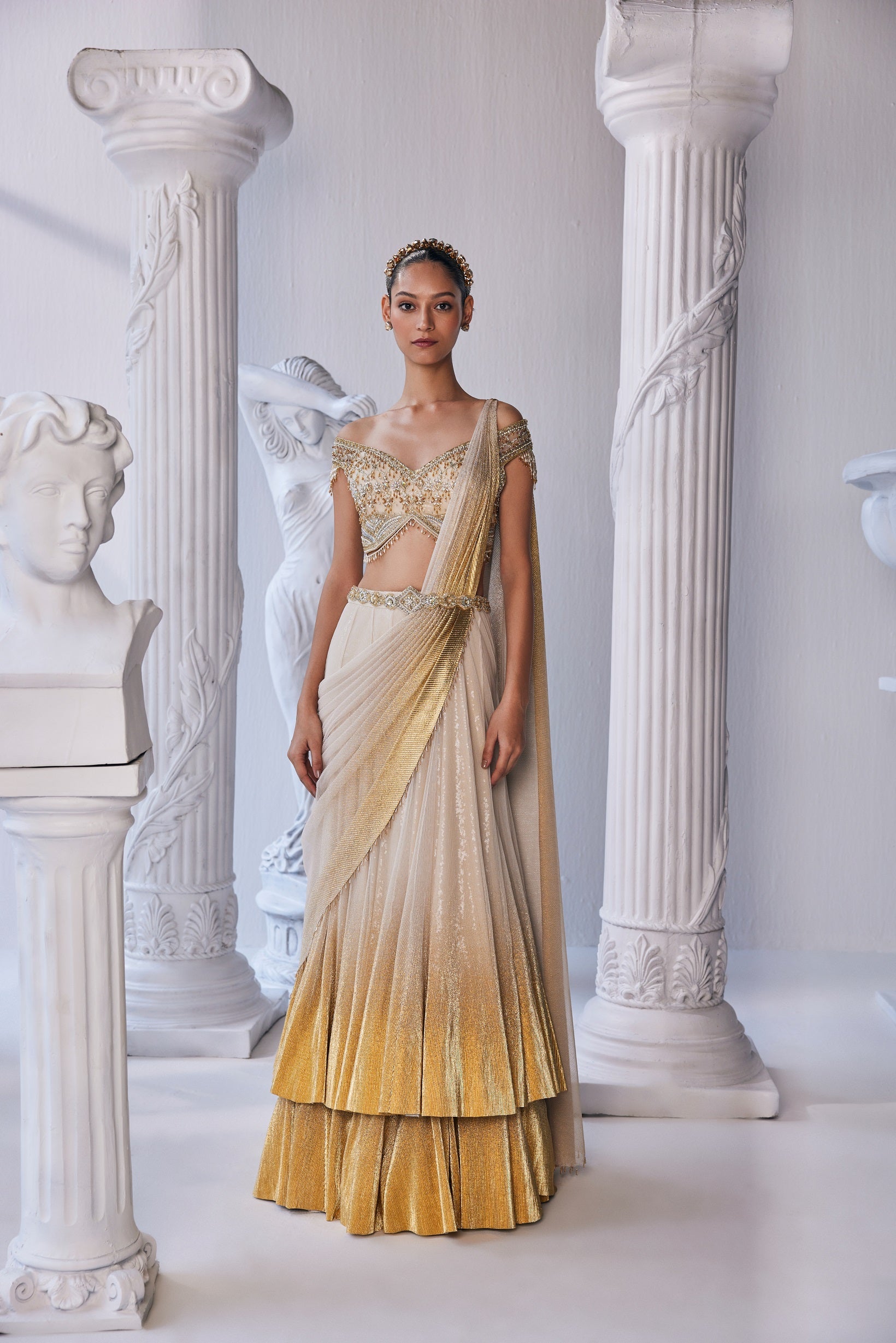 Draped double layer lehenga in pleated gold foil lycra