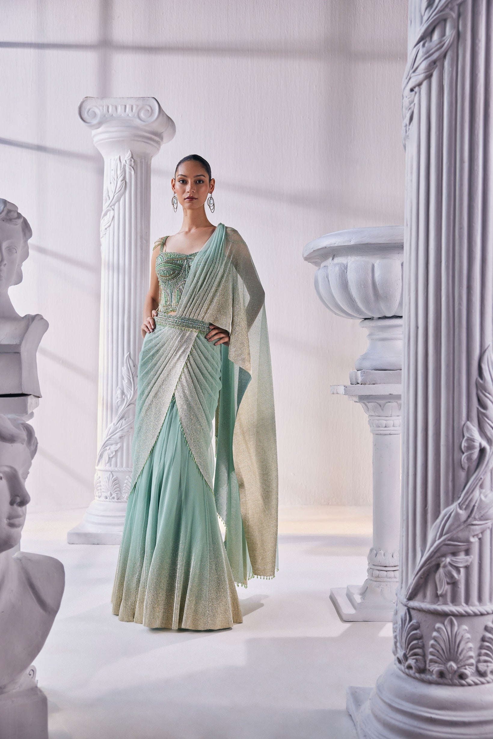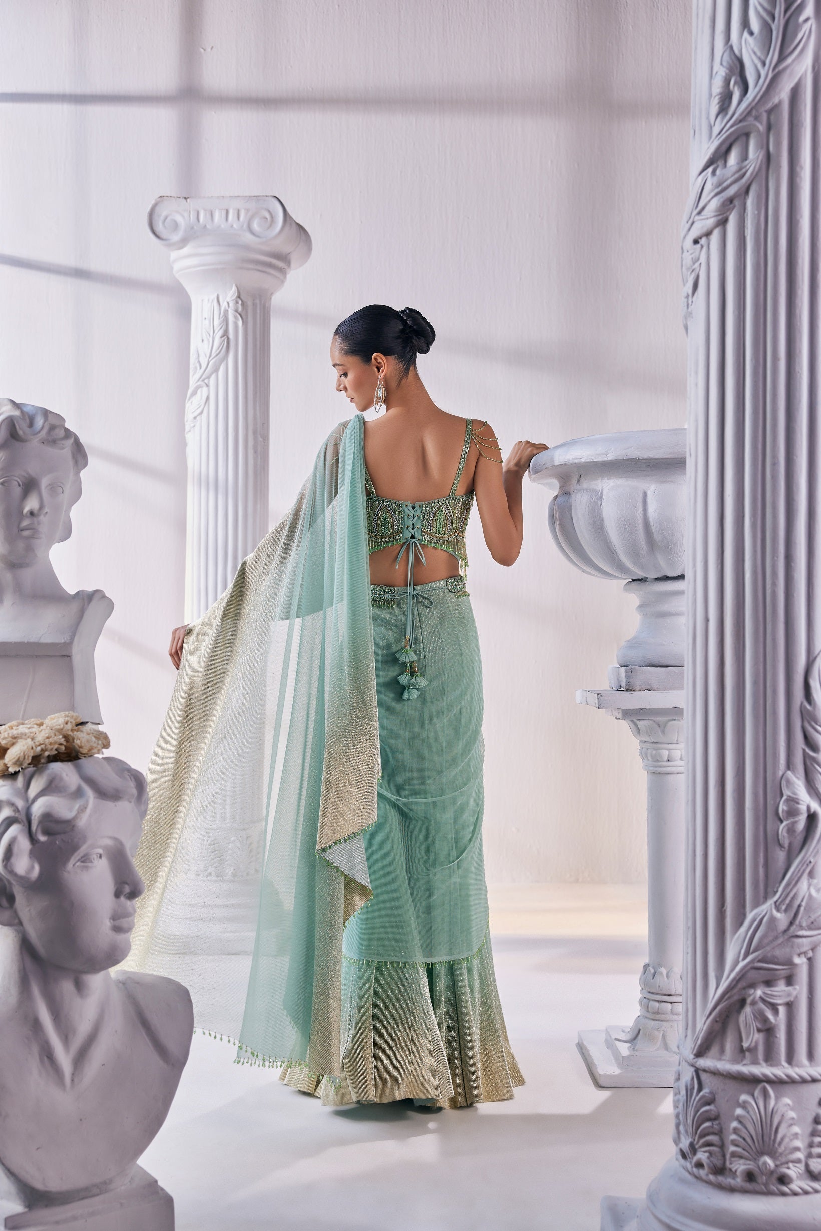 | This exquisite draped layer lehenga, adorned in shimmering sequins and pleated gold foil lycra. The intricately designed corset steals the spotlight with its opulent heavy beadwork, delicate tassels and intricate zardozi embellishments. |