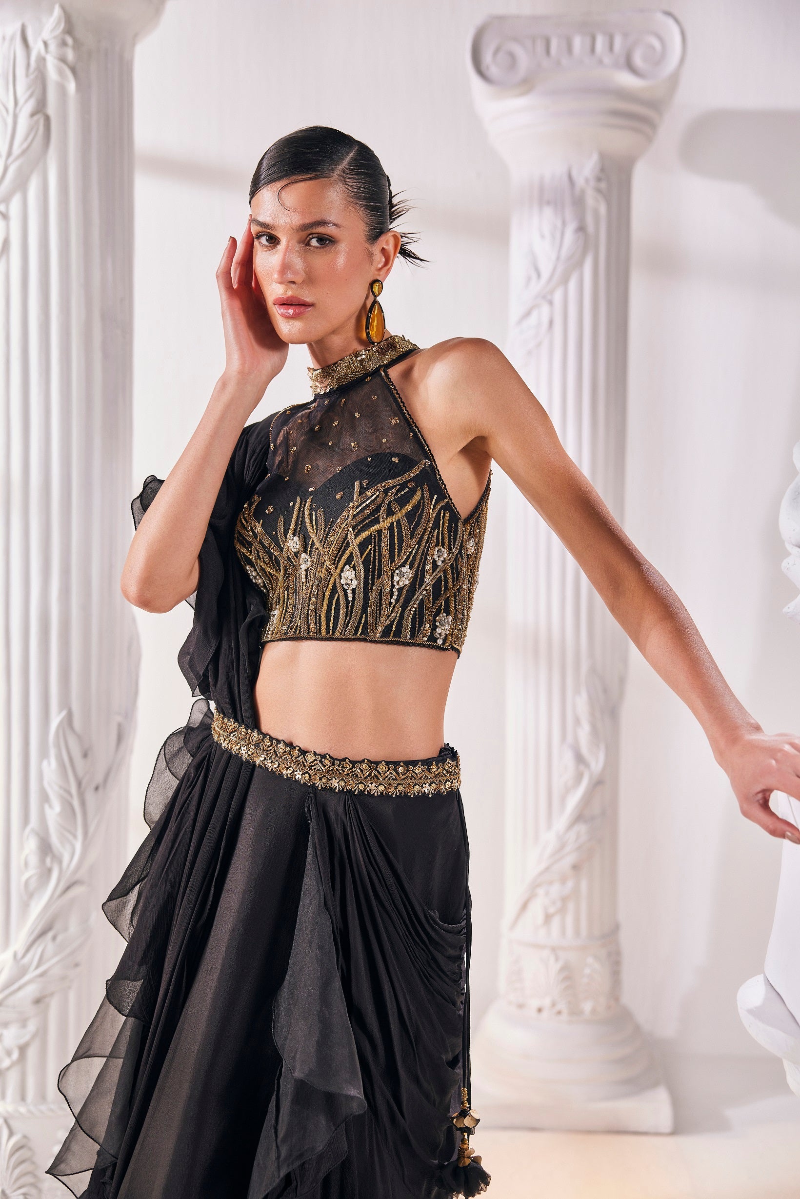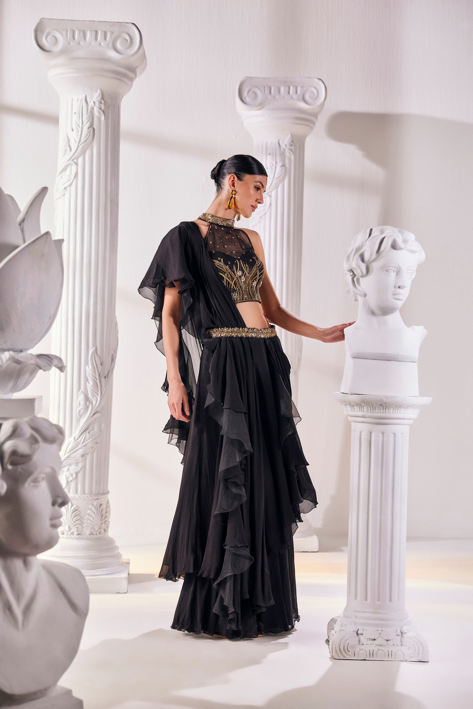 paired with an embroidered organza blouse and a belt. Chiffon drape saree ensemble, featuring an embroidered organza blouse and an elegant belt. Draped in chiffon, it exudes effortless grace, while the intricate embroidery on the organza blouse adds a touch of luxury. Complete with a chic belt to accentuate the waistline. |