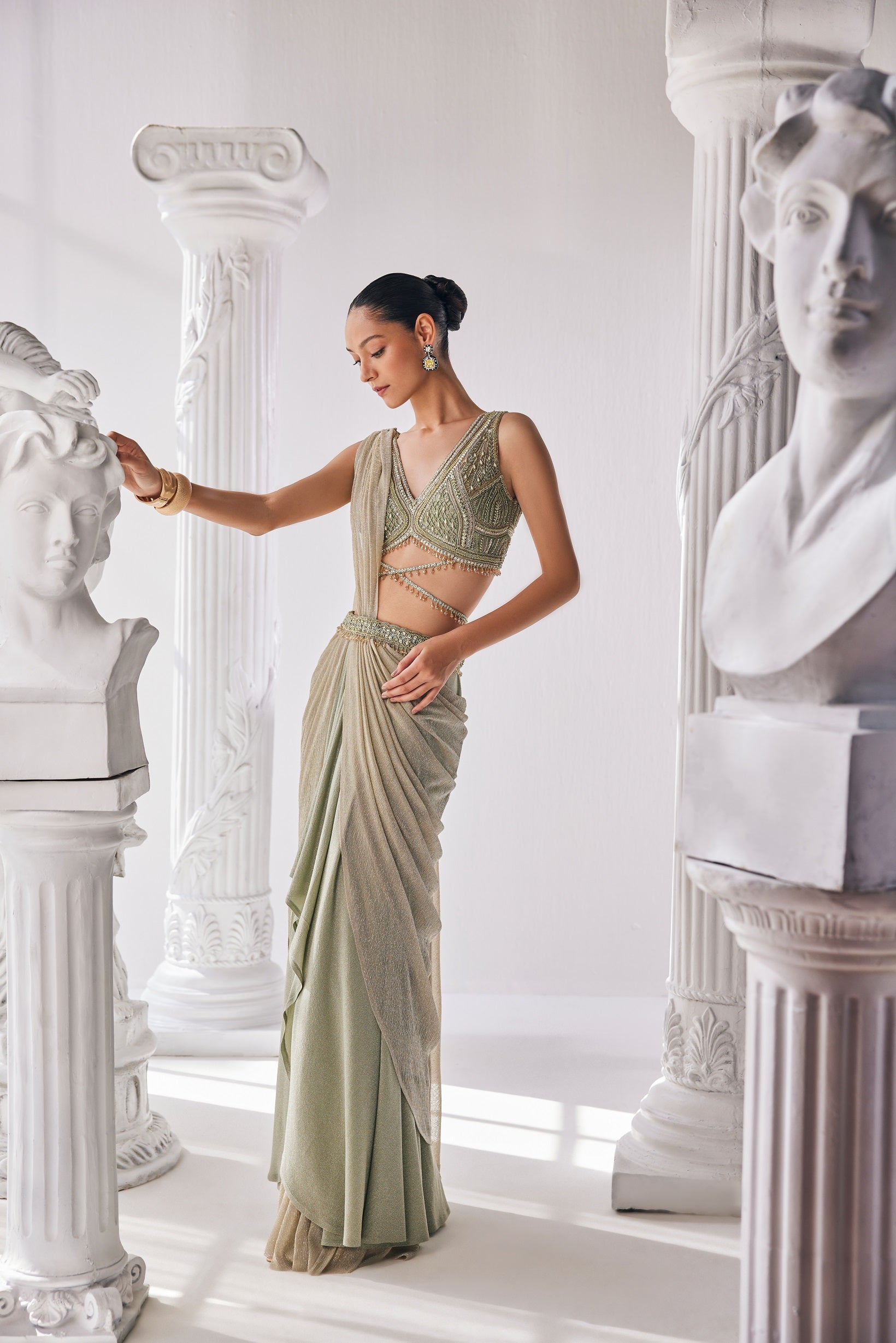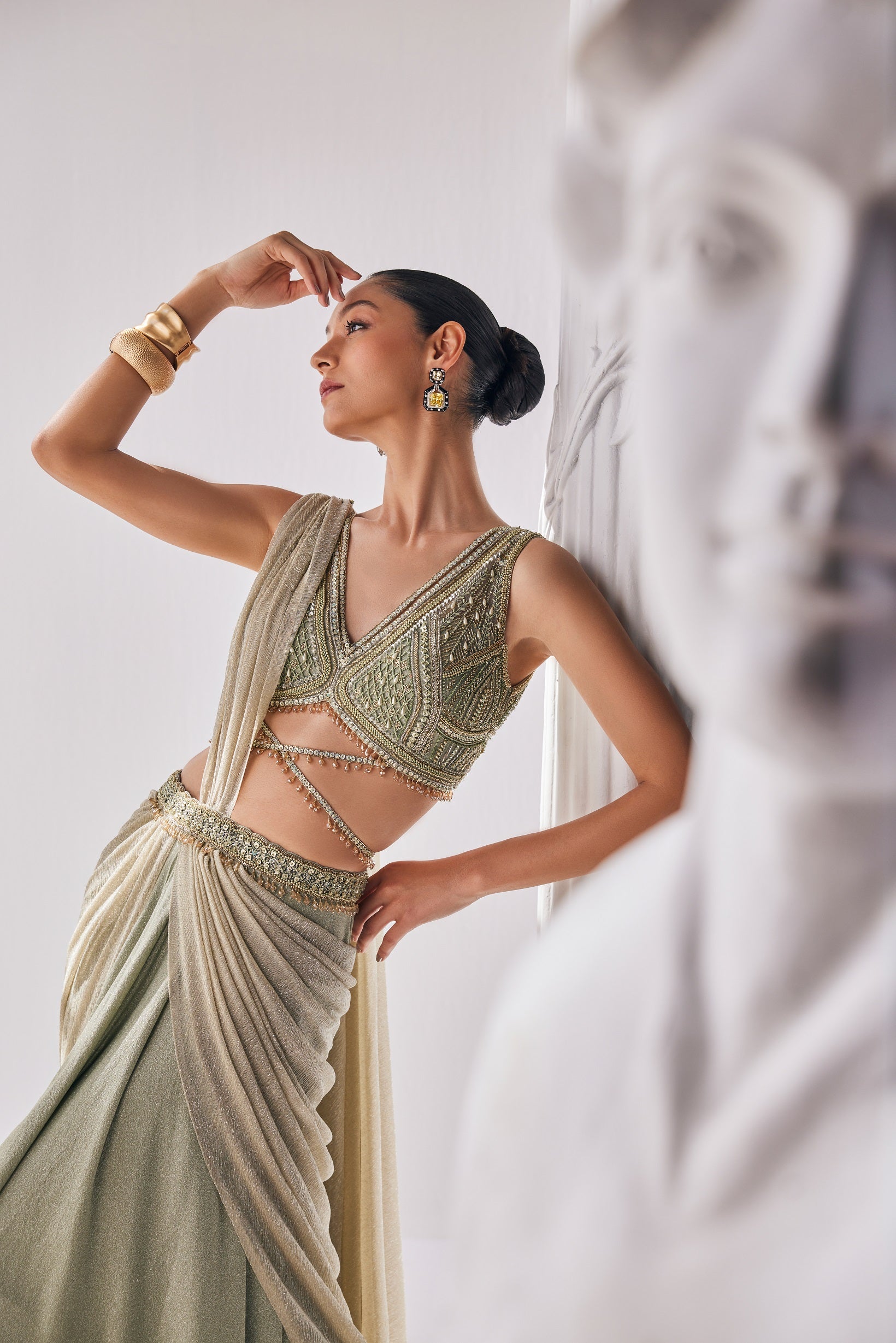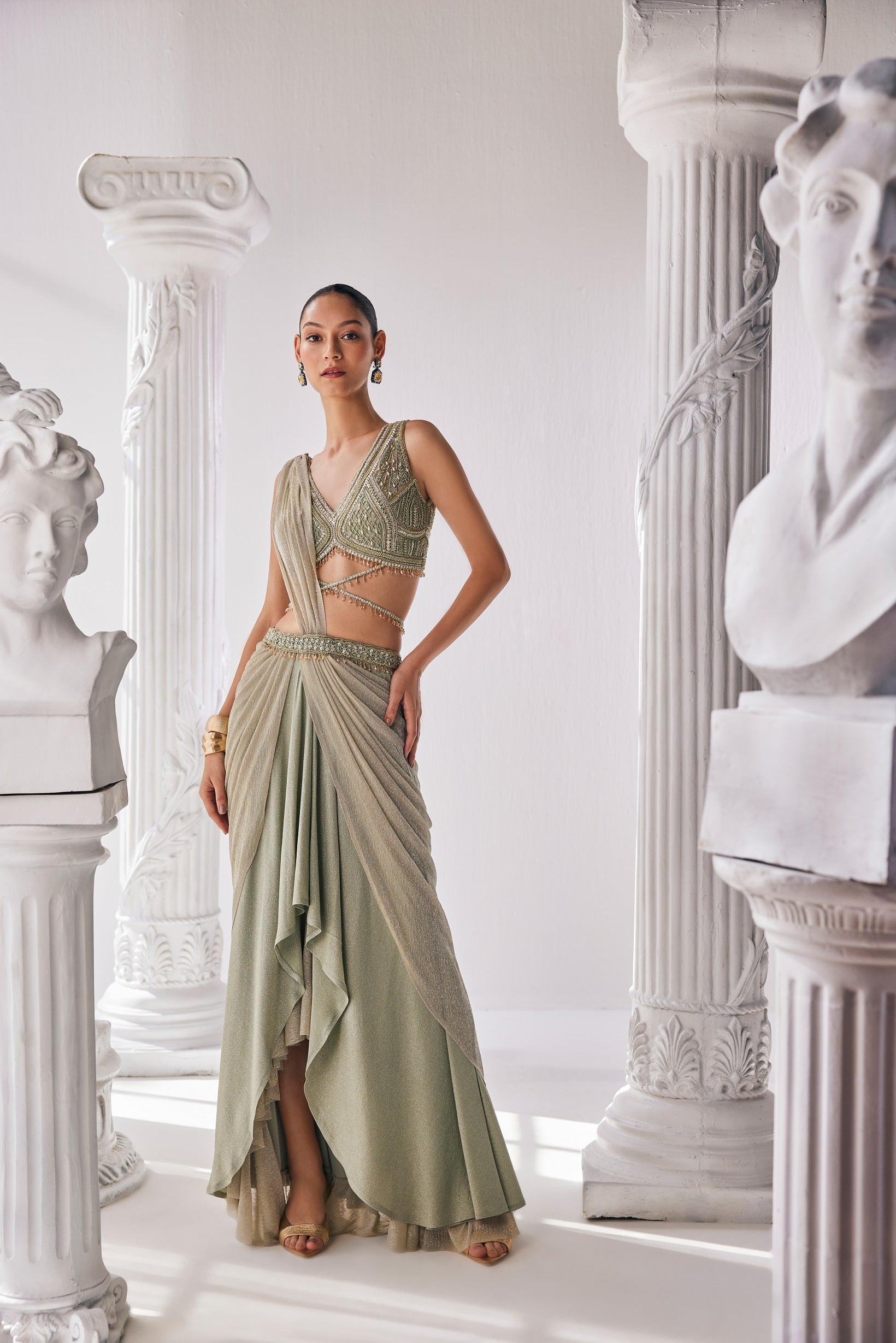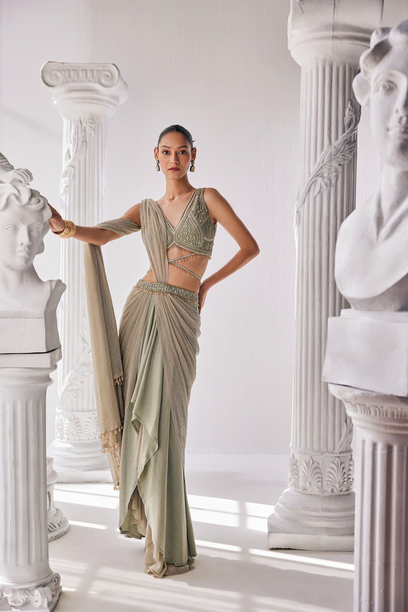 . It features a plunging neck blouse with beadwork and sequin detailing. Jade green draped saree crafted from a blend of lycra and crinkle fabric. Paired with a chic plunging neck blouse adorned with intricate beadwork and sequin detailing. This ensemble effortlessly combines modern flair with traditional charm |