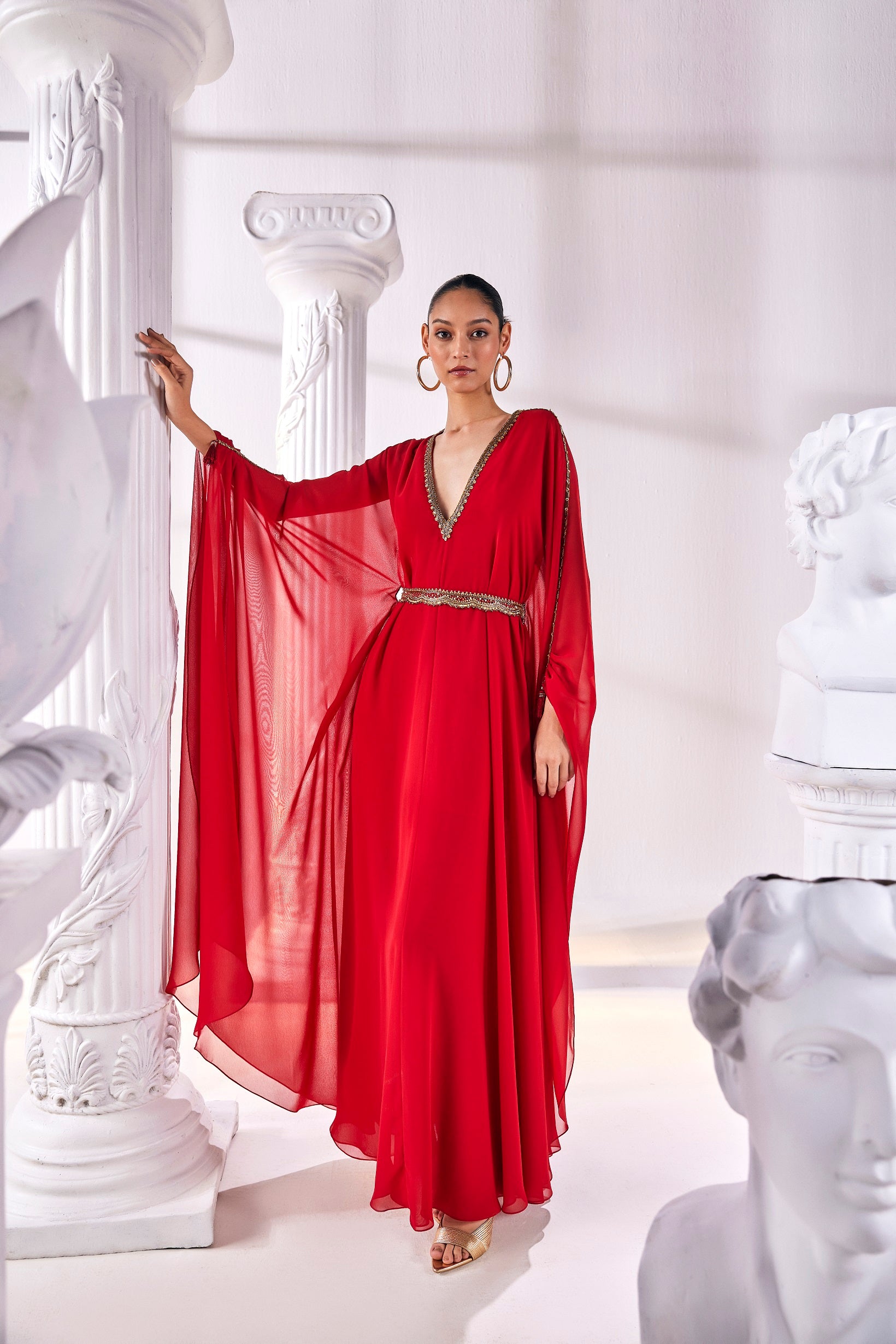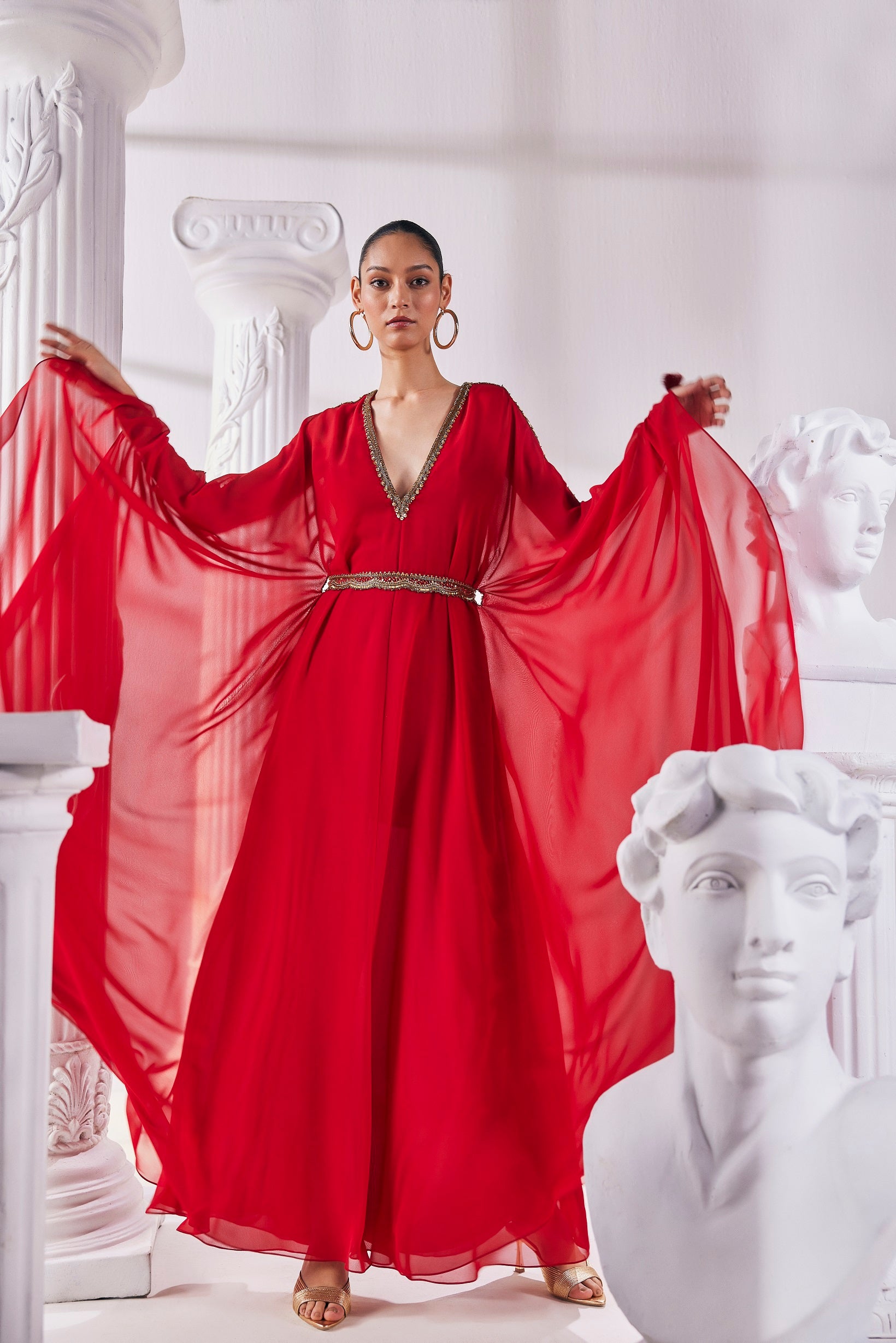 Elevate your style with this remarkable kaftan, a piece that exudes elegance and artistry. Crafted from royal georgette, it's symmetrical pleated design adds a touch of whimsy to your look.The focal point of this kaftan is the neckline, front belt and adorned with exquisite antique zardosi handwork.