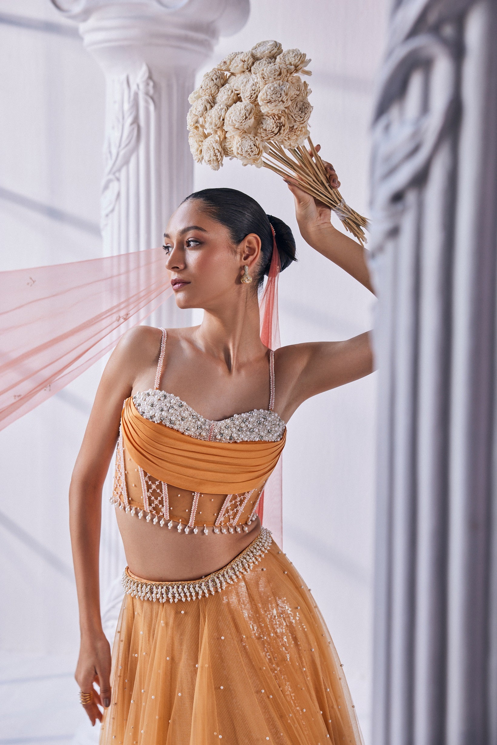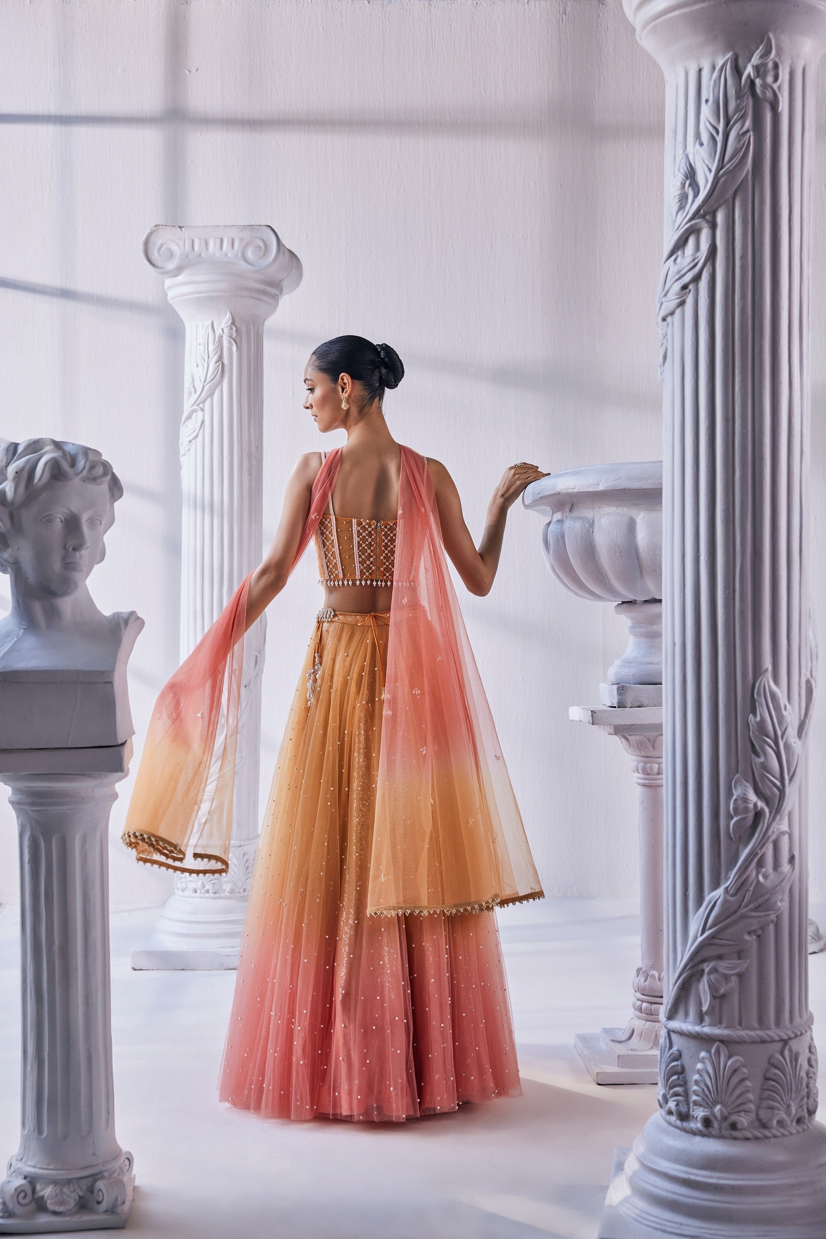 It is paired with a bead work corset, belt and a dupatta. This exquisite satin georgette ombre lehenga adorned with stunning sequin and pearl detailing. The luxurious ensemble is perfectly complemented by a meticulously crafted beadwork corset. Complete the look with a matching belt and dupatta. |