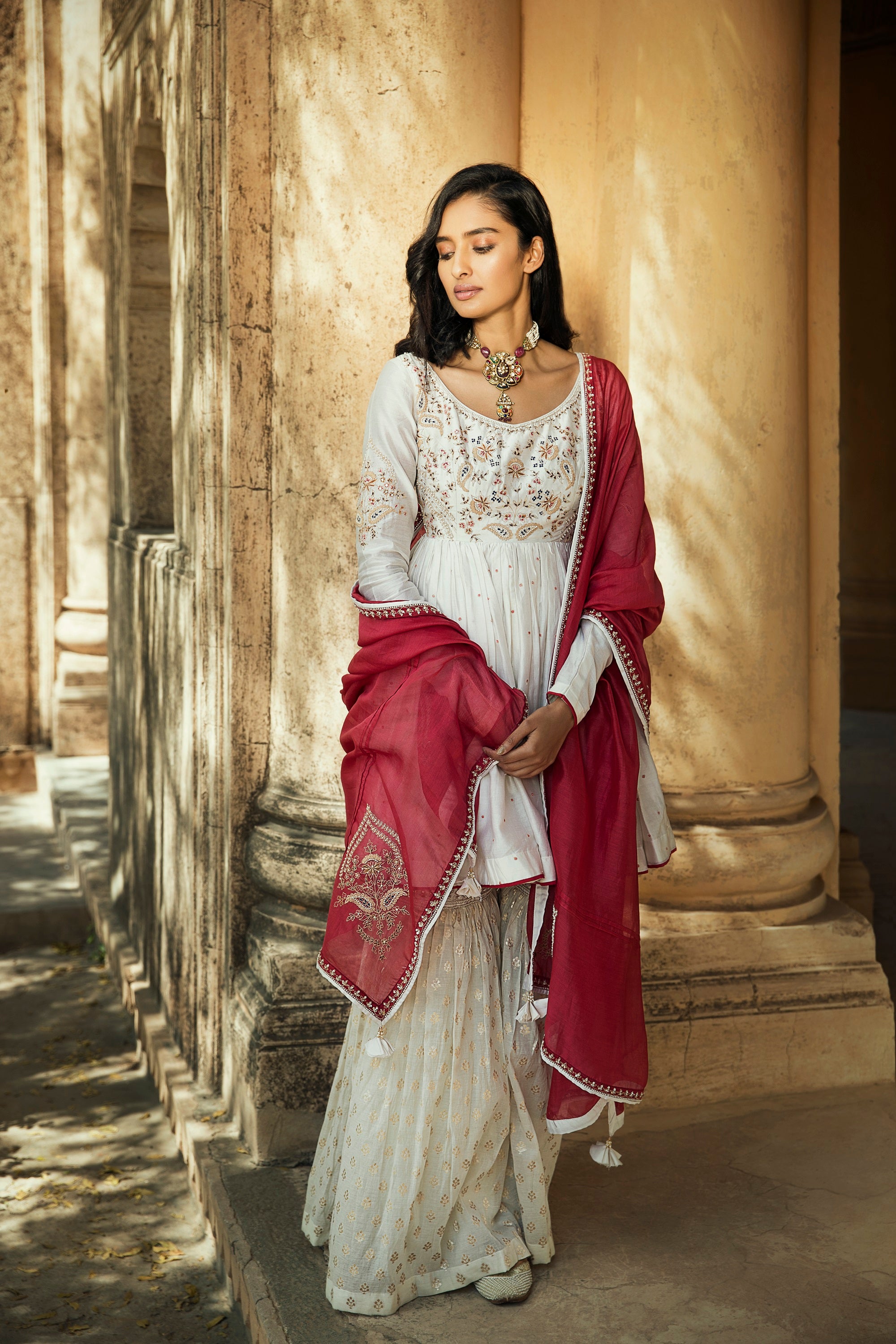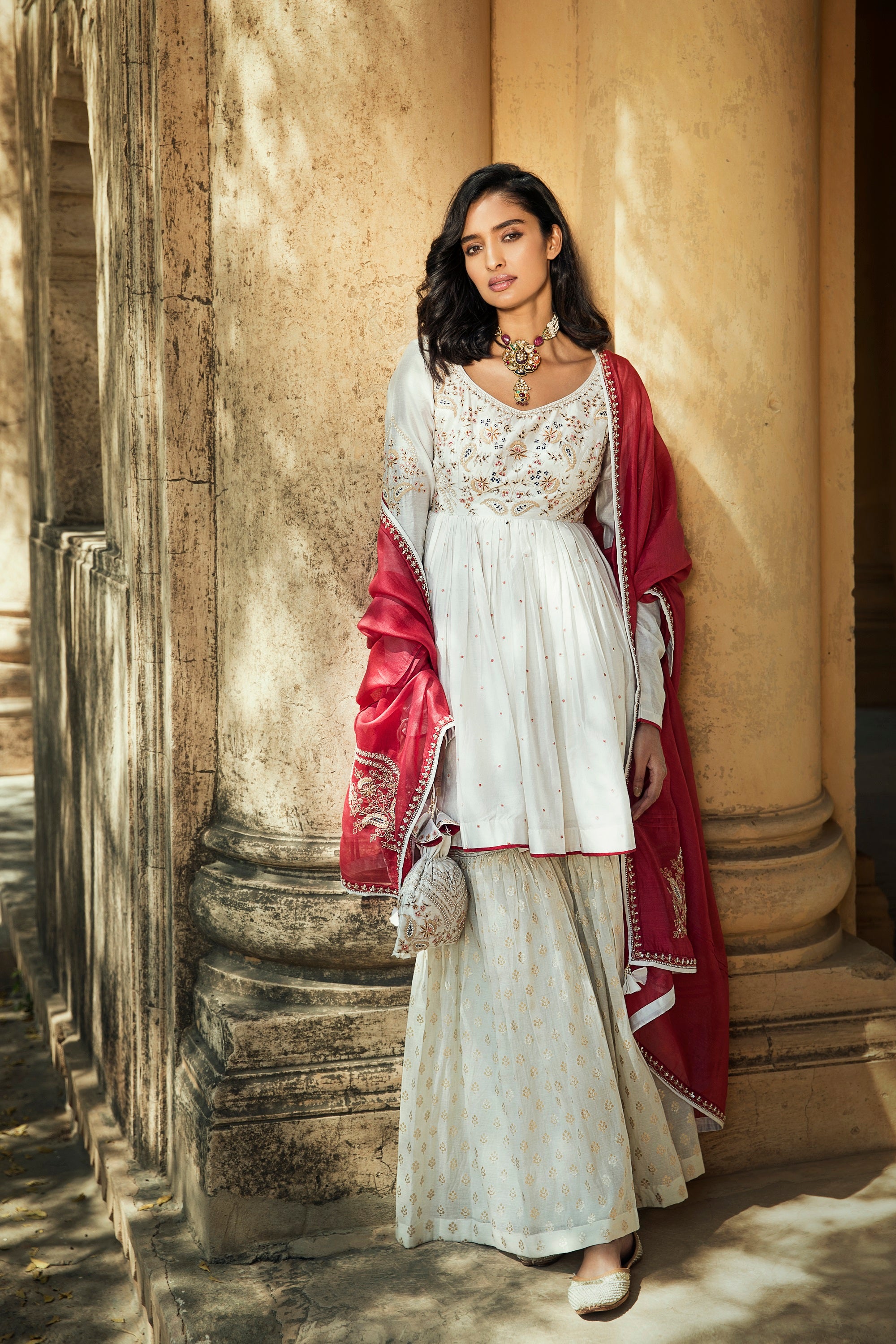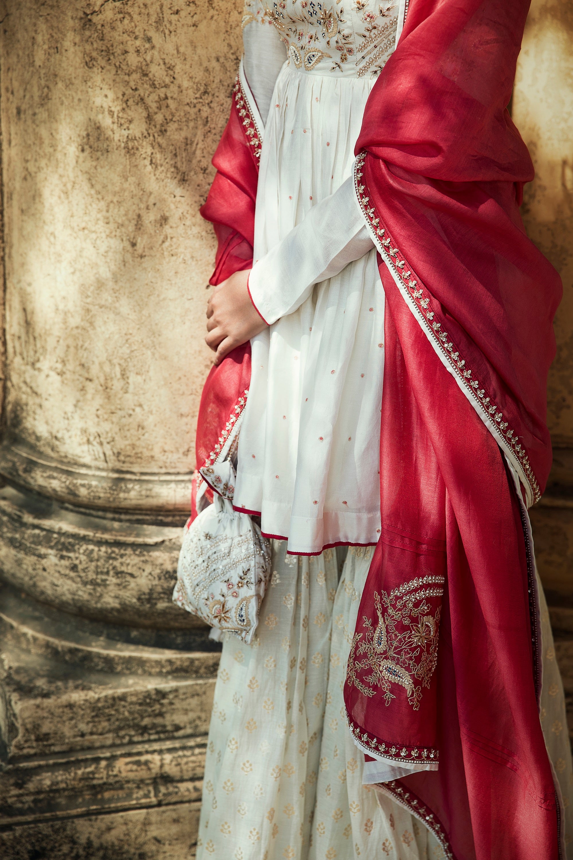 Balancing The Scales Of Old & New, The Collection Binds Craft With Modernity In A Vintage Setting Of The Matsya Woman In Her Humble Place, In A Palace Of Grandeur Over The Hills Of Alwar. Showcasing Here Is A Sophisticated Samsara Ikru Sindoori Sharara Set Based On Chanderi Silk. The Peplum Kurta Is Effortlessly Designed With A Front Scooped Neckline And A Deep Inverted Triangle Neckline On The Back  With Dori. The Garment Becomes Timeless With Full Sleeves Having Dori, Resham Thread And Motiya Work. Sharara Pants Exhibit The Culture In The Form Of Banarasi Booties Through Out. Paired With Sindoori Red Dupatta Having Filigree Border With An Alluring Set Of Tassels To Complete The Look. The Humble Tales Of Alwar Is A Collection That Is Breathable And Simple.