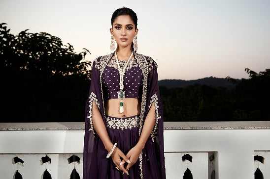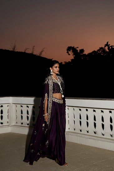 | The Royal Matsya peplum blends a signature of tradition on an uber modern versatile statement making british grey colour. The skirt is in a plan based georgette organza, light weight & flowy. The embroidery technique is a base of zari ari & is then re-embroidered with nakshi pittan textures and vintage zardosi, all in our signature tarnished silver colour. |