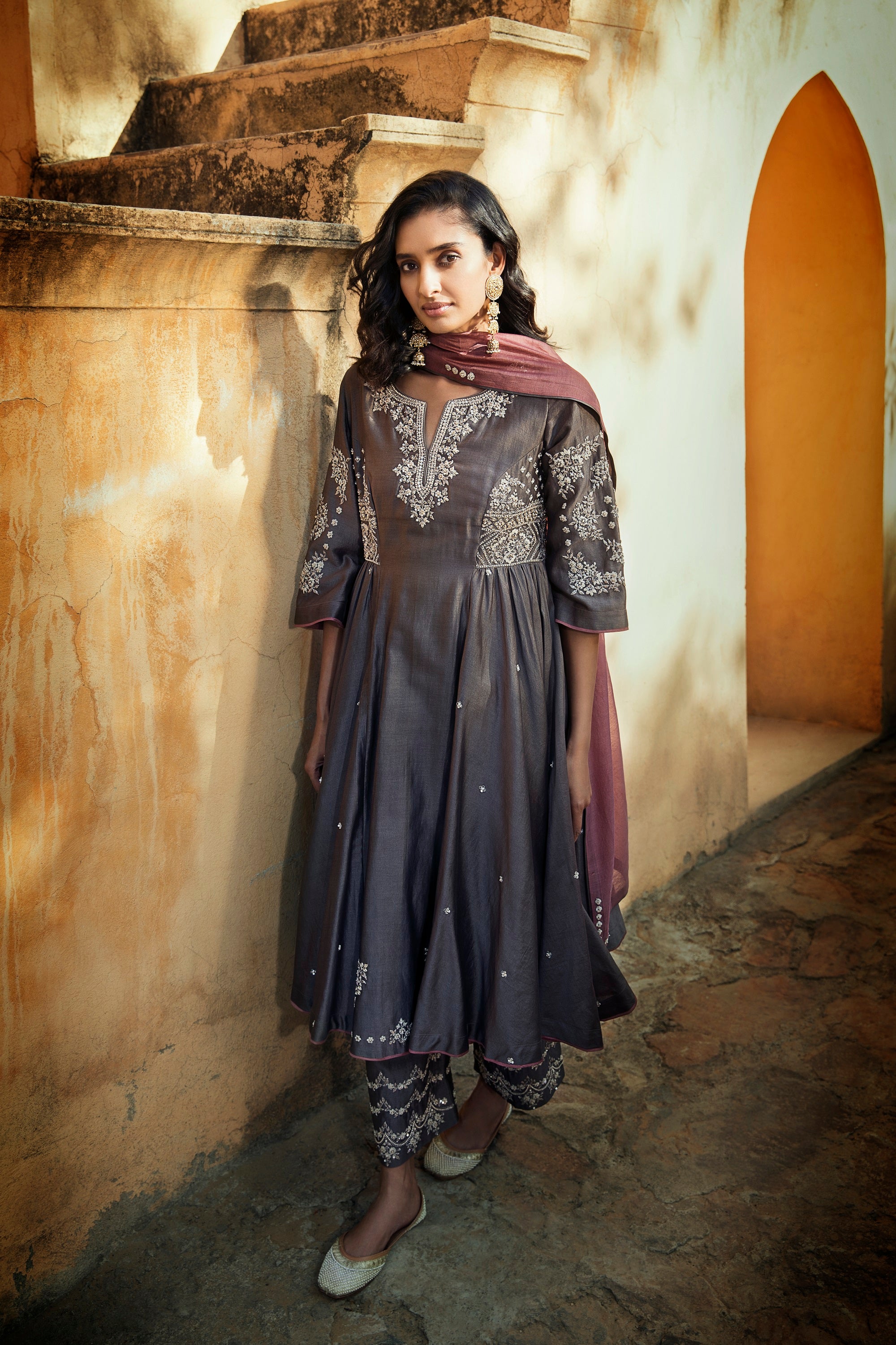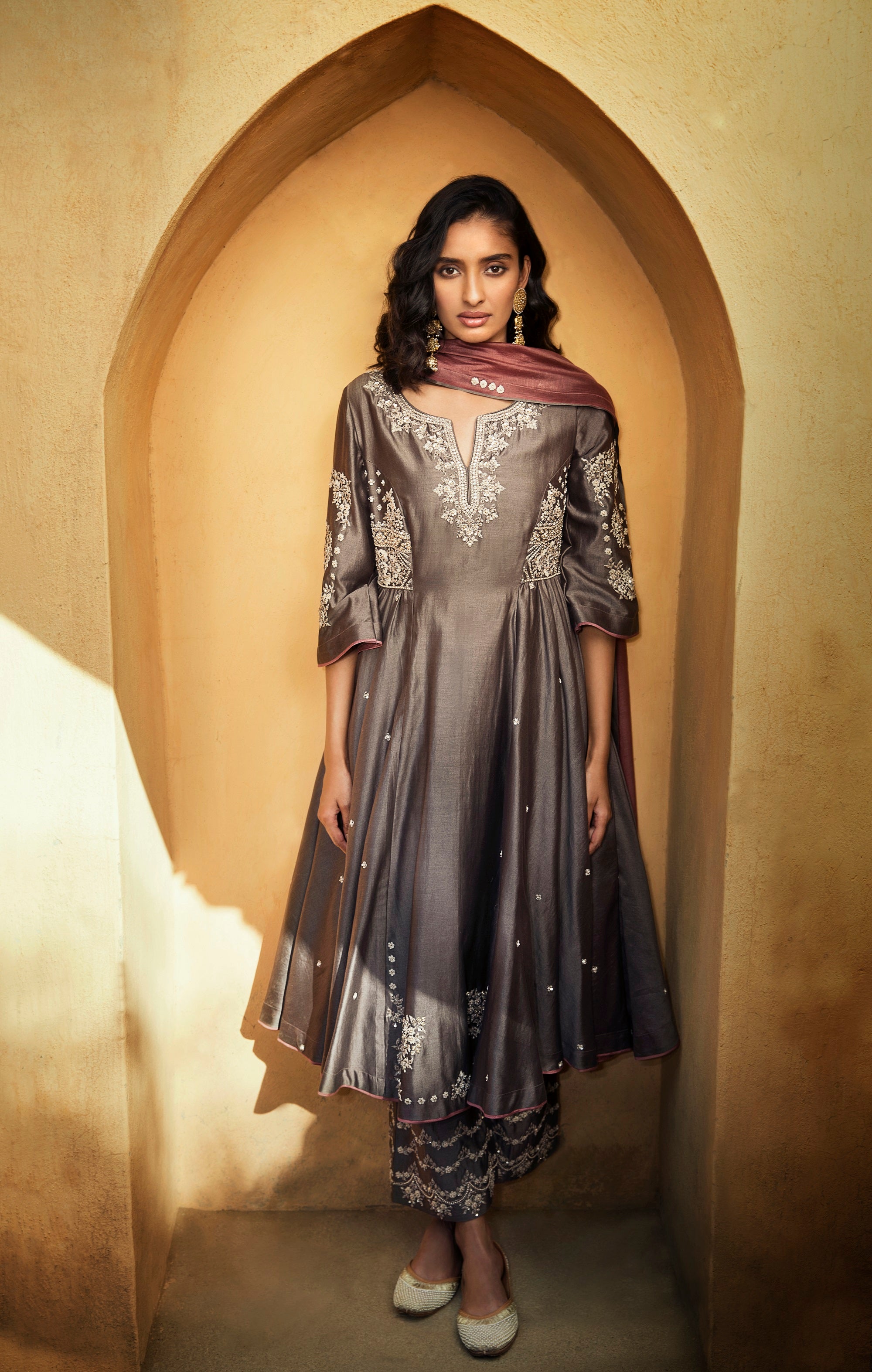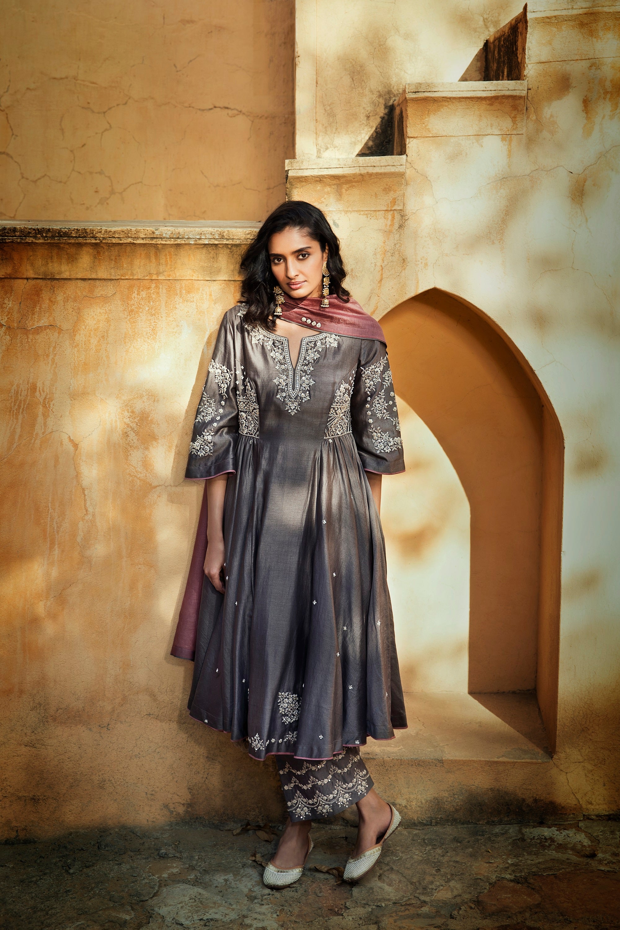 The Gulali Kota Anarkali Set Compiles Of A Muted Grey Short Anarkali Having A Heavy Embellished Front Bodice Showcasing An Astonishing Garland Hand Embroidery. Designed With Notch-V Neckline And Intricately Embroidered Quarter Sleeves. The Spell Bounding Silhouette Is Inspired By A Potpourri Of Vintage Crafts Of Zardozi, Hand Appliqués & Resham Ari, “The Humble Tales Of Alwar” Is A Reminiscent Story Of Evolution. Paired With A Comfortable Monotone Palazzo Pants With Intricate Handwork Having Motiya And Sequins In The Most Effortless Artistry. The Ensemble Comes With A Gulali Chanderi Silk Dupatta And Has Tassels Hanging At The Corners. The Ensemble Is A Perfect Blend Of Tradition And Culture In The Most Modest For, Showcasing The Classic Matsya Work. So Simple Yet So Luxurious.