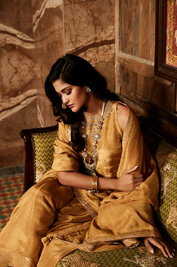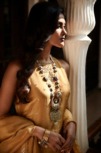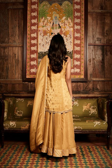 The Paaro Sharara is handcrafted in georgette tissue with delicately blended patra mirrors and antique beaded zardozi. The sharara & dupatta feature a fine geometric gota detailing to add to layer of vintage glamour. The haldi colour is carefully hand dyed to work with the indian skin tones and cultural festivities.