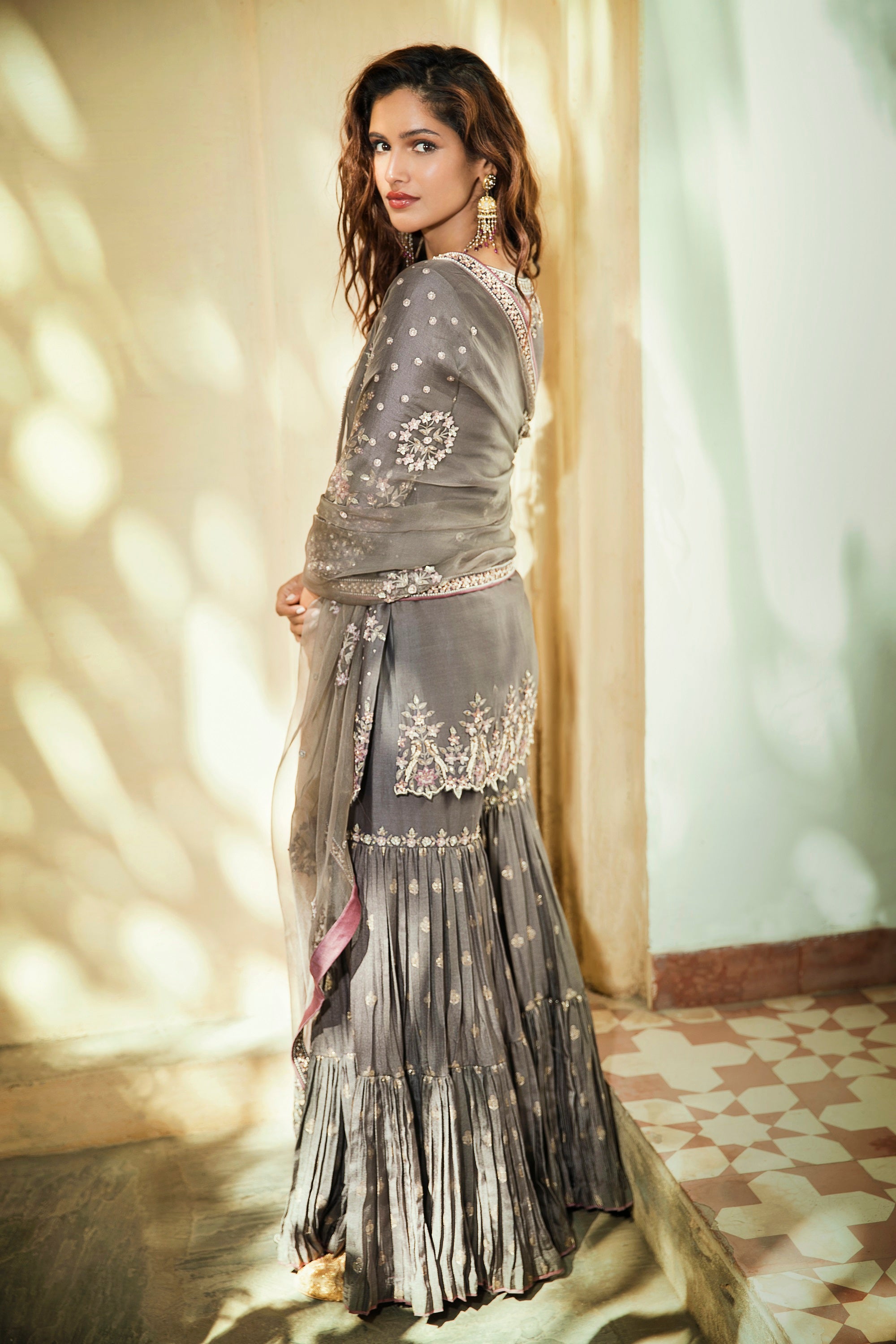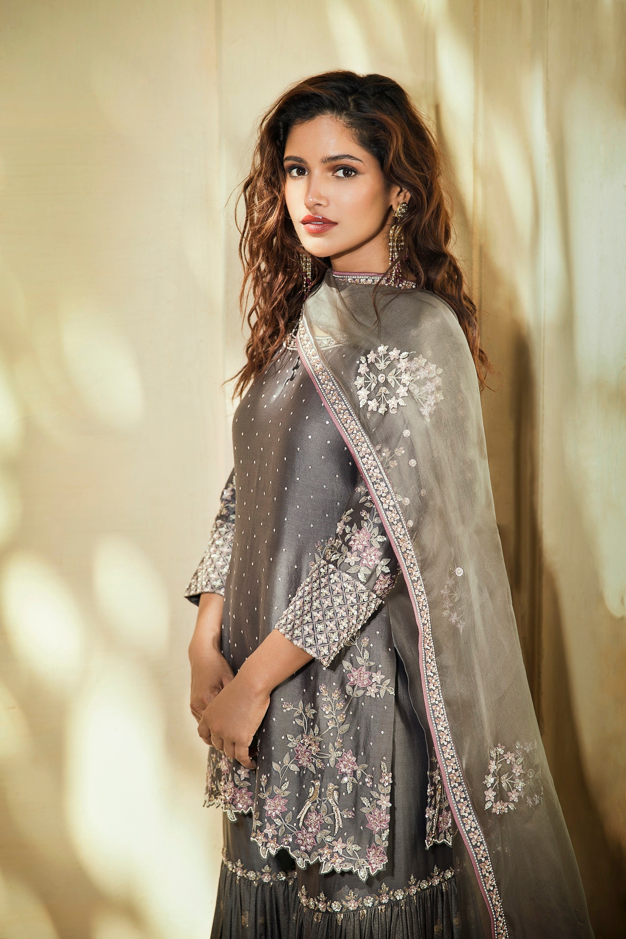 The Jaisalmeri Kota Garara Set Is The Quintessential Garment Made Of Bamboo Based Weavings & Chanderi Silks Which Are Predominantly Used In This Collection, Looking At The Weather Ahead & Summer Weddings. The Collection Is Breathable & Simple. The Spectacular Outfit Is Artistically Designed Keeping The Alwar City In Limelight. Kurta Is Based On Chanderi Silk Effortlessly Adorned With Sequins, Resham Thread, Cut-Dana And Vintage Zardozi, Having A Scooped Neckline With Fabric Buttons In Front And Quarter Sleeves. The Hem Of The Kurta Has Timeless Cutwork Design Featuring Enchanting Floral Romance With Birds. Paired With Banarsi Chanderi Comfortable Sharara Pants Having Small Booties. The Ensemble Is Completed With A Monotone Dupatta Accompanied With A Slight Hint Of Onion Pink And Floral Embroidery. Timeless & Luxurious.