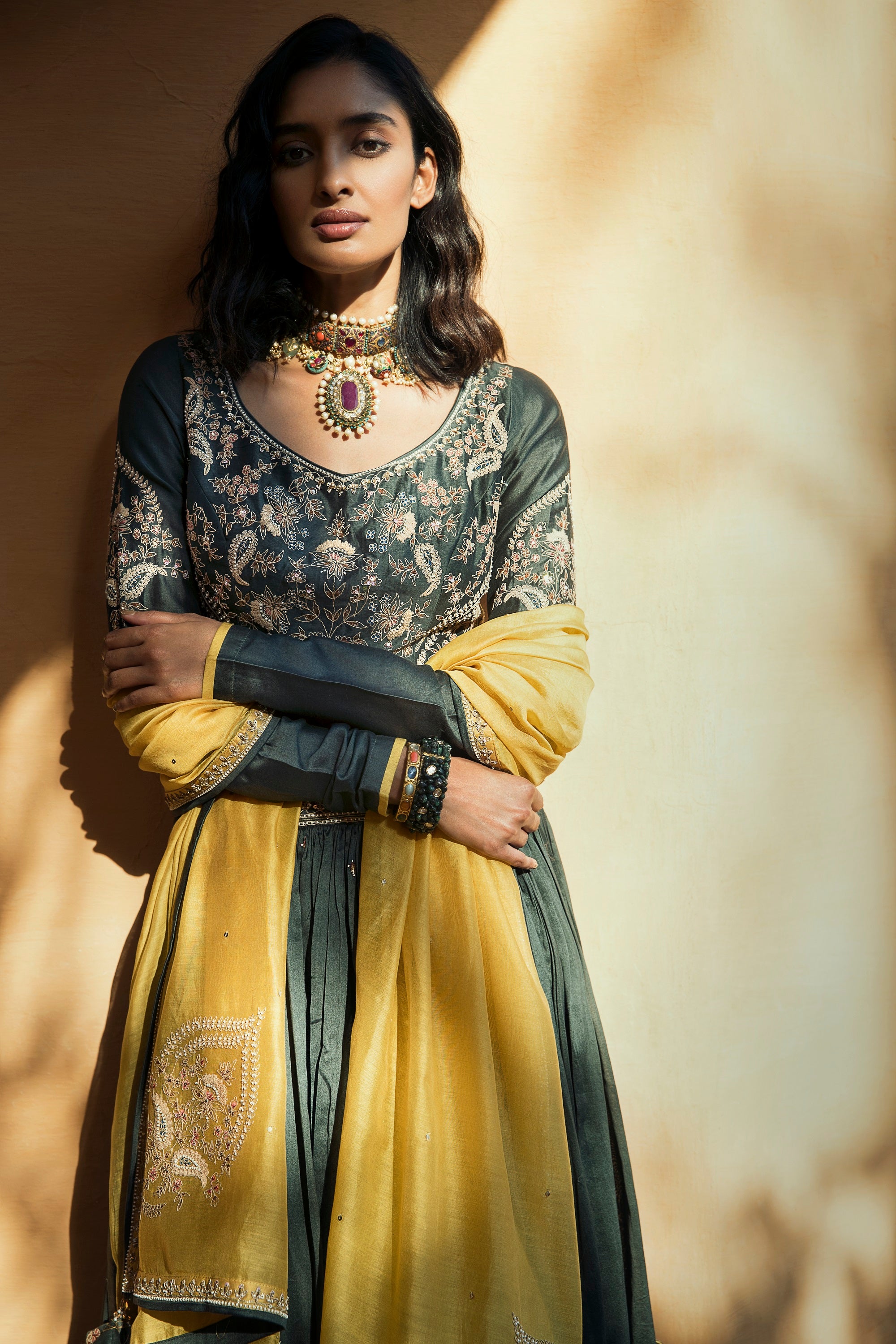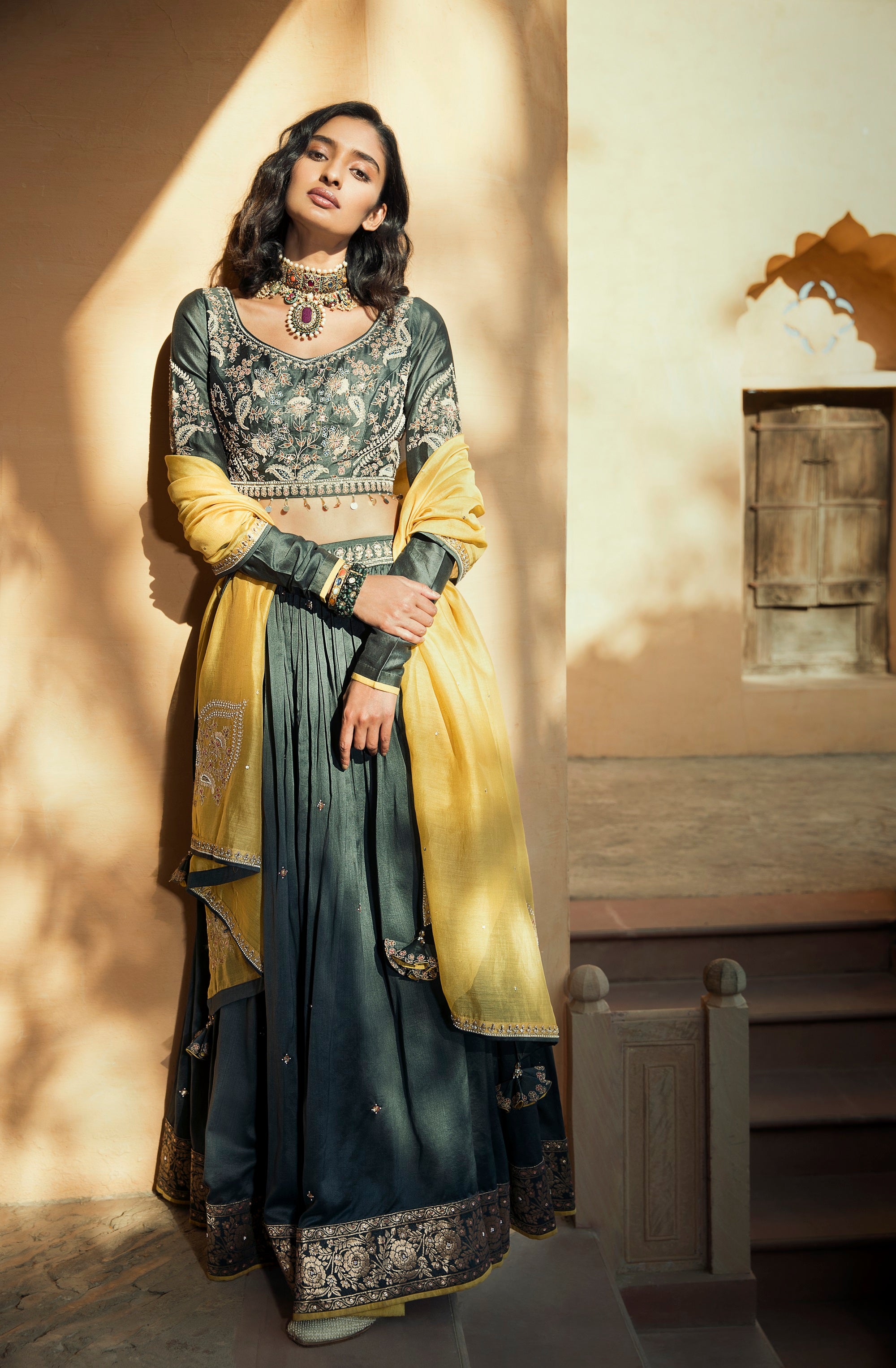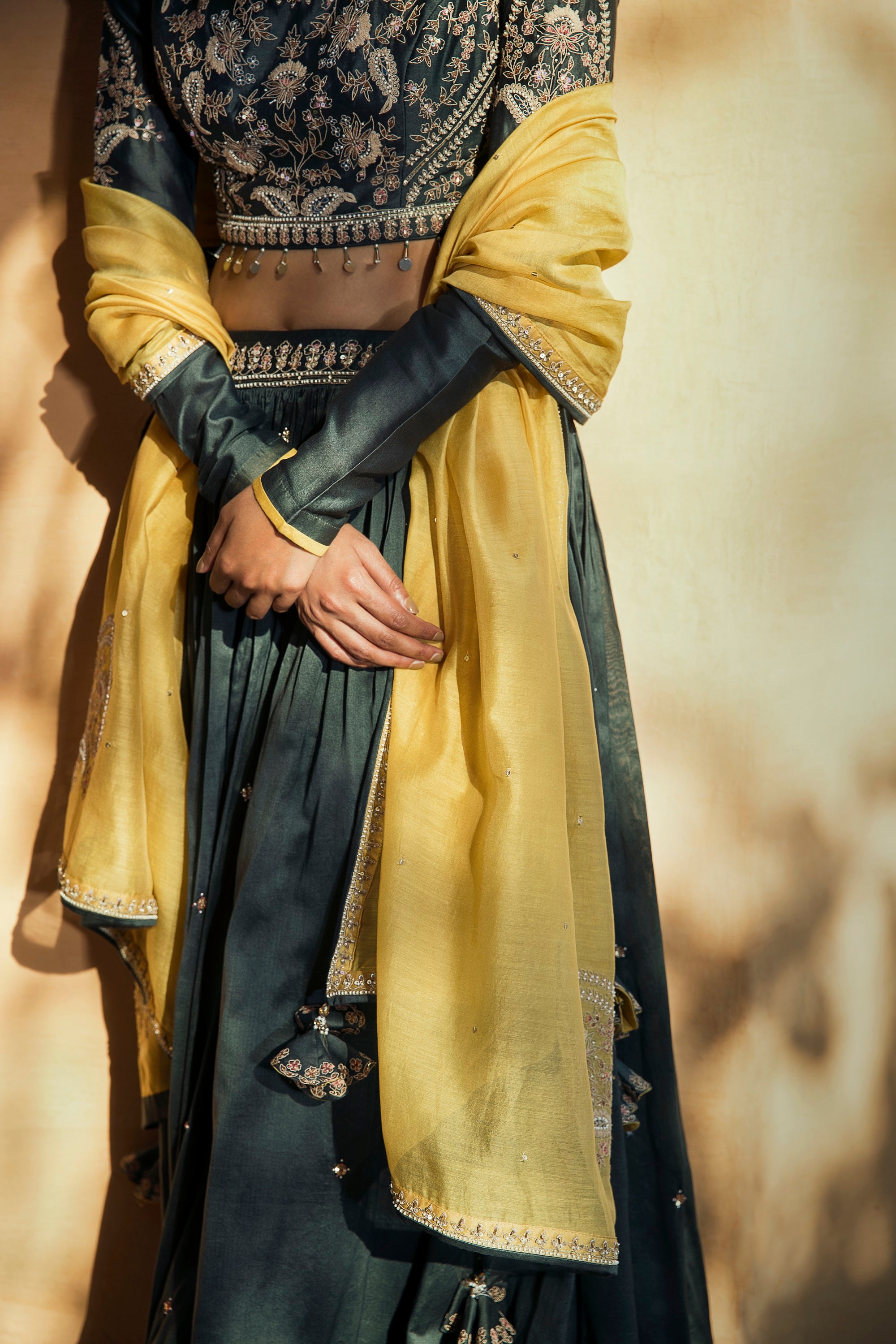 Balancing The Scales Of Old & New, The Collection Binds Craft With Modernity In A Vintage Setting Of The Matsya Woman In Her Humble Place, In A Palace Of Grandeur Over The Hills Of Alwar. Featuring The Mastani Lehenga Set With A Contrasting Dupatta. Blouse Is Traditionally Designed With Full Sleeves And A Scoop Neckline And An Inverted Triangle Which Is Deligently Curated With Dori And Resham Thread Work And Intricate Details Of Sequins And Motiya. The Skirt Has Gathers On The Waist And A Subtle Resham Flounce. The Ensemble Is Completed With A Contrasting Yellow Organza Dupatta To Complete The Look. A Collection That Is Breathable And Simple.