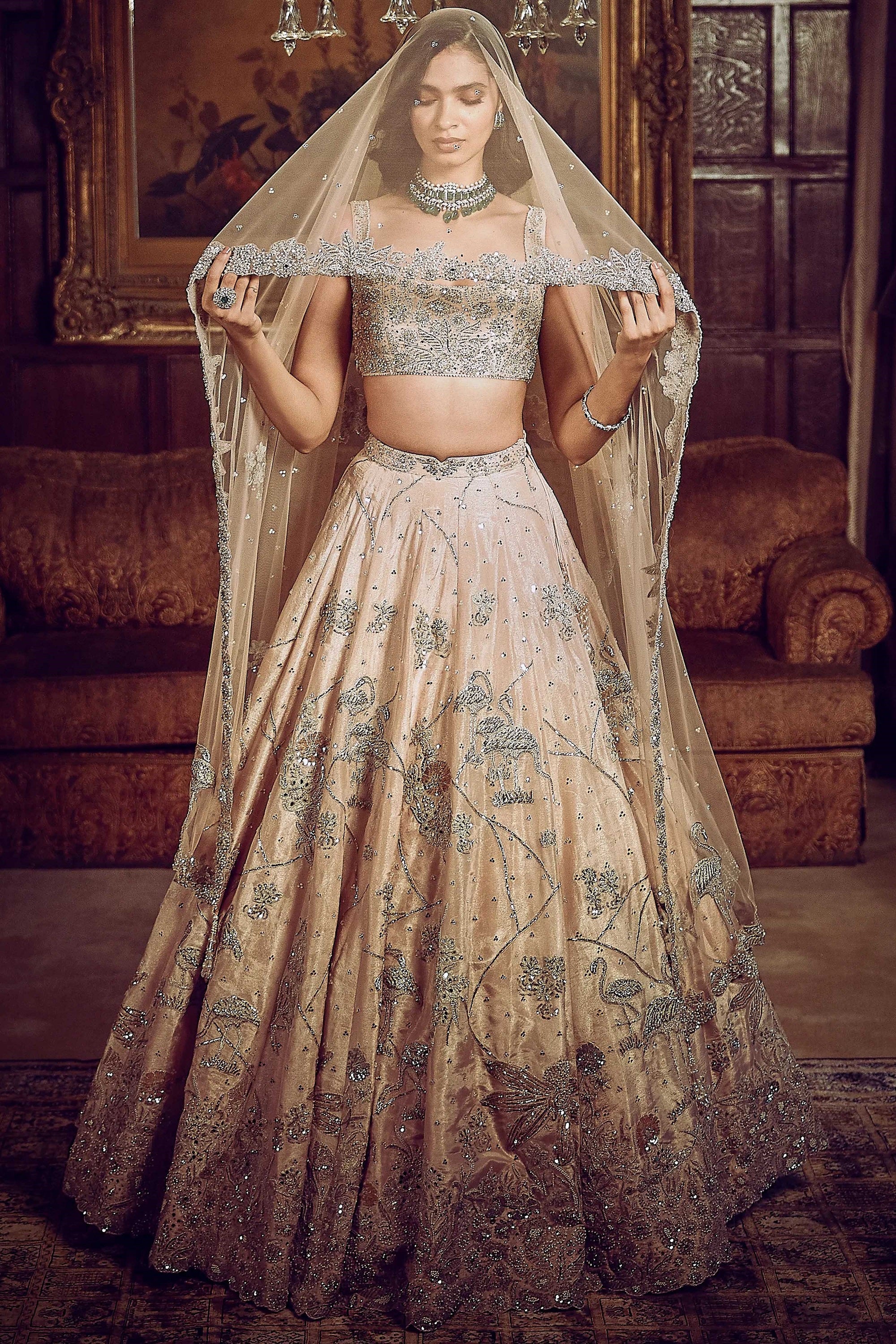 The Moroccan Pink Flamingo Landscape Lehenga Is A Bold Expression Of Vibrant Artistry. Silver Dori Work And Fine Hand Embroidery Sweep Across The Flamingo-Pink Fabric, Creating A Lehenga That's Radiant And Regal. This Lehenga Offers A Contemporary Twist On Classic Craftsmanship, Transforming The Wearer Into A Vision Of Elegance And Exuberance.