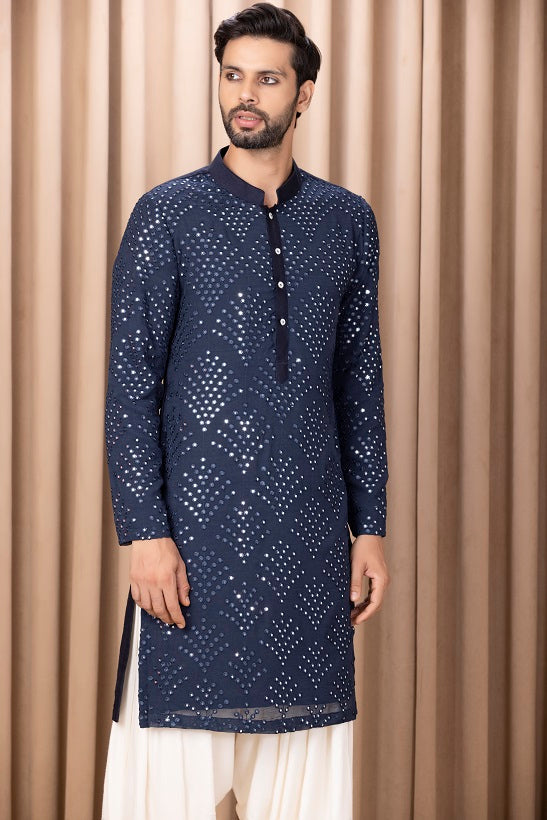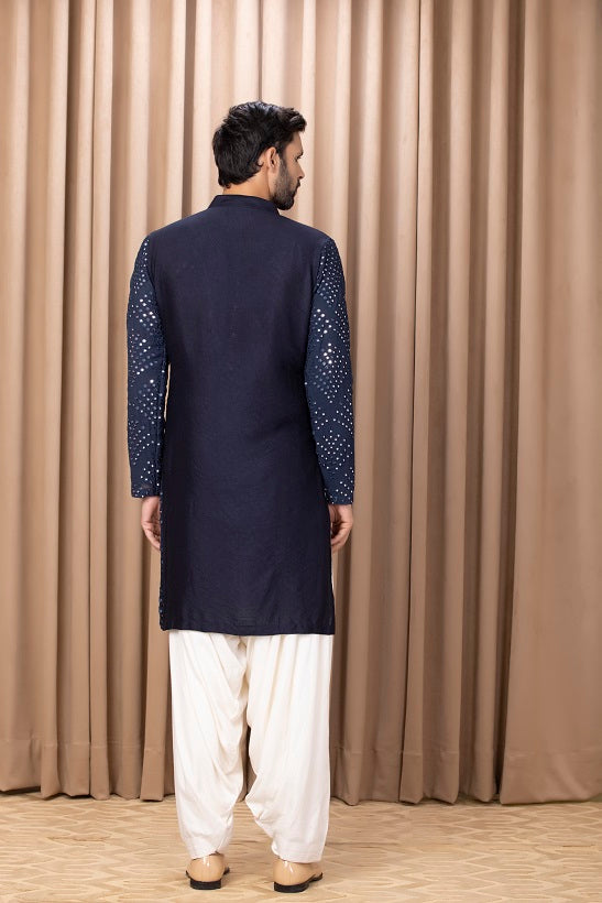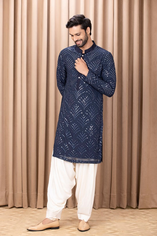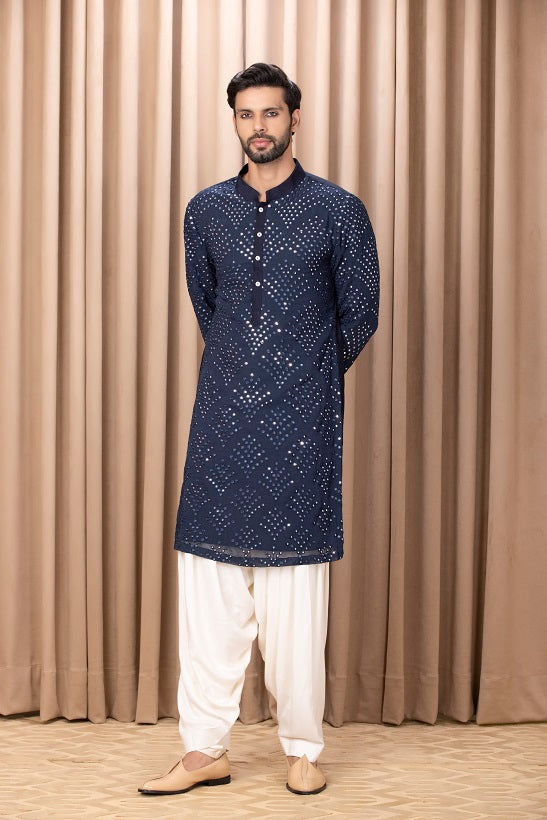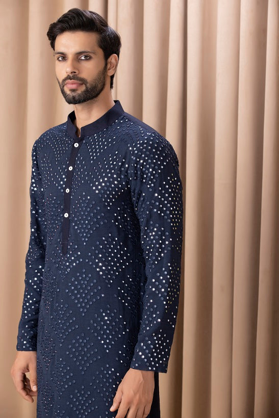 | Featuring a bespoke cotton silk and georgette kurta set in navy blue color with mirror work and machine embroidery on the front and sleeves. Perfect for an outdoor occasion for the modern groom or groomsmen. This comes with an ivory classic churidaar |