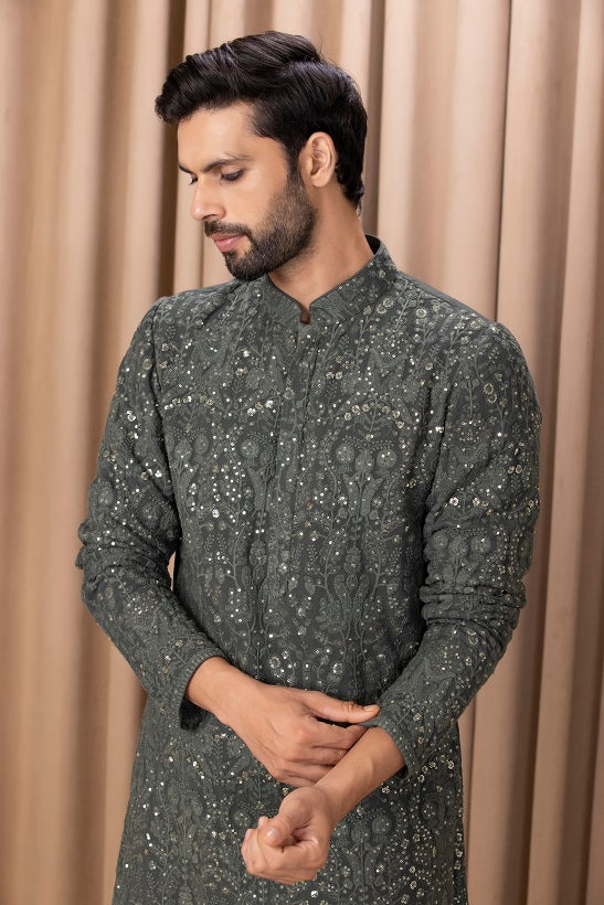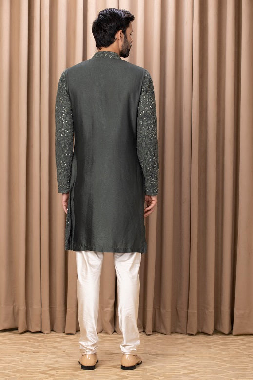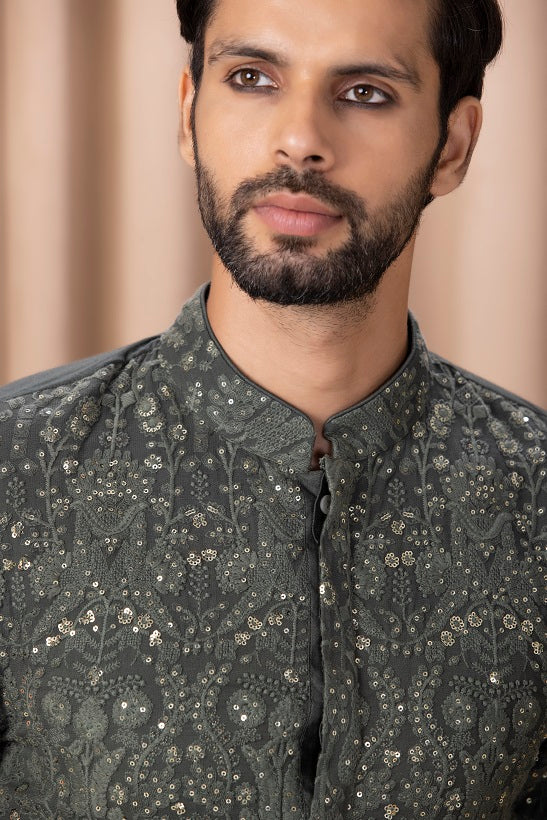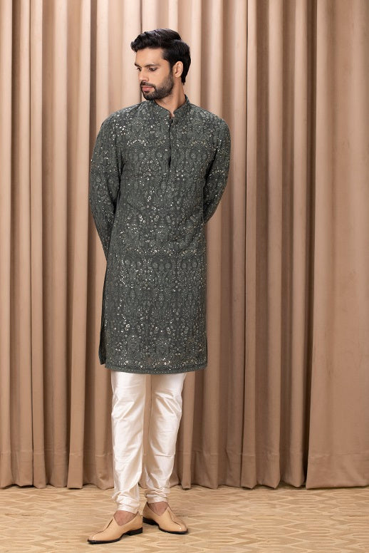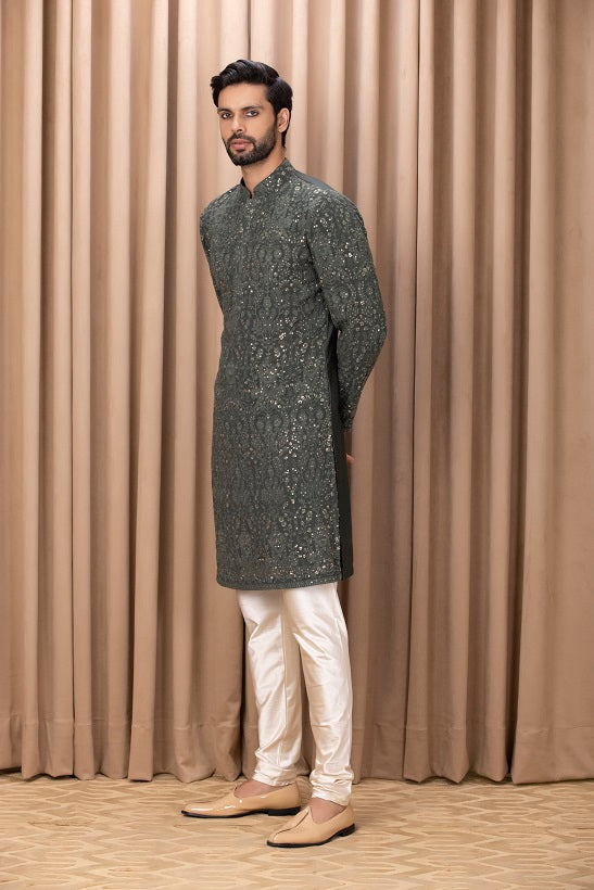 | Featuring a bespoke cotton silk and georgette kurta set in olive green color with thread machine embroidery on the front and sleeves. Perfect for an outdoor occasion for the modern groom or groomsmen. This comes with an ivory classic churidaar |