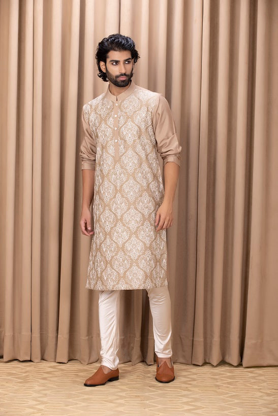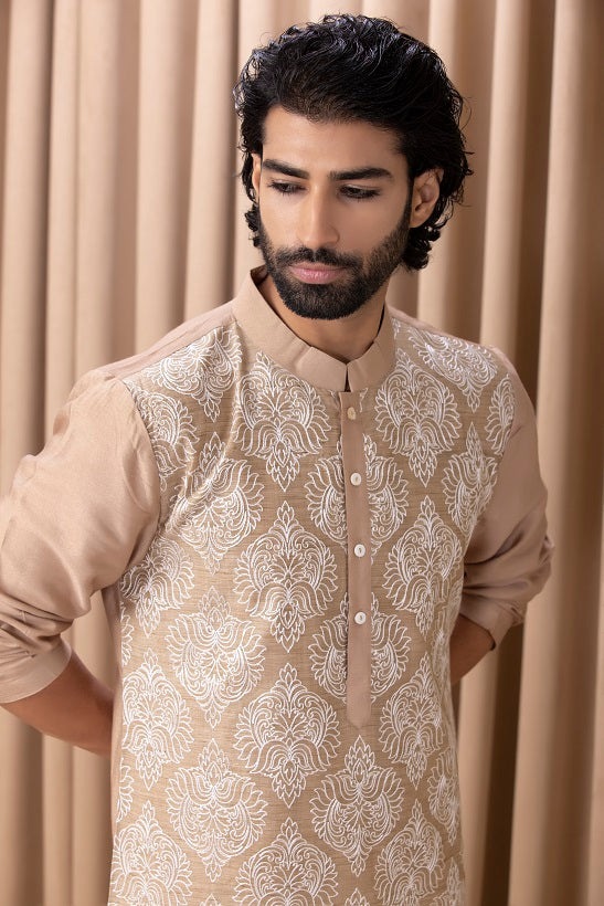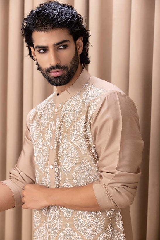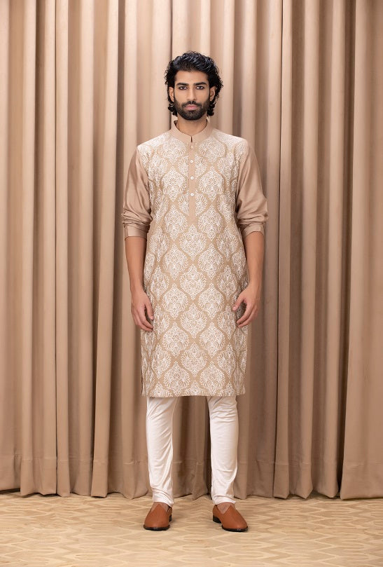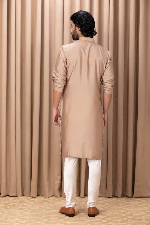 | Featuring a bespoke cotton silk kurta set in mouse brown color with machine embroidery on the front. Perfect for an outdoor occasion for the modern groom or groomsmen. This comes with an ivory classic churidaar |