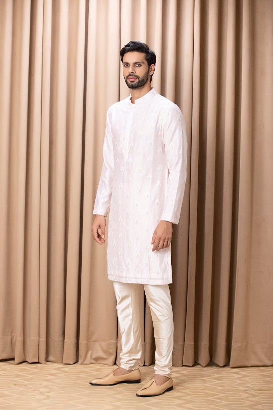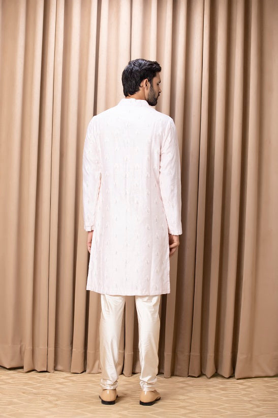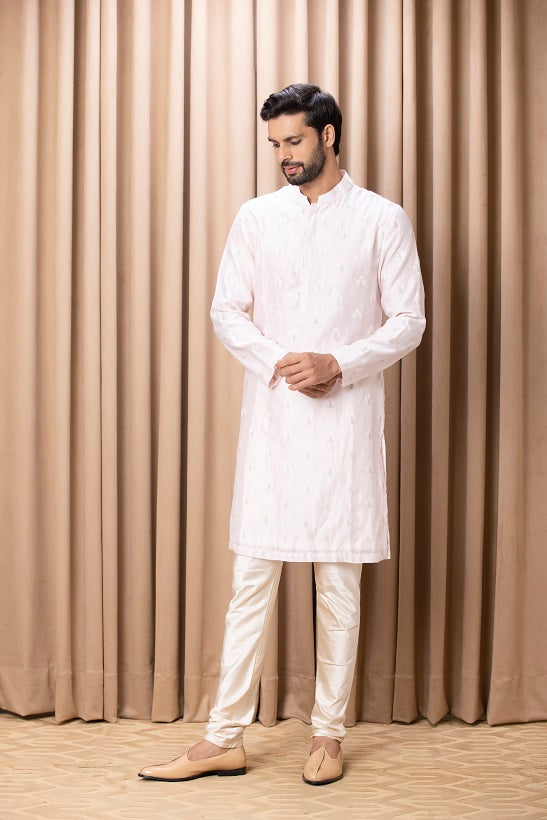 | Featuring a bespoke cotton silk kurta set in powder pink color with embroidered motifs. Perfect for an outdoor occasion for the modern groom or groomsmen. This comes with an ivory classic churidaar |