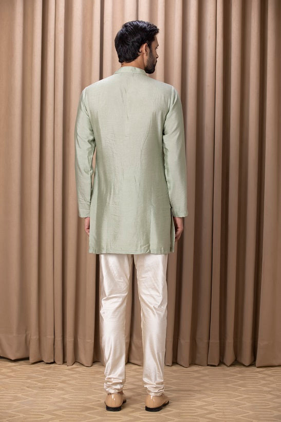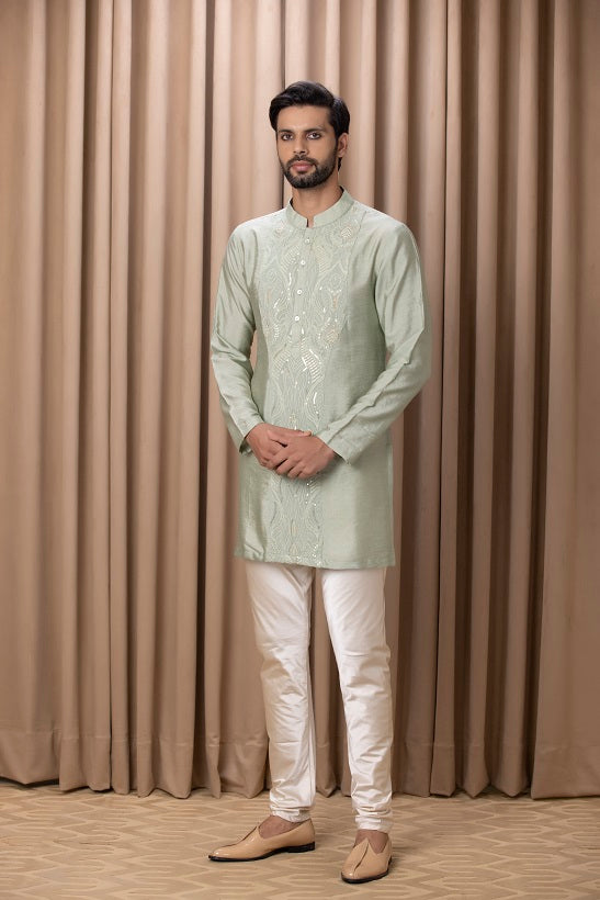 | Featuring a bespoke short cotton silk kurta set in mint green color with embroidered front. Perfect for an outdoor occasion for the modern groom or groomsmen. This comes with an ivory classic churidaar |
