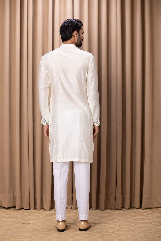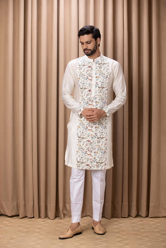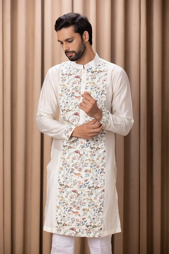 | Featuring a bespoke cotton silk kurta set in ivory color with digital printed hand painted motifs on the front. Perfect for an outdoor occasion for the modern groom or groomsmen. This comes with an ivory classic churidaar |