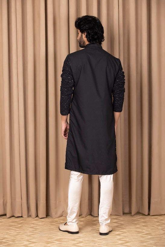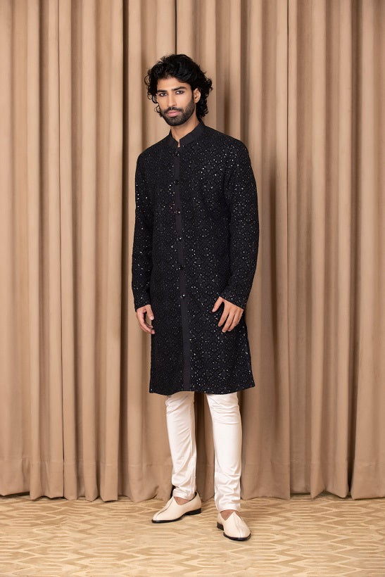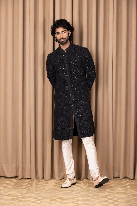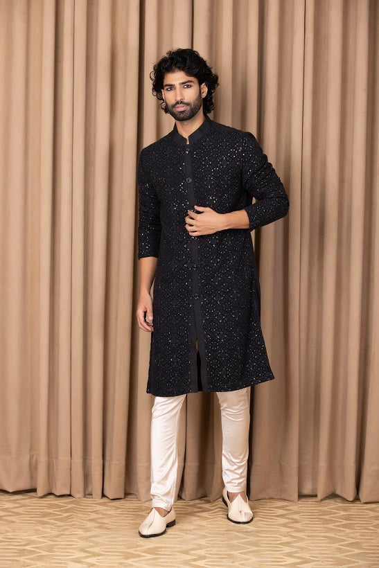 | Featuring a bespoke cotton silk and georgette kurta set in navy blue color with thread machine embroidery on the front and sleeves. Perfect for an outdoor occasion for the modern groom or groomsmen. This comes with an ivory classic churidaar |