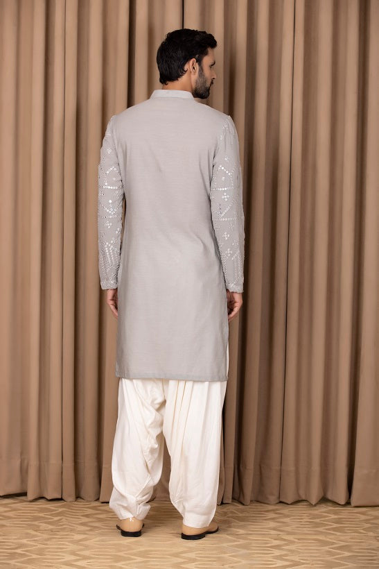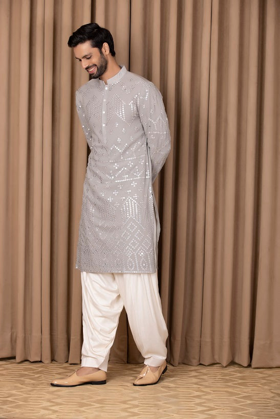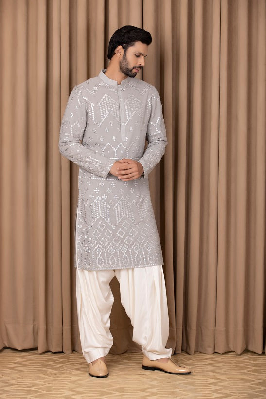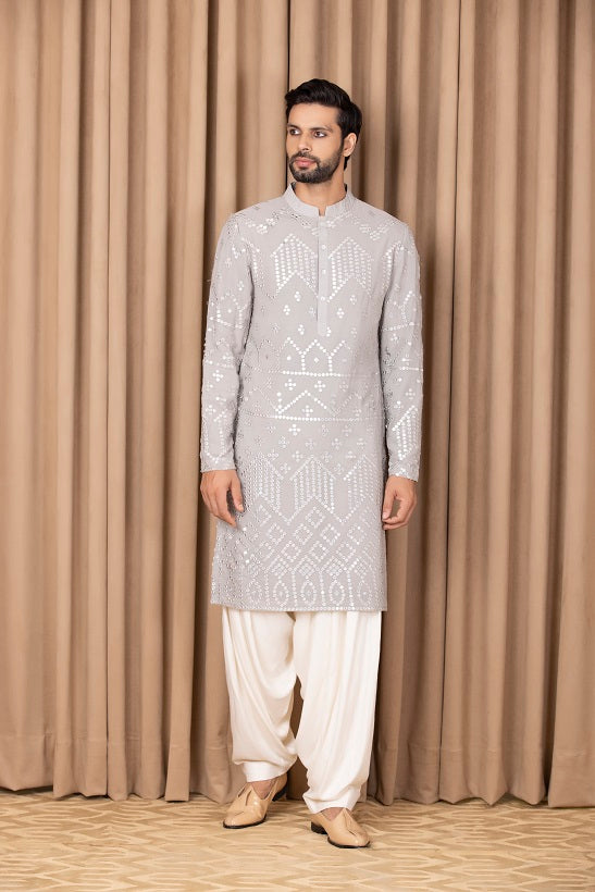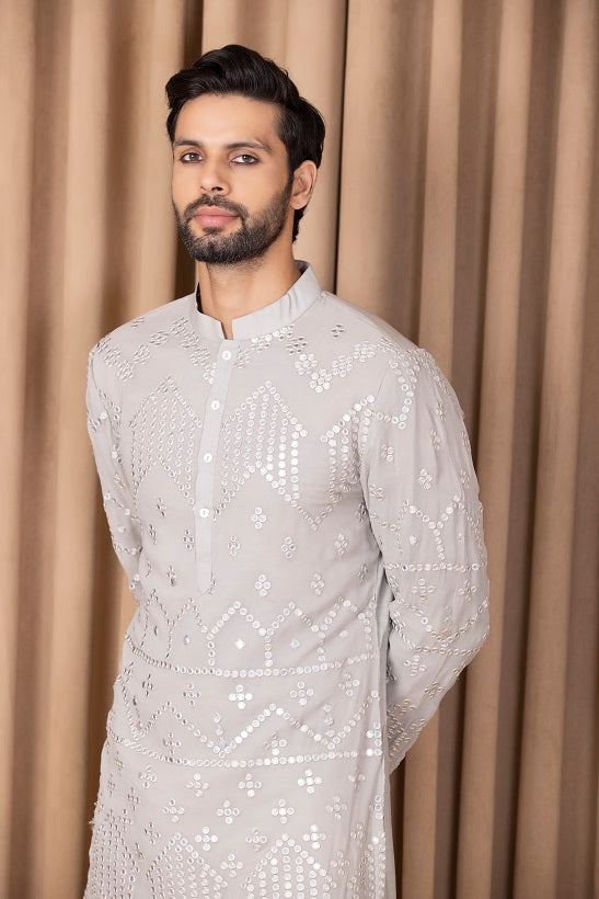 | Featuring a bespoke cotton silk and georgette kurta set in steel grey color with mirror work and machine embroidery on the front and sleeves. Perfect for an outdoor occasion for the modern groom or groomsmen. This comes with an ivory classic churidaar |