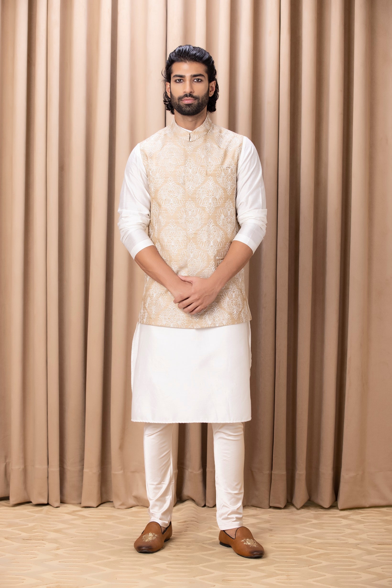 | Featuring a bespoke beige nehru jacket with intricate embroidery and minimal detalis. Perfect for any indoor or outdoor occasion. This comes with an ivory white kurta and ivory churidaar. |