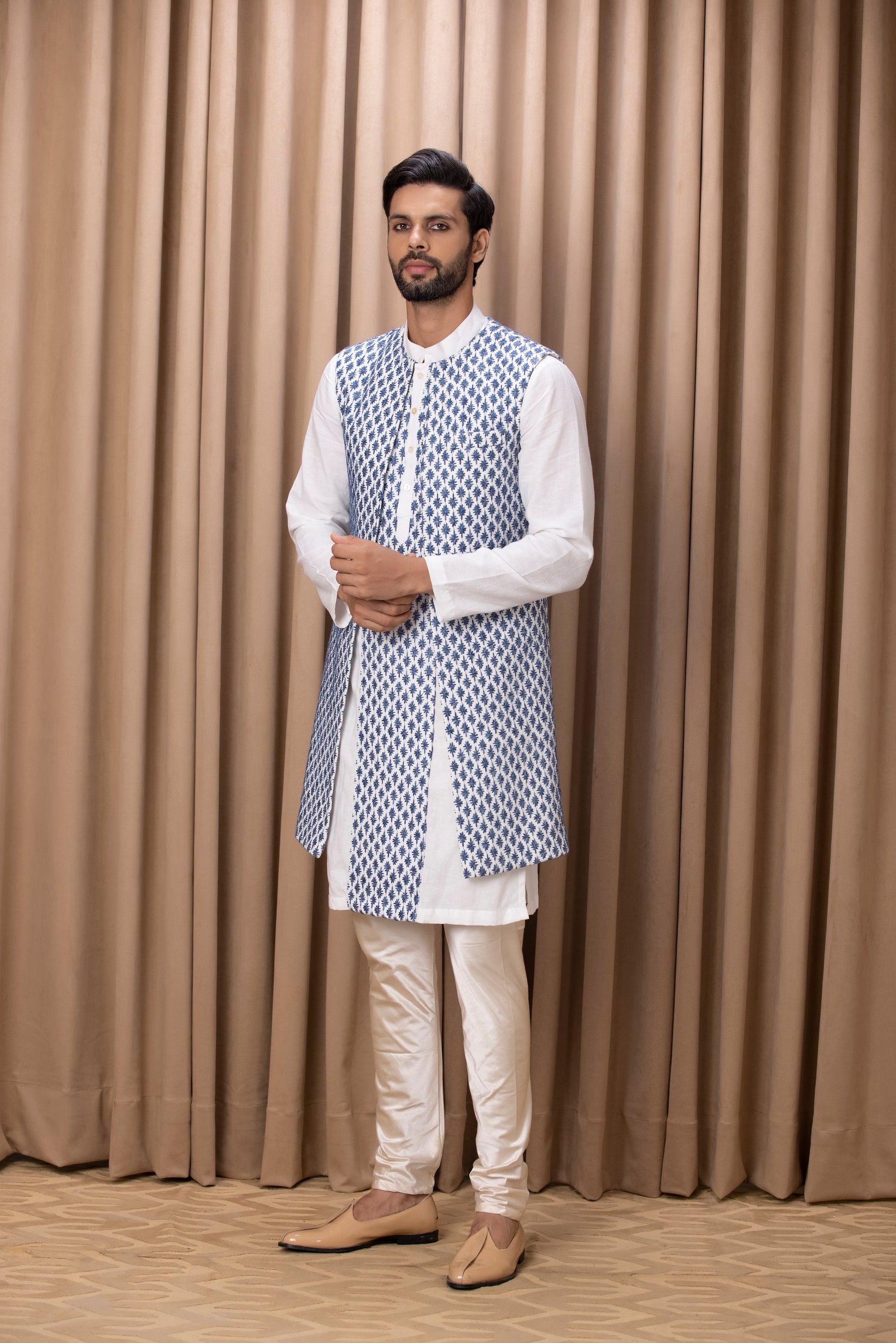 | Featuring a bespoke soft blue front open nehru jacket with intricate thread embroidery and minimal detalis. Perfect for any indoor or outdoor occasion. This comes with an embroidered front panel kurta and off white churidaars |