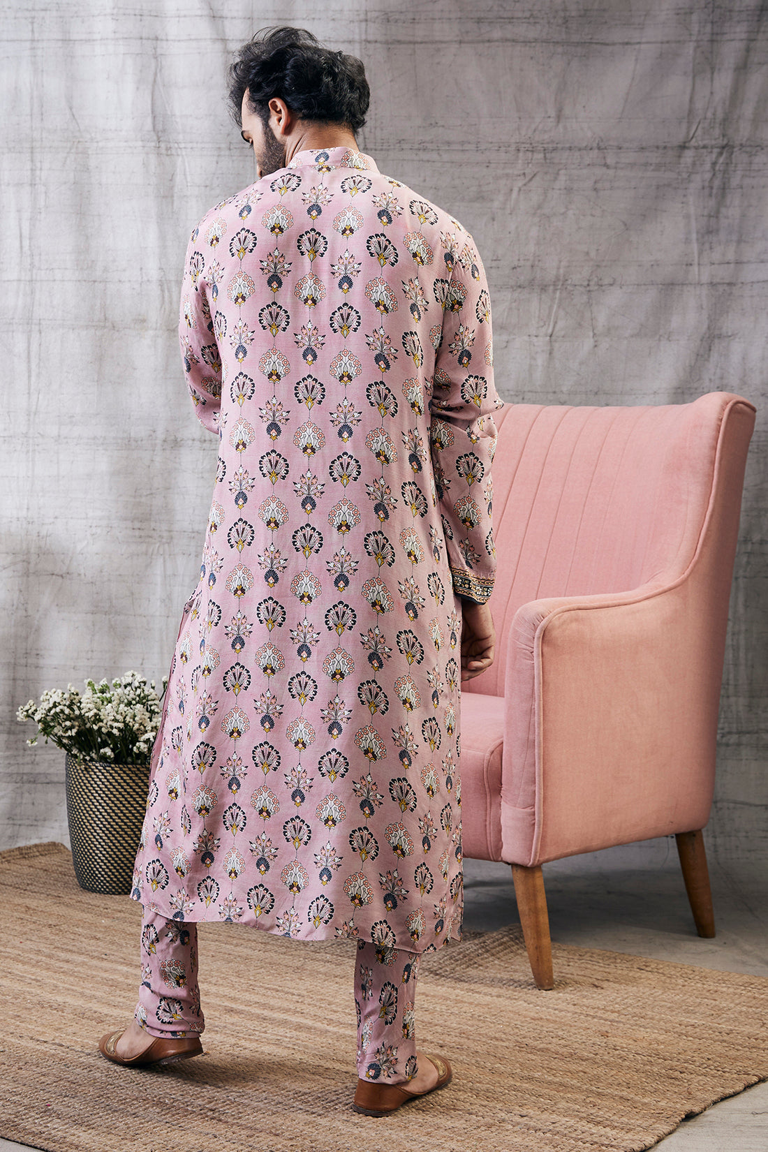 Grace meets tradition in the Sarouk Printed Kurta Set, crafted in lustrous Malaysian silk and adorned with intricate Sarouk-inspired prints. The soft blush-pink hue adds a touch of feminine charm, while the flowing silhouette ensures comfort without compromising elegance. Perfect for festive gatherings, daytime celebrations, or graceful evening wear, this kurta set pairs classic artistry with contemporary style. The silk fabric drapes beautifully, reflecting just the right amount of sheen, and the coordinated bottoms complete the effortlessly elegant look.