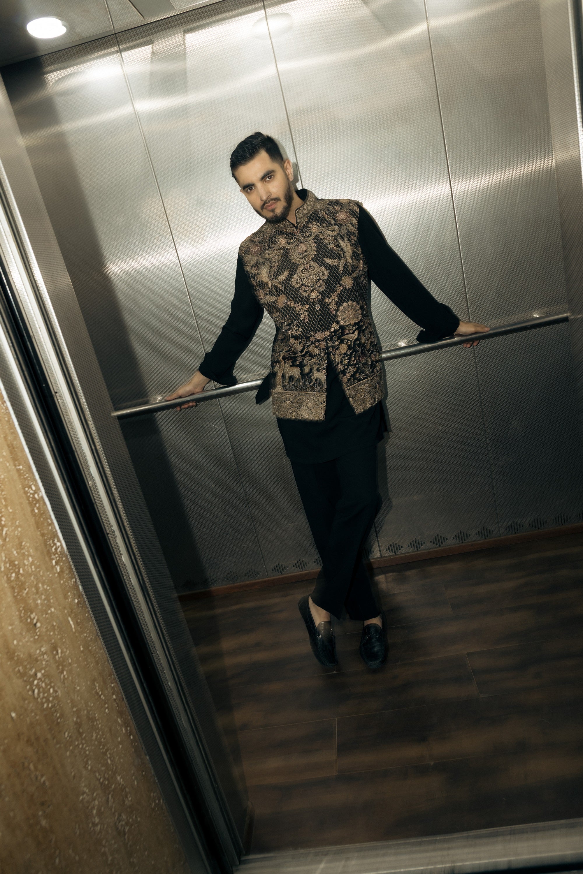 The black bundi set, made from high-quality Italian stretch fabric, offers a sharp, tailored look with added flexibility, ensuring a refined and comfortable fit for any sophisticated event or evening gathering.