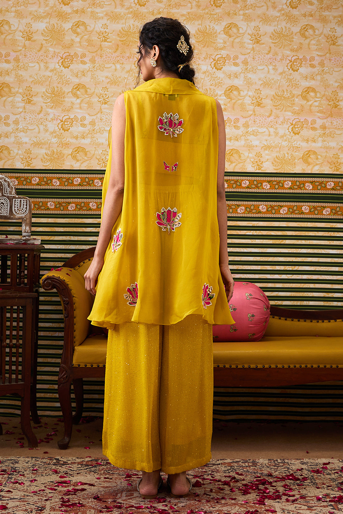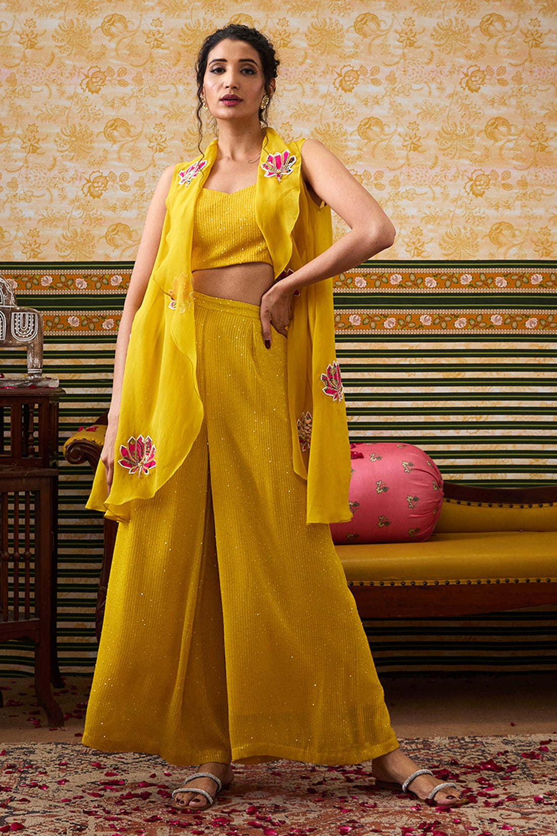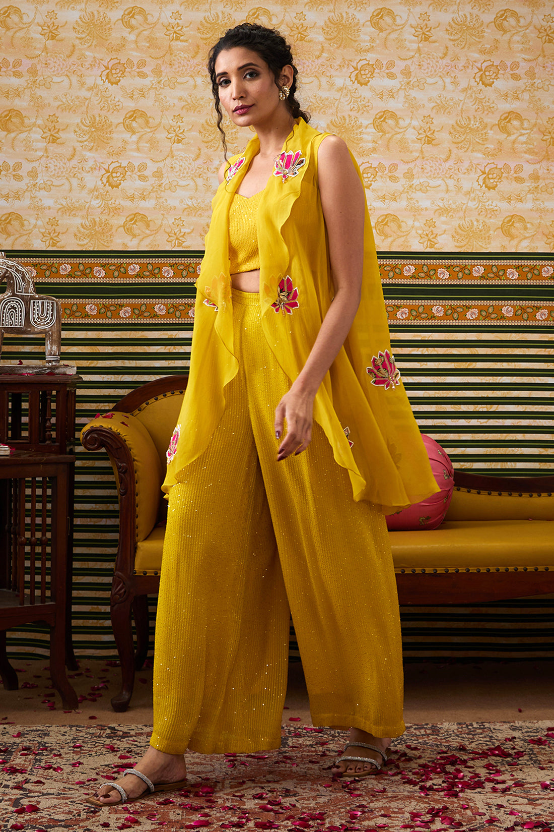 Featuring a yellow Applique Co-Ord set. It consists of a sequenced bustier & top and an applique high-low jacket.