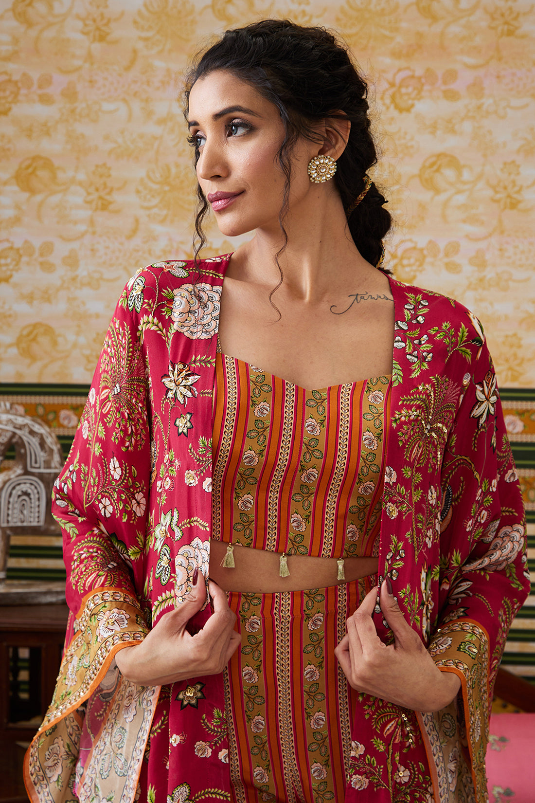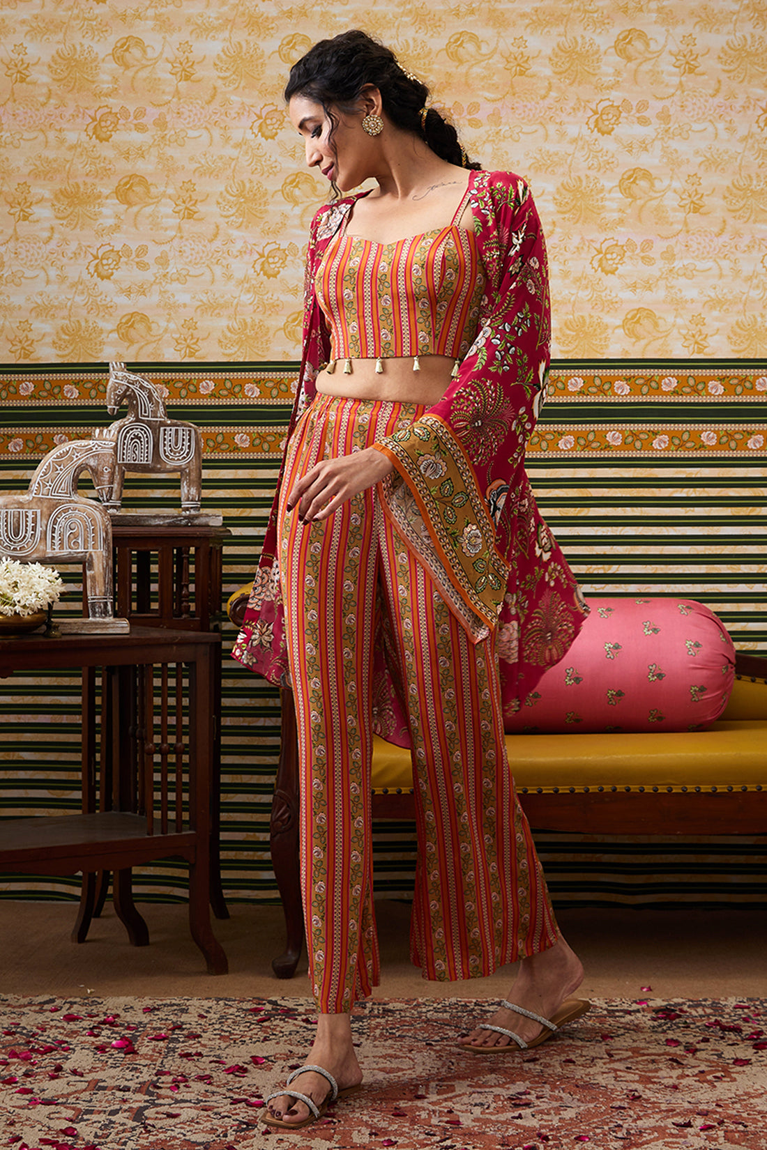 Featuring a Orange & Pink Co-Ord set in crepe fabric. It is paired with a hand embroidered Kimono Jacket & straight pant