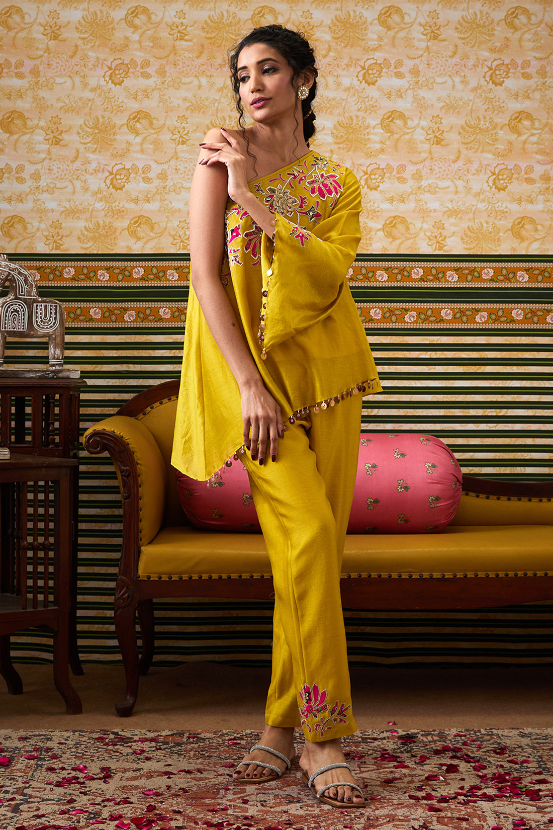 Featuring a yellow One Shoulder top with patchwork in Chanderi silk fabric. It is paired with a straight pant and a slip