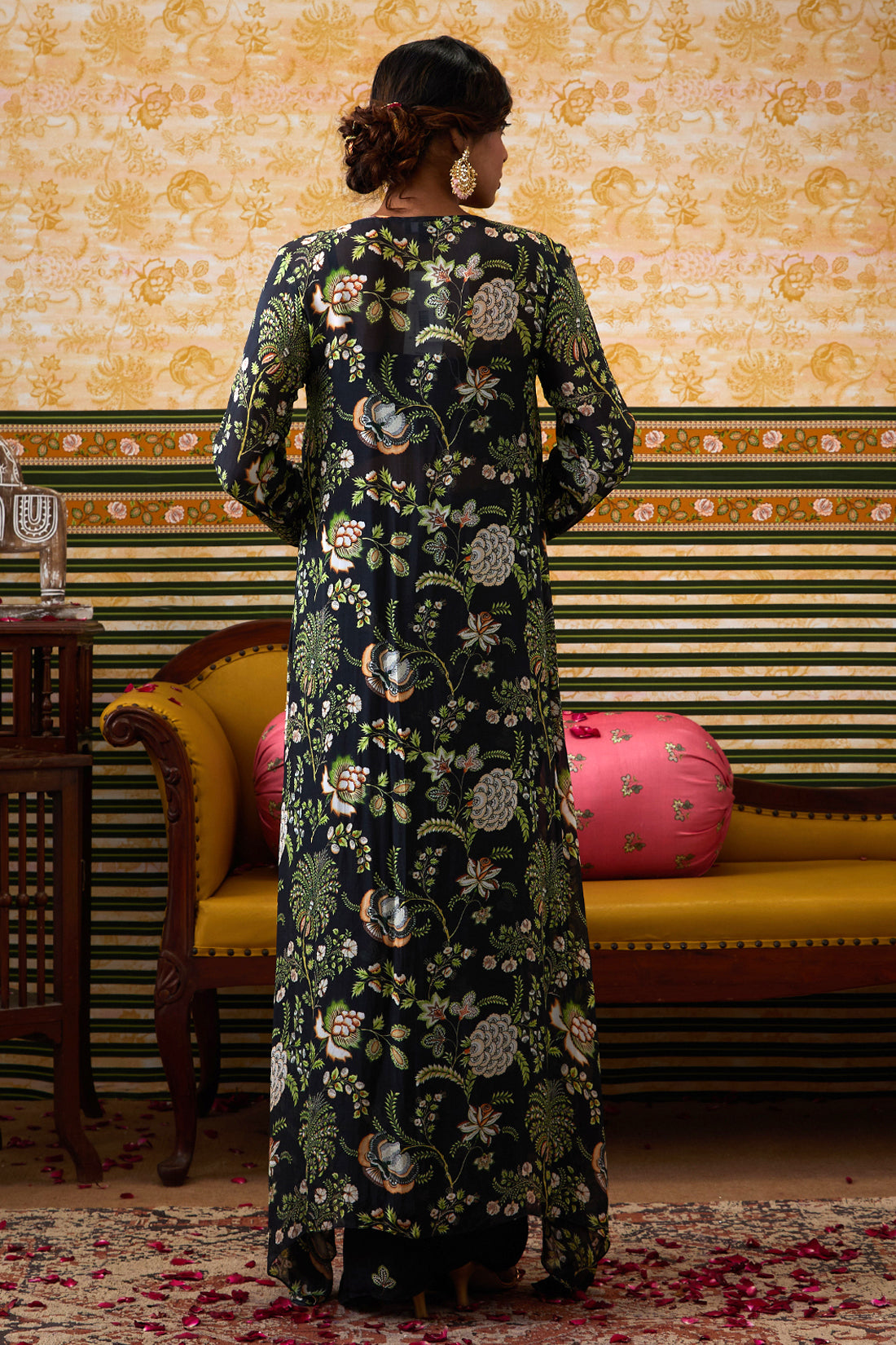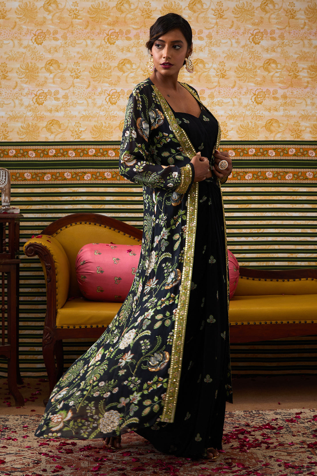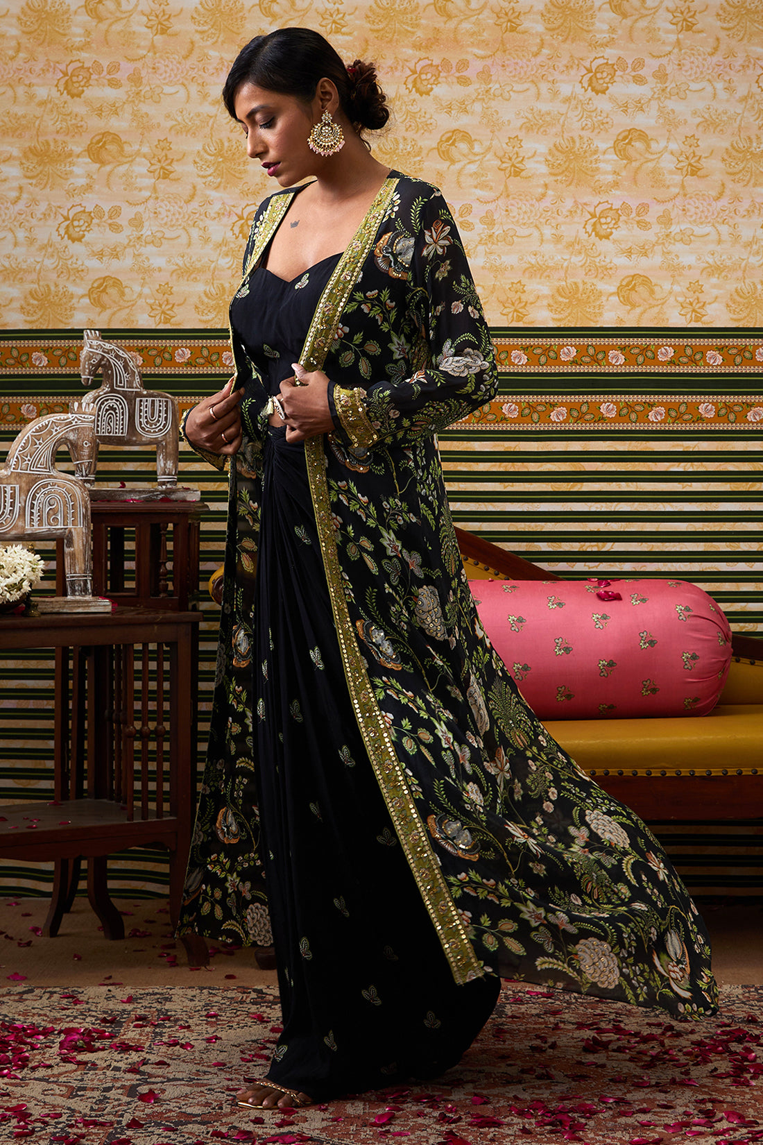 Featuring a printed Black Drape Skirt set in crepe fabric. It is paired with a Hand embroidered Jacket & bustier
