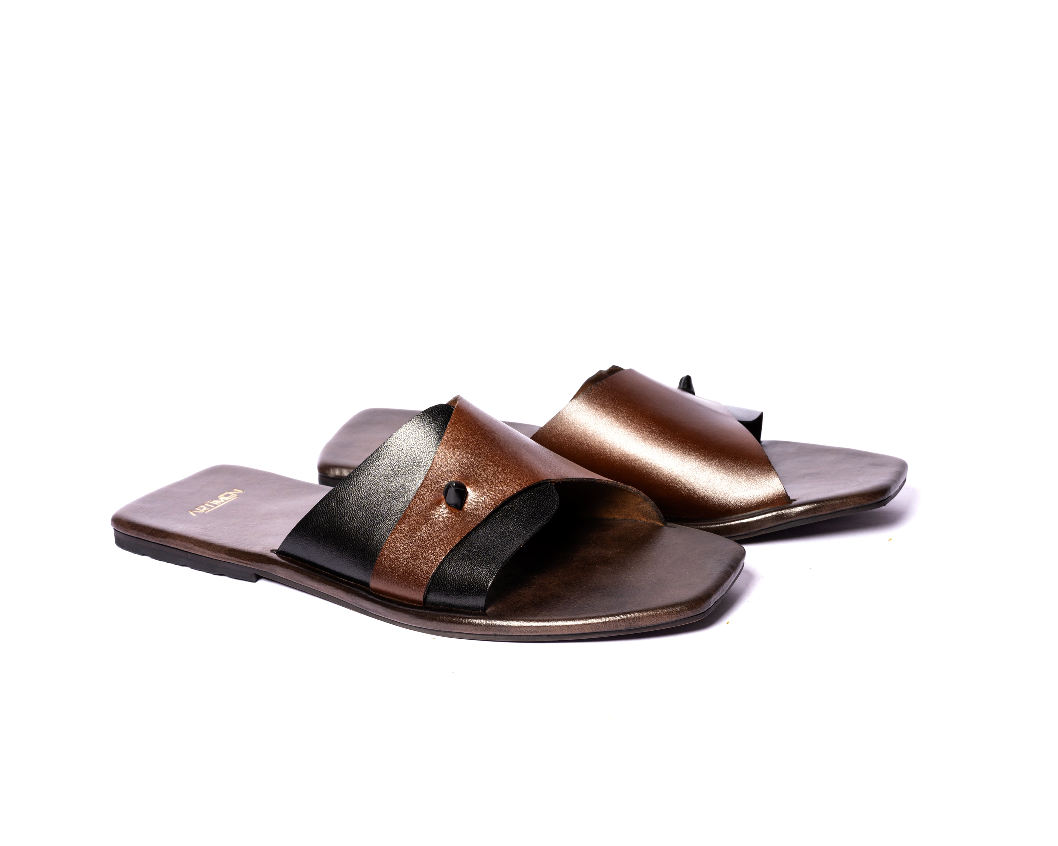 | Knotting slips Single broad band not only helps in gripping the foot nicely but also adds to the overall look of the slippers. Burnt tan and black leather with a Knot infront gives it a feel of semi formal or smart casual steps. Cushioned base with compressed rubber sole gives it the softness and comfort. |