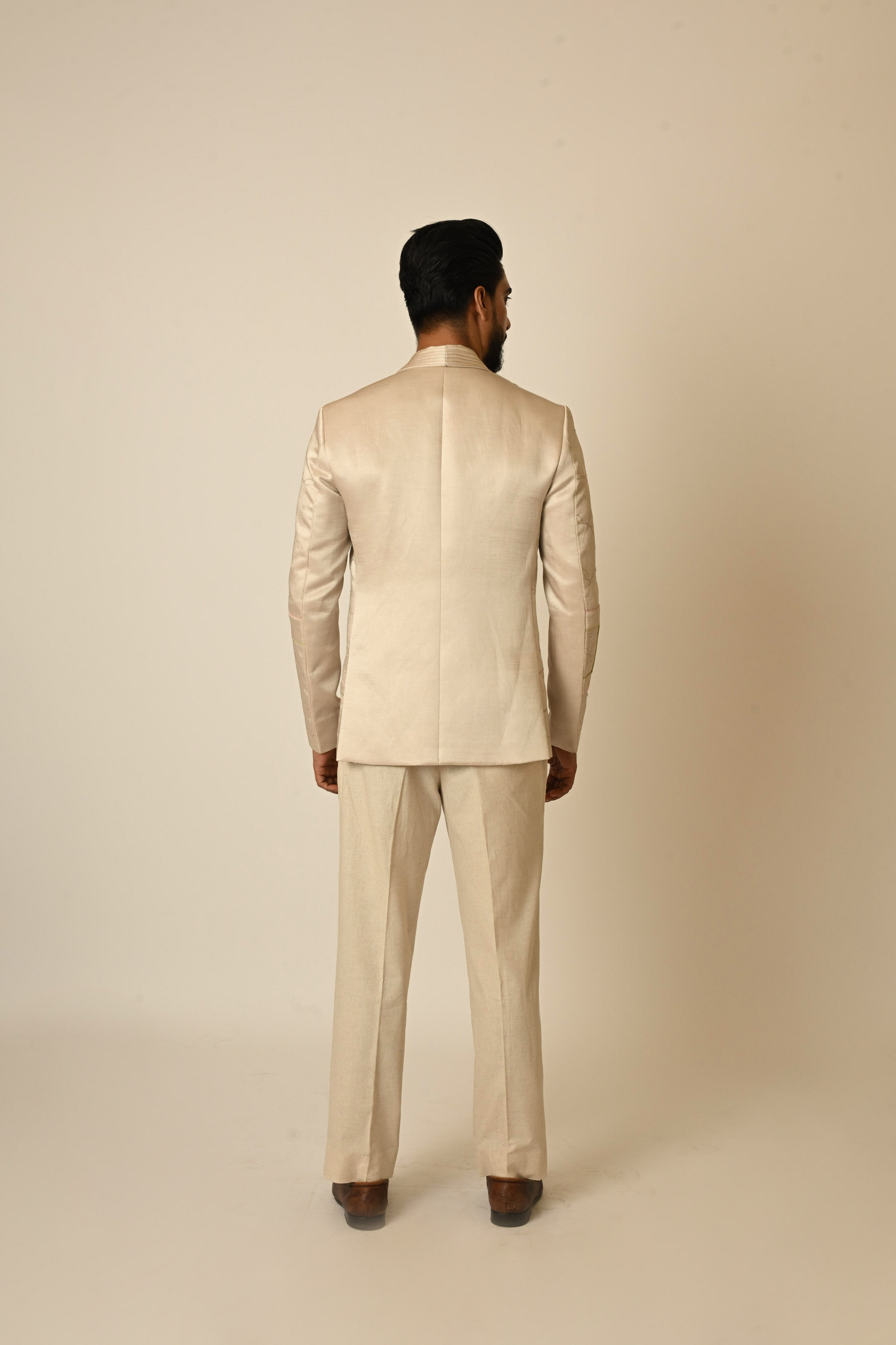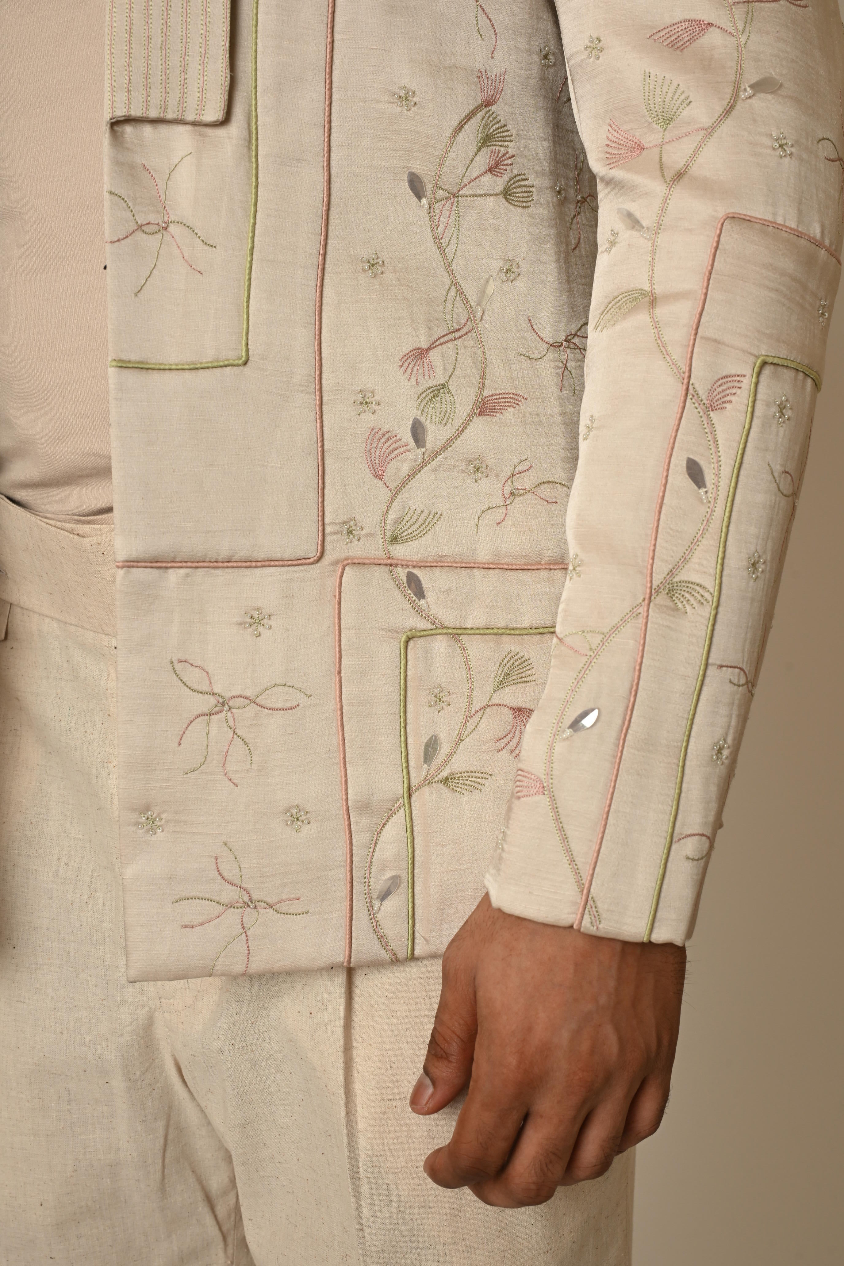 A pastel pink summer blazer in linen satin blend fabric, highlighted with abstract leaf motif theadwork and highlighted with fabric cords