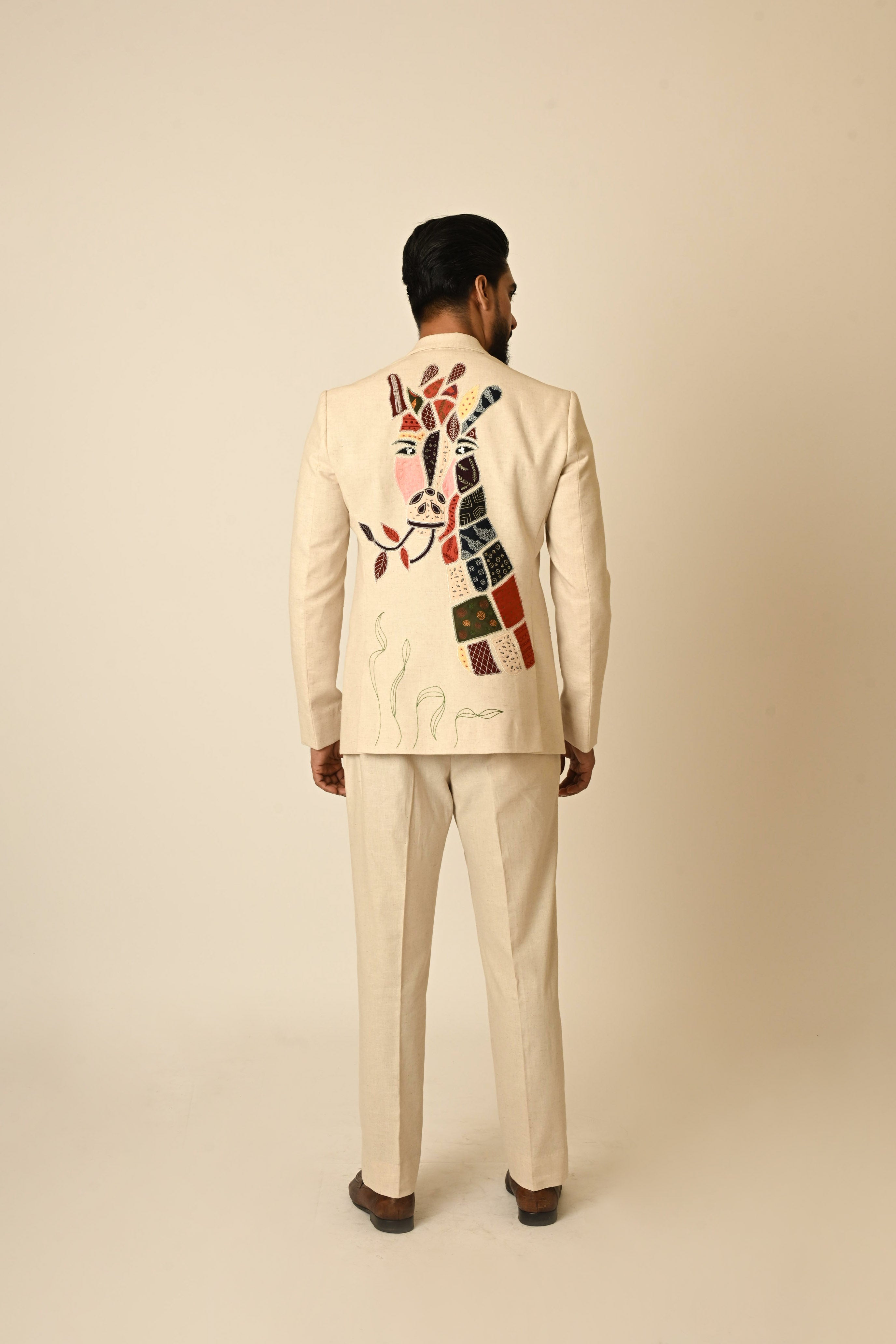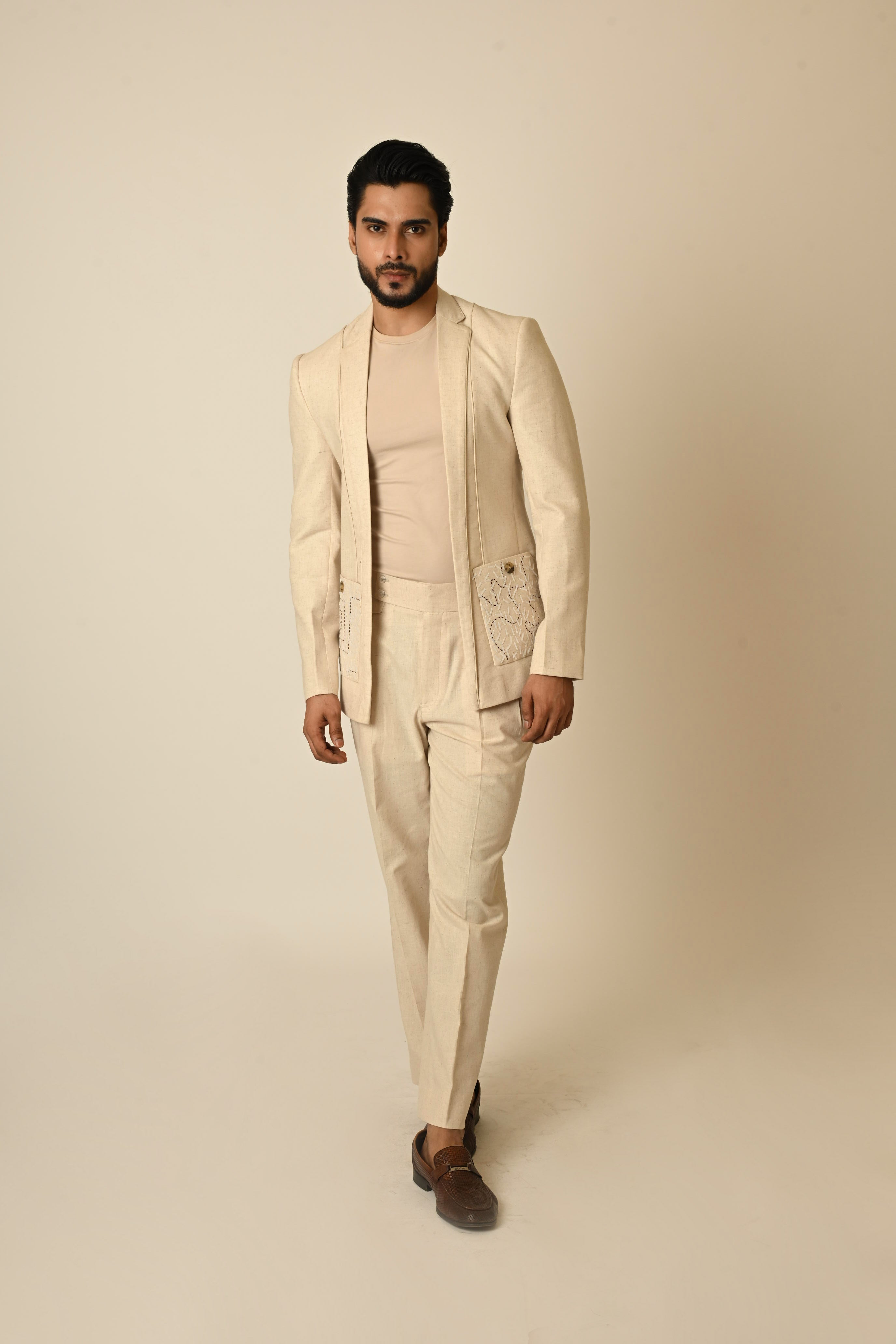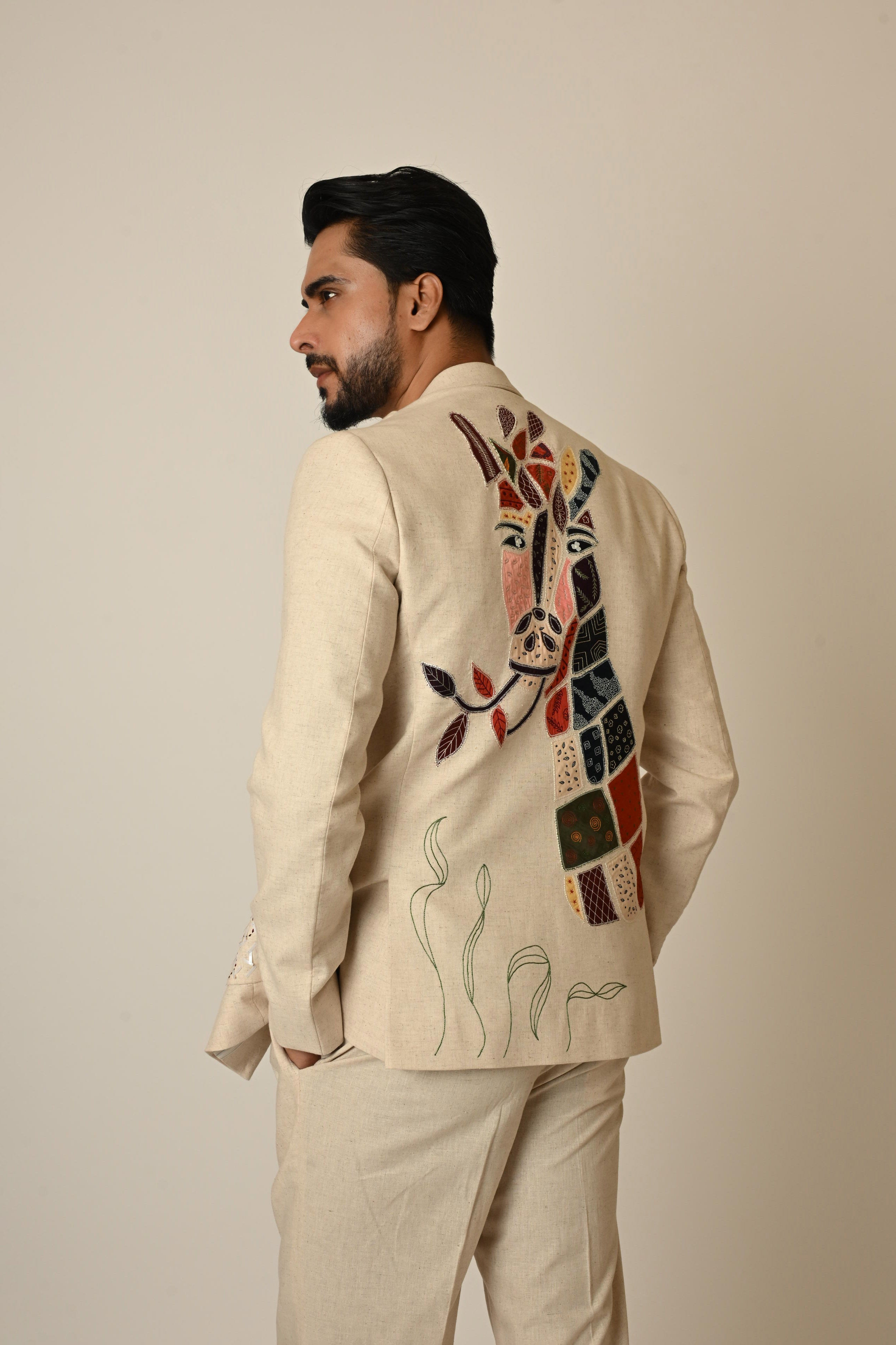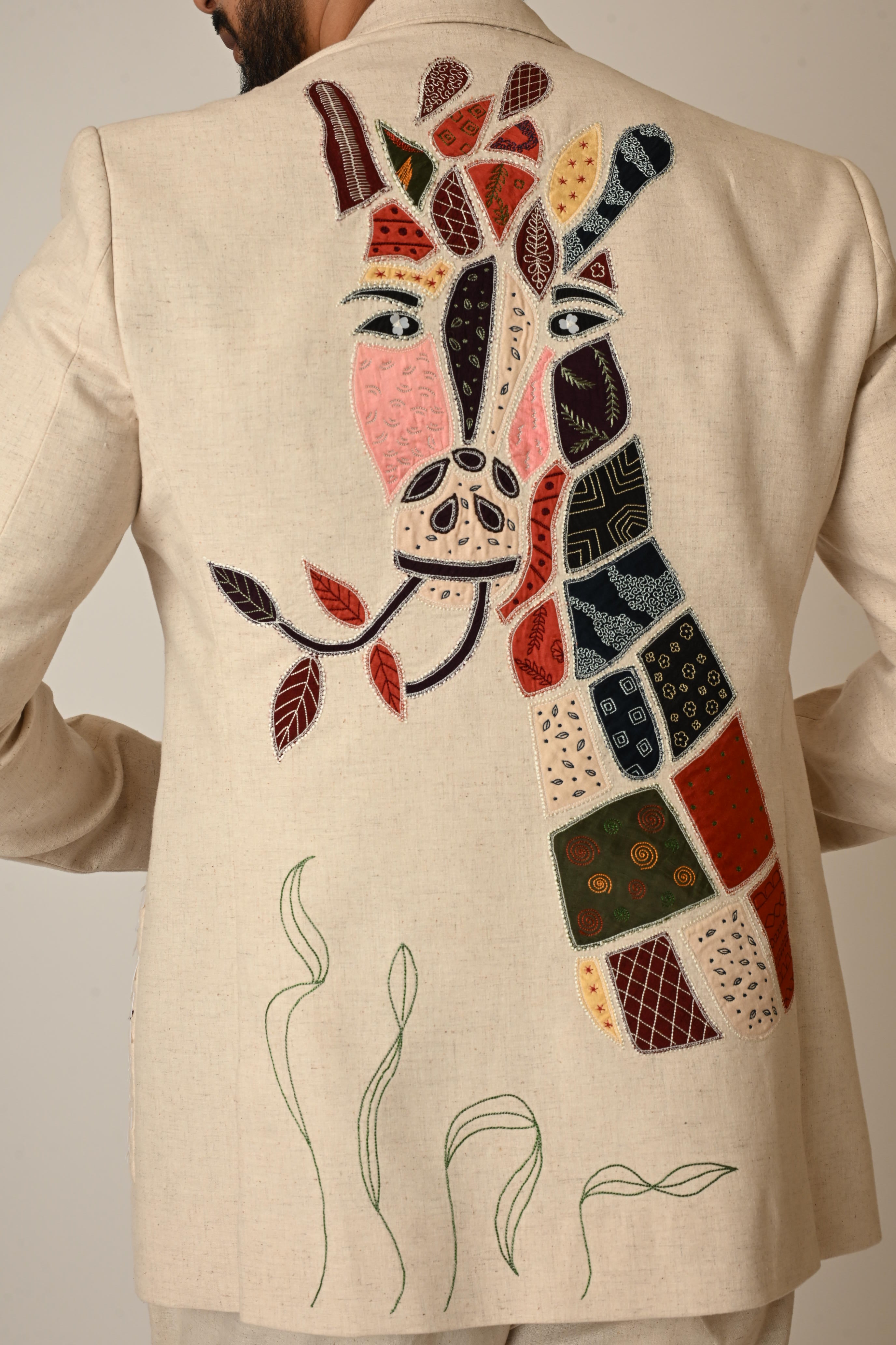 A dusty beige linen summer blazer highligted with an applique on the back work using different embroidered fabrics and ornamented with two highlighted pockets on the front