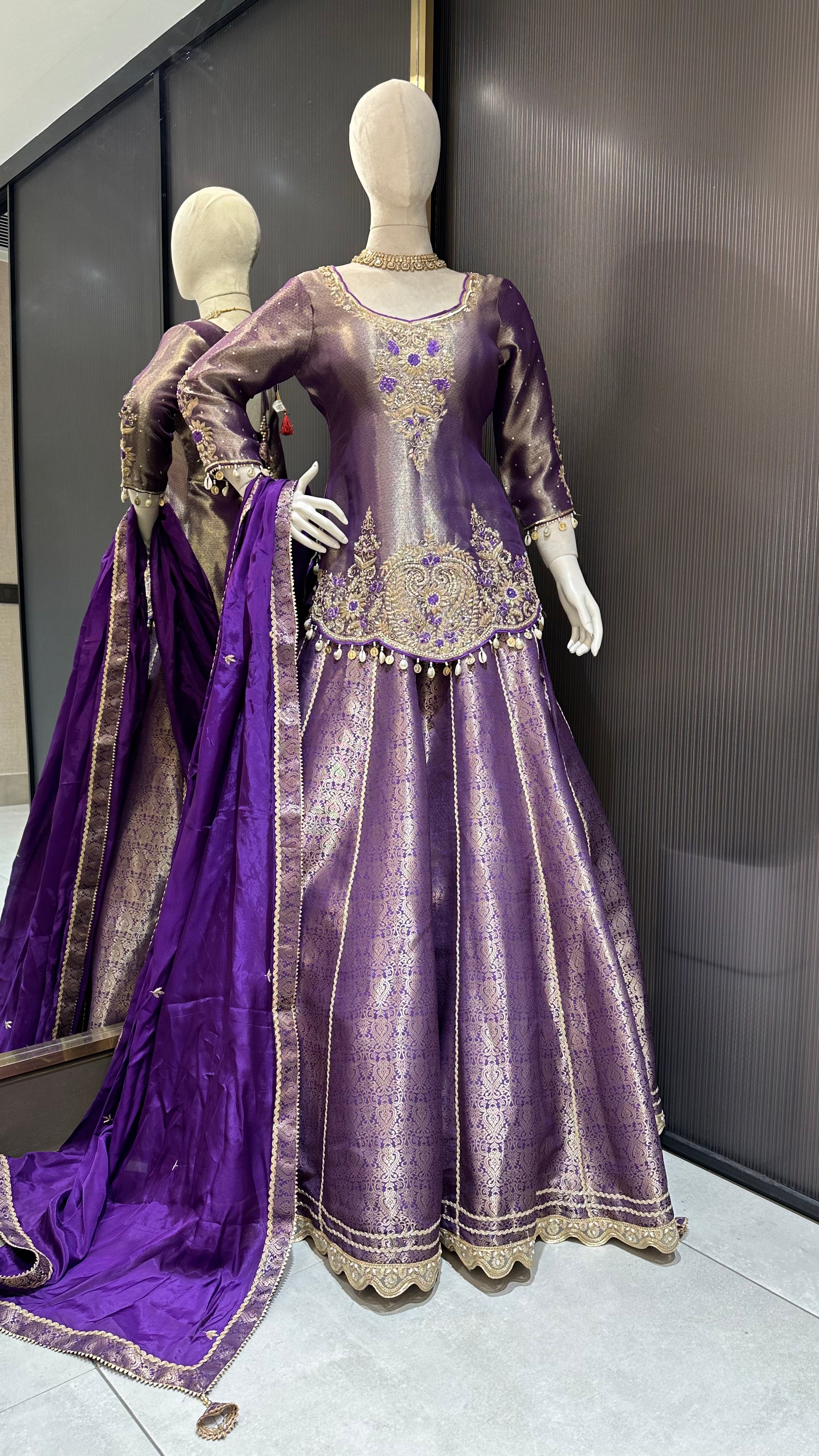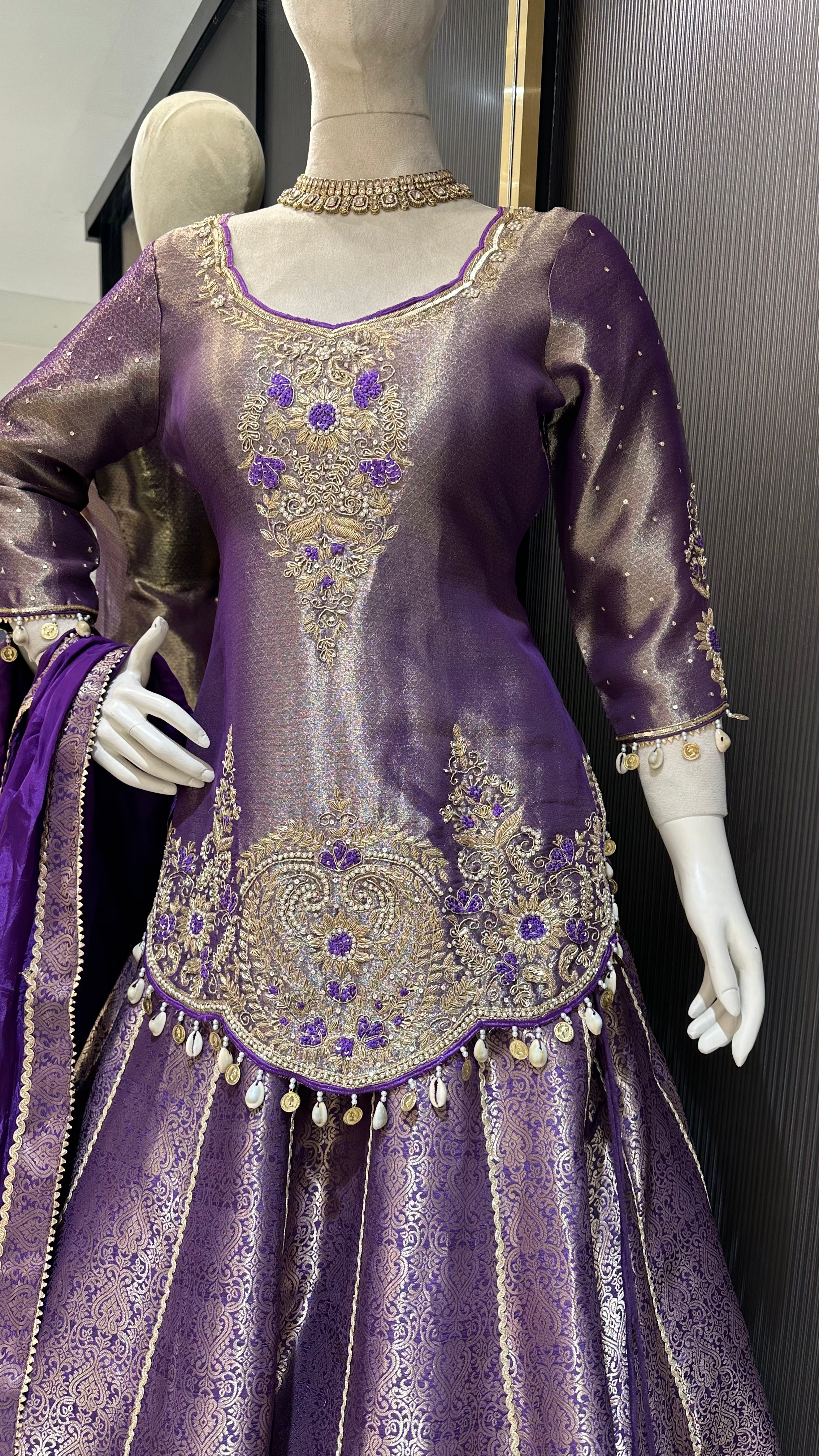 Crafted In Luxurious Silk Fabric, This Suit Set Exudes Timeless Elegance With Its Royal Purple Hue And Rich Golden Undertones. The Bodice Is Beautifully Adorned With Intricate Golden Embroidery And Delicate Embellishments, Adding A Touch Of Sophistication. A Structured Waist Design Enhances The Silhouette, While The Flared Skirt Showcases A Graceful Drape With A Subtle Metallic Sheen. The Matching Dupatta, Detailed With Ornate Golden Borders, Completes The Ensemble, Making It A Perfect Choice For Weddings, Festive Occasions, Or Grand Celebrations.
