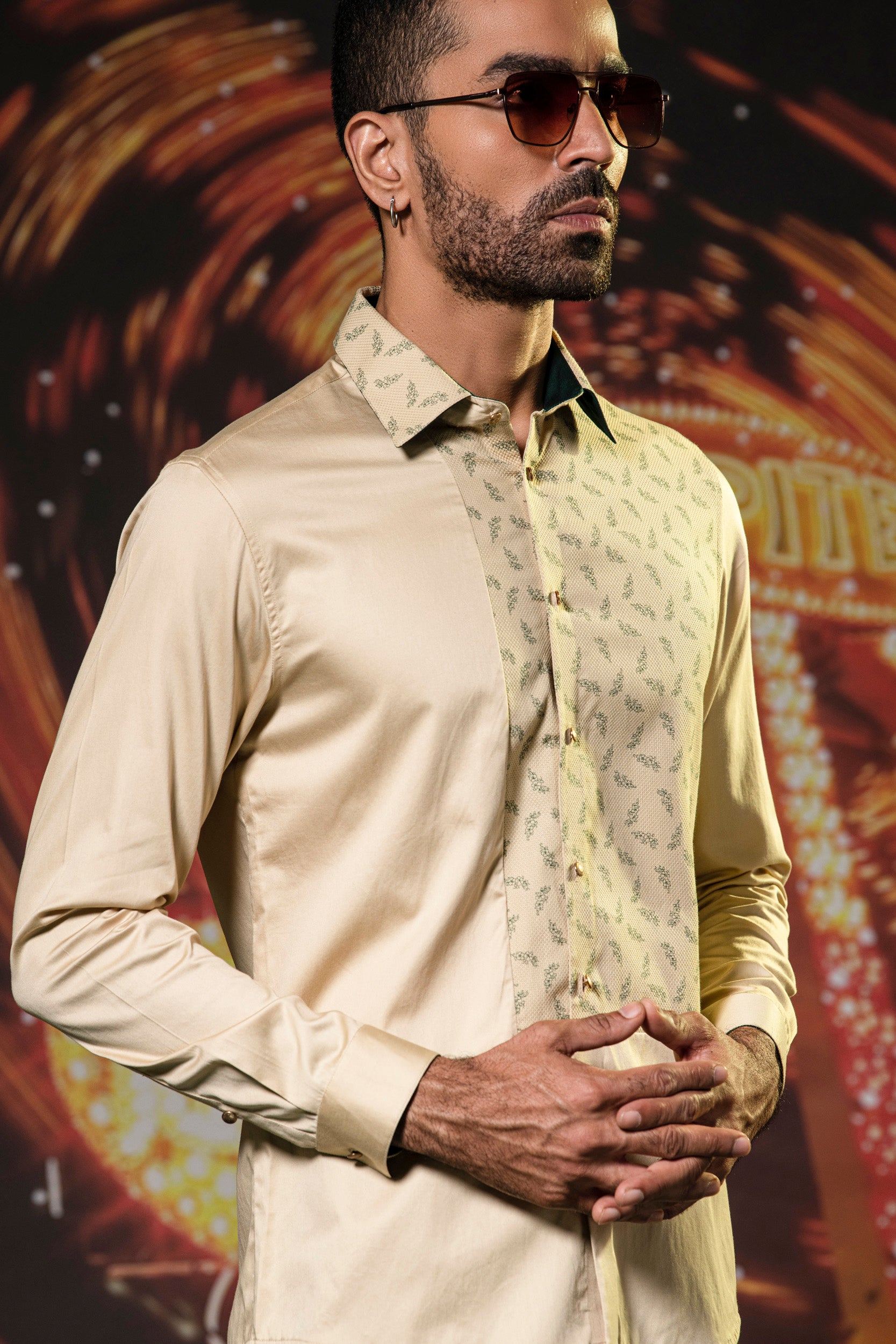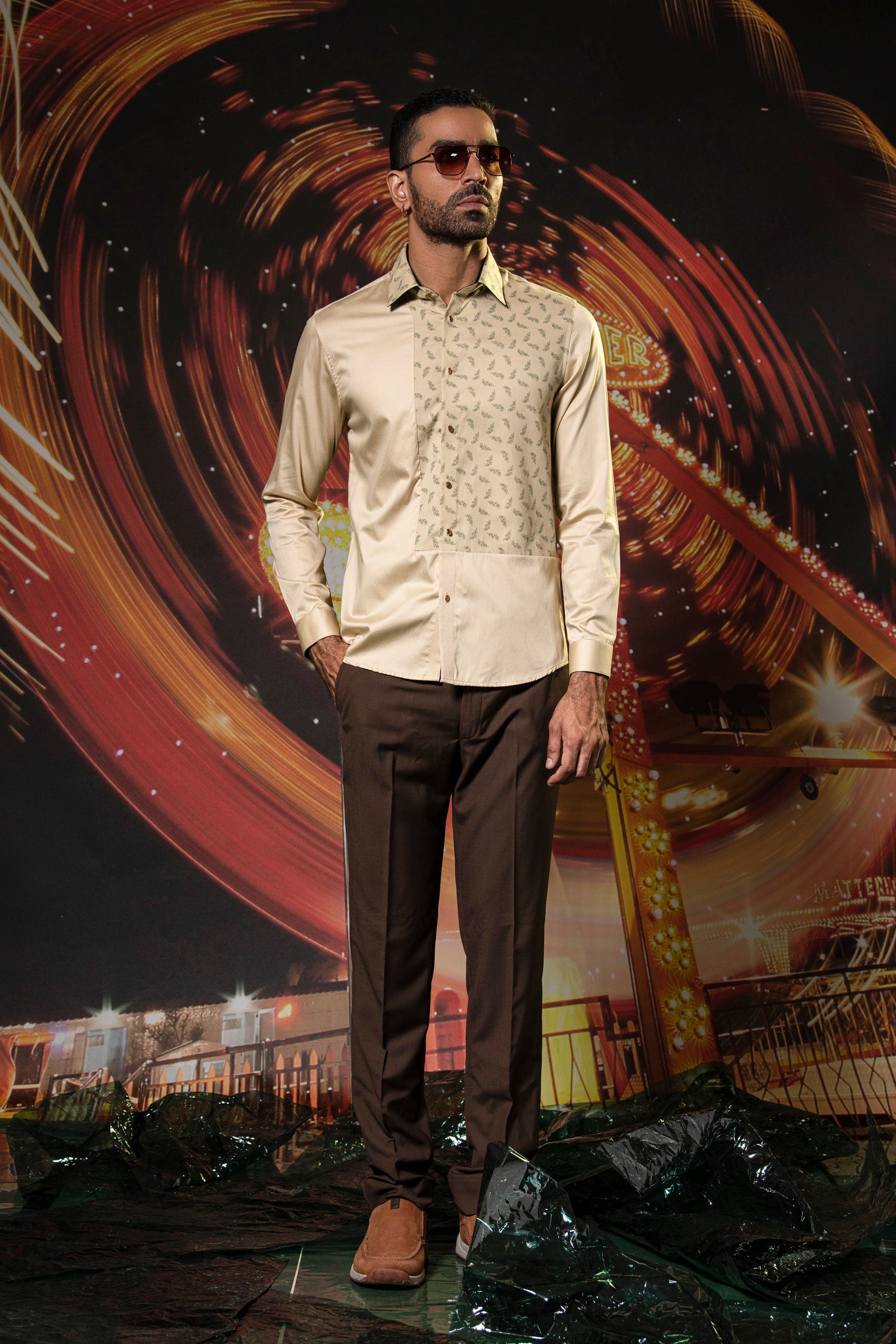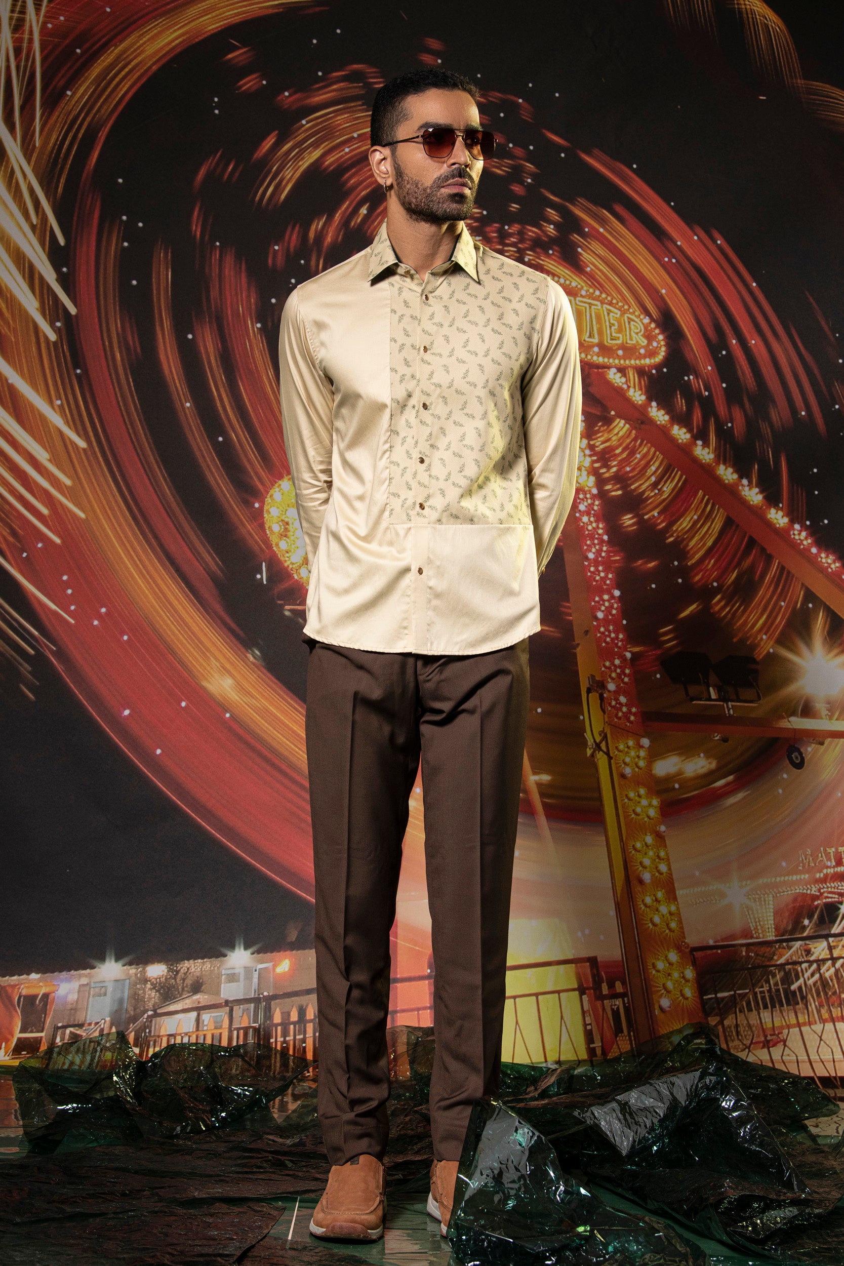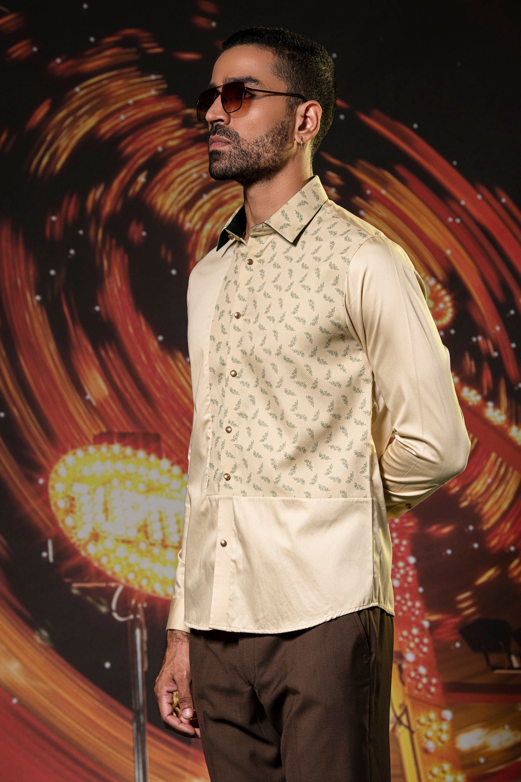 Featuring a beige shirt in cotton base with floral print. Perfect wear for parties and cocktail ceremonies.