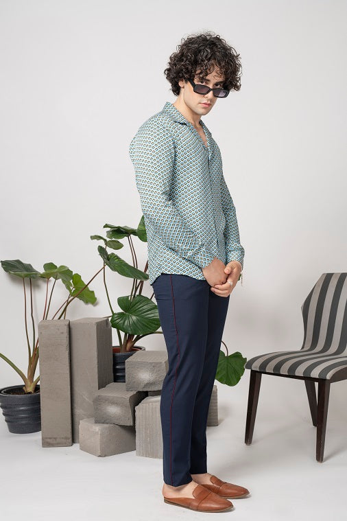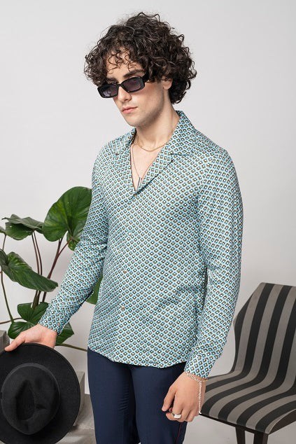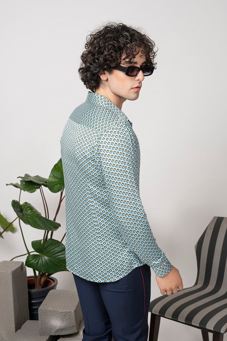 Featuring a blue shirt in cotton satin base with illusion pattern print, antique gold metal buttons, and cuban collar. This contains one piece only.