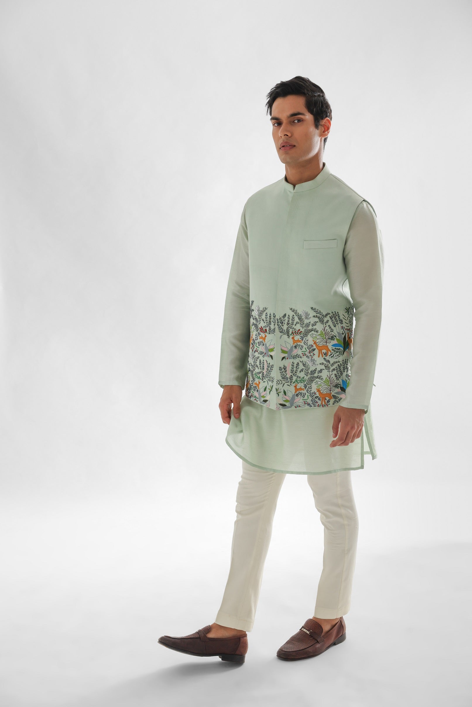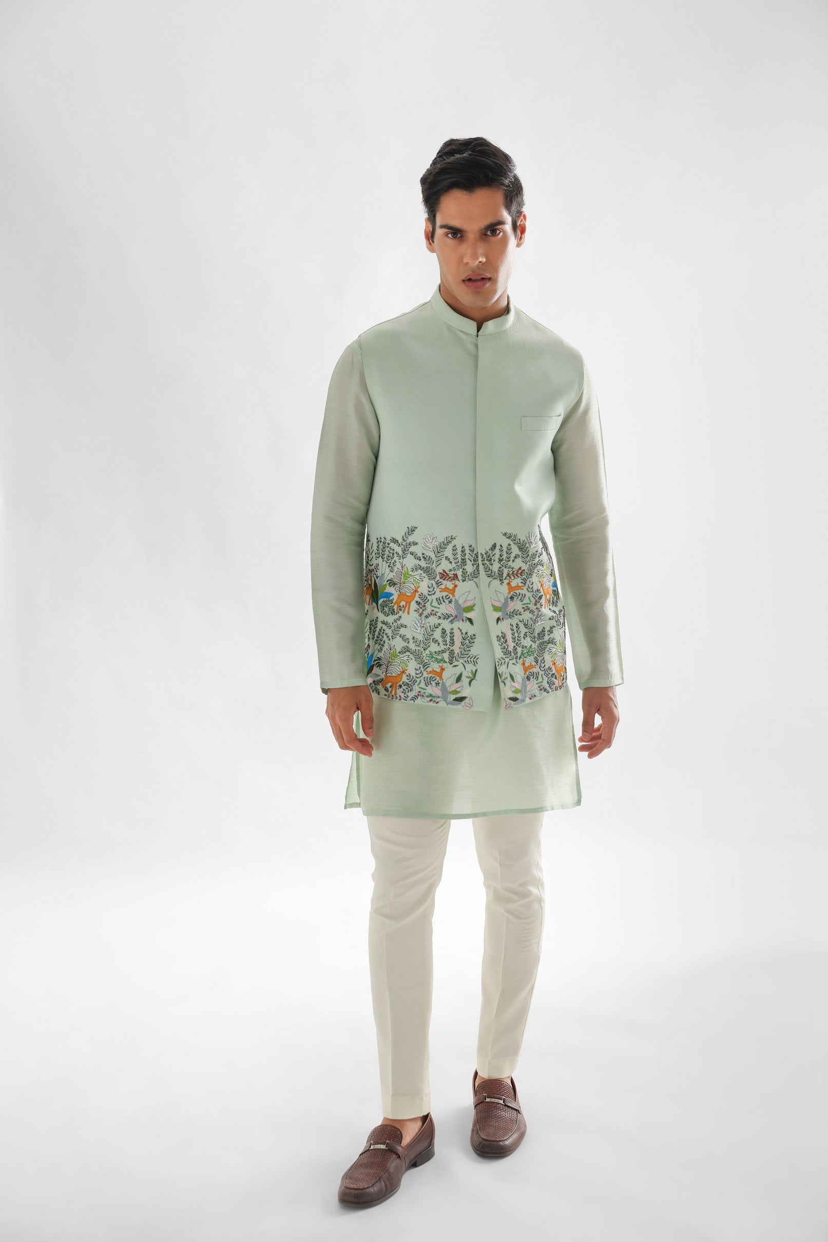 POWDER GREEN NEHRU JACKET USING THE EMBROIDERY OF THREADWORK AND ZARI WORK