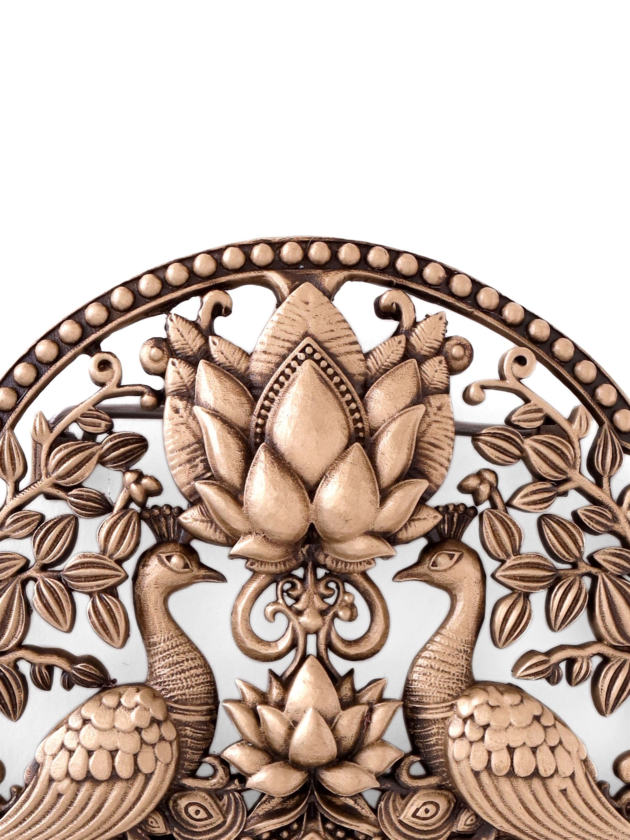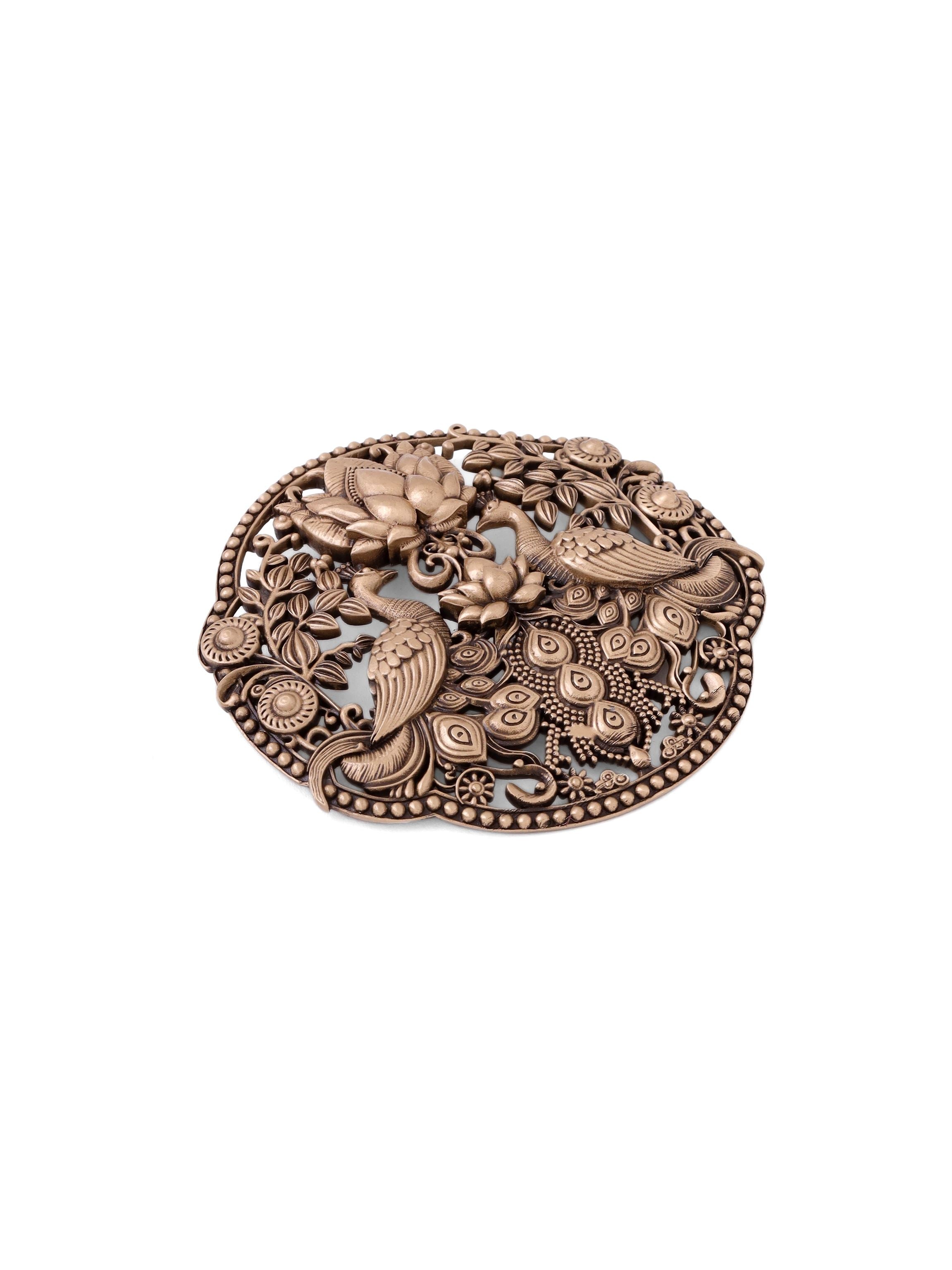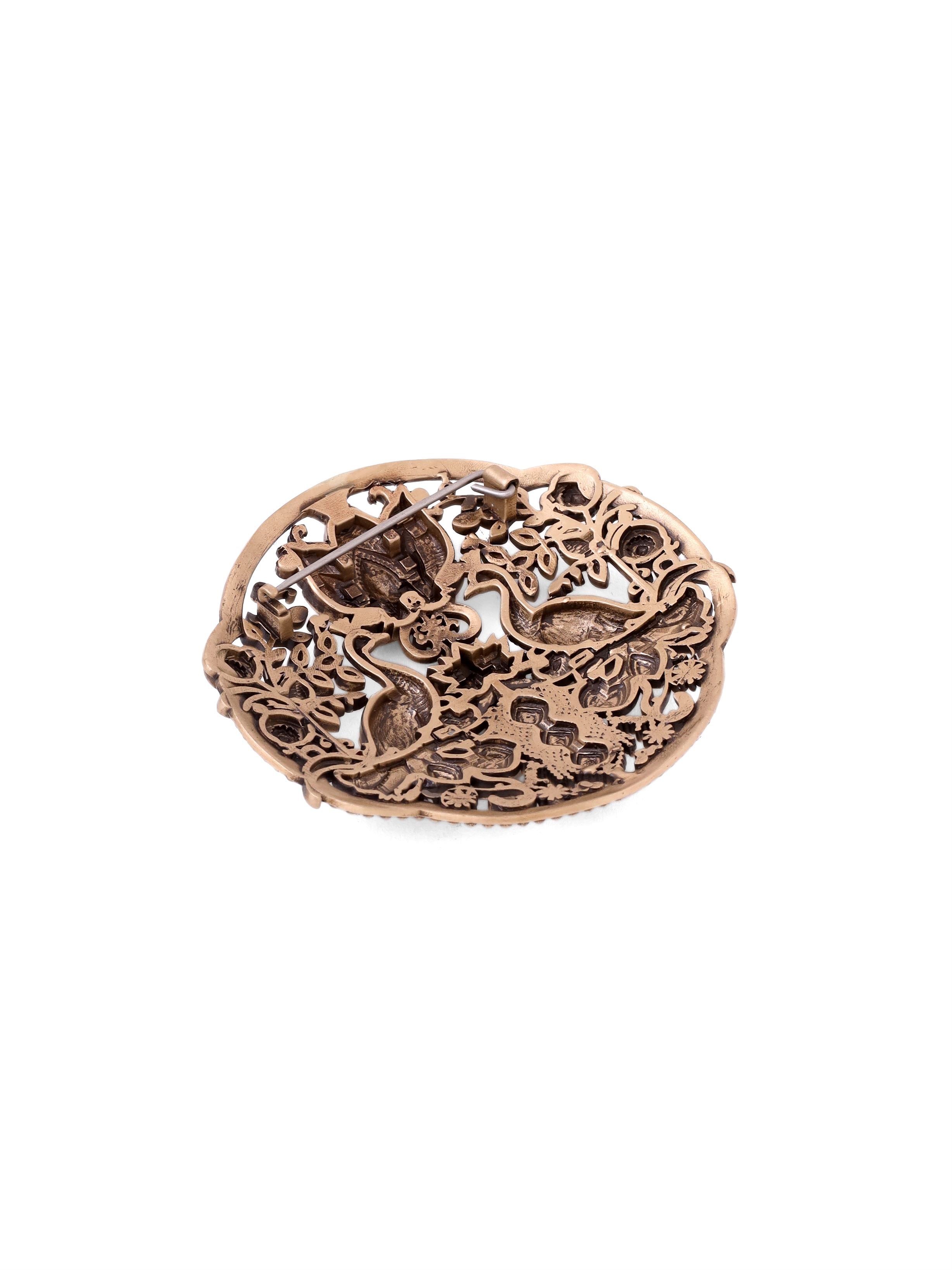 This Peacock Parade brooch features two magnificent peacocks proudly displaying their breathtaking tail feathers. They stand tall, surveying their domain with heads held high, connecting you to the beauty of nature.
