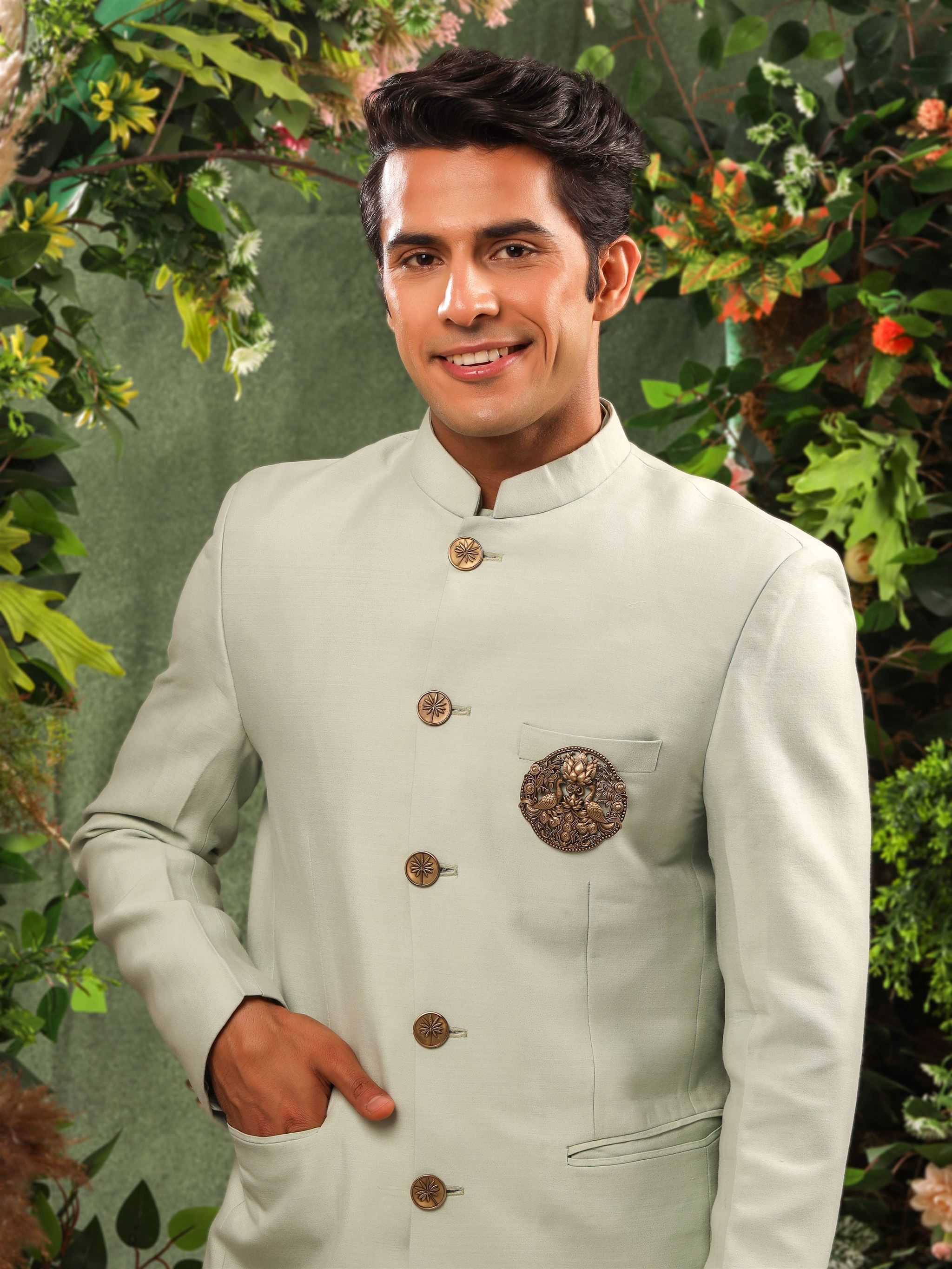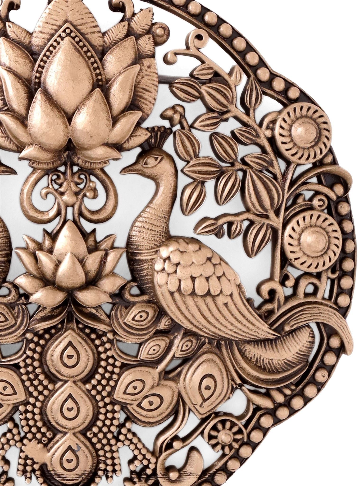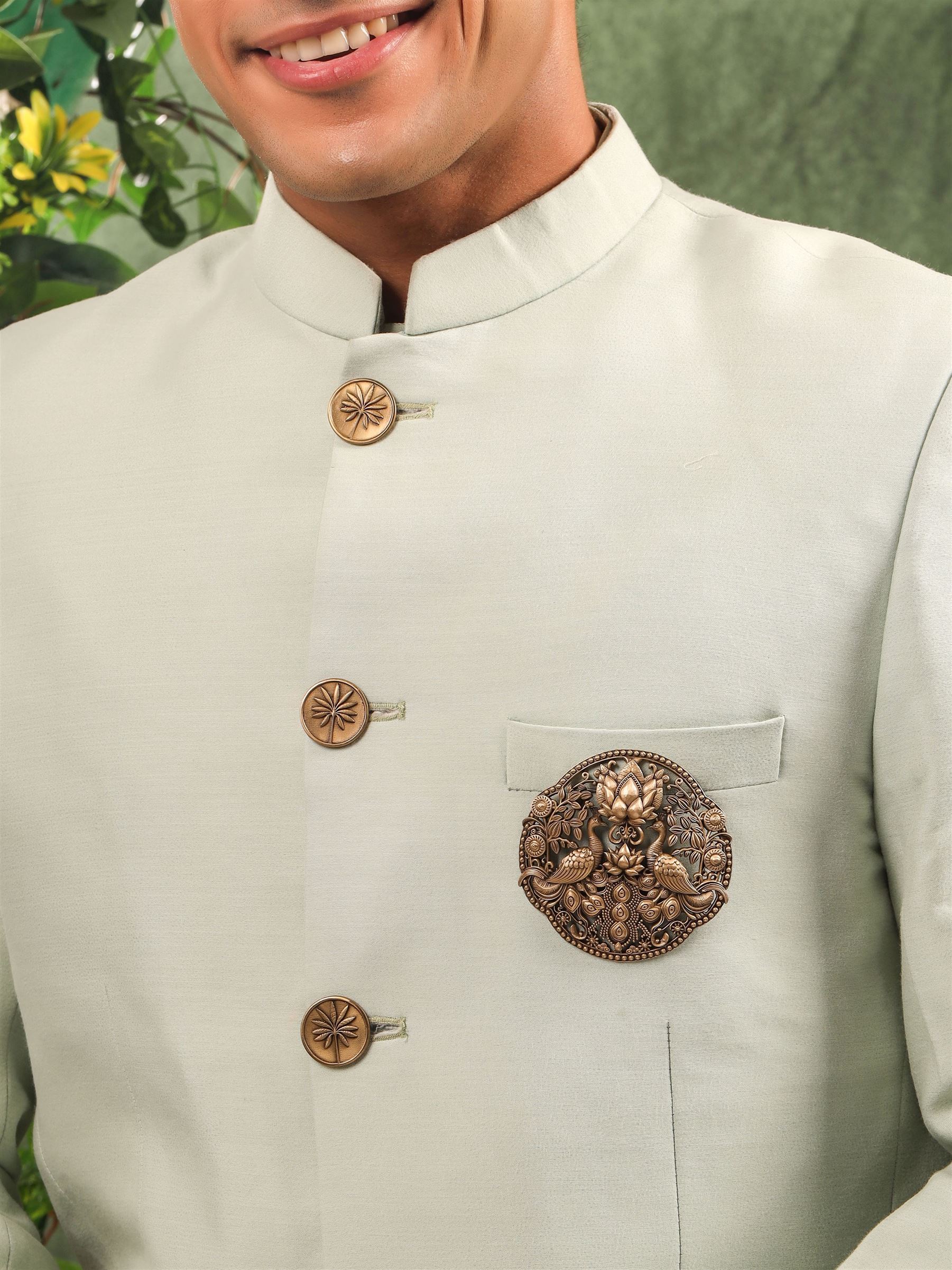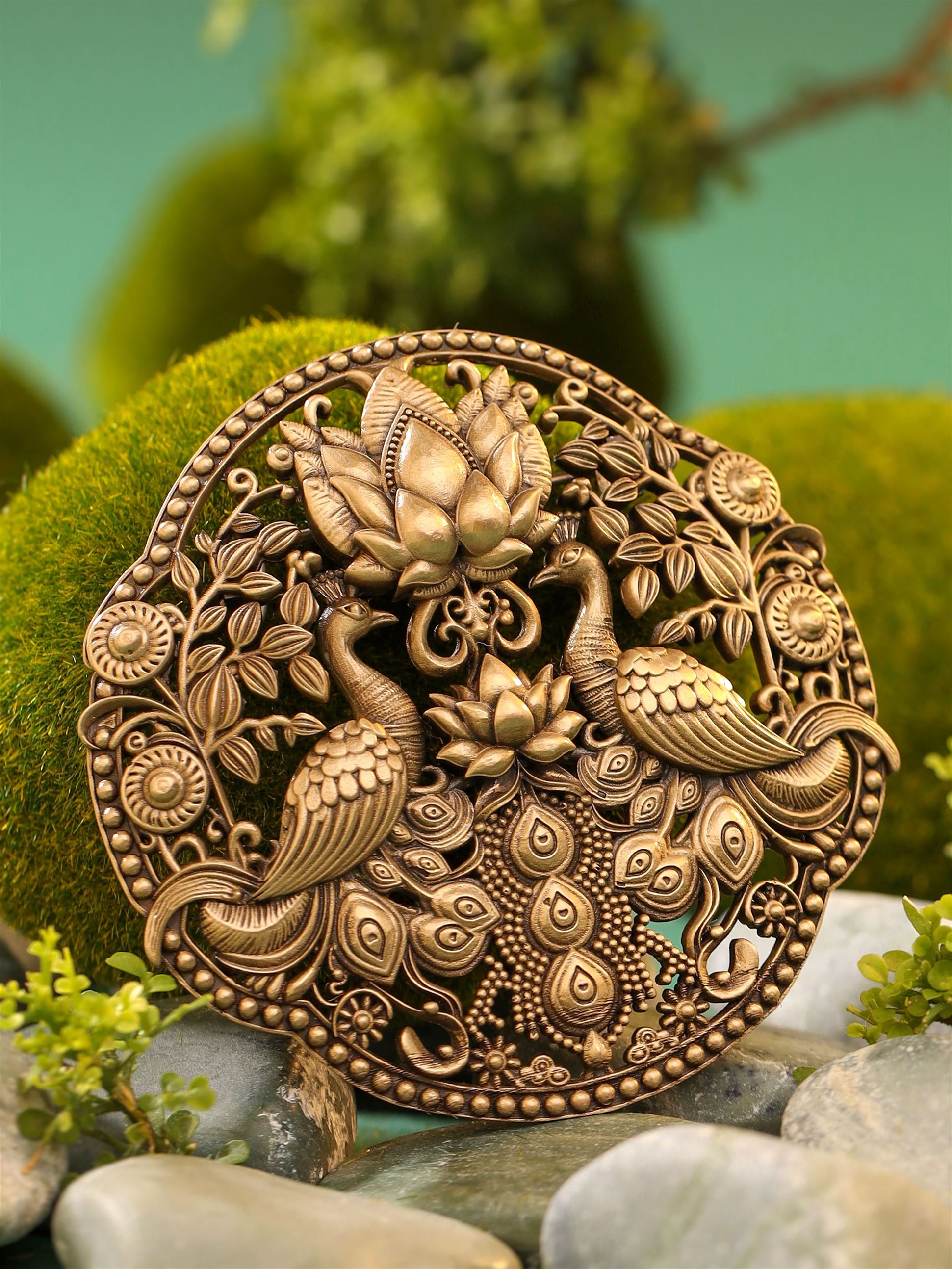 This Peacock Parade brooch features two magnificent peacocks proudly displaying their breathtaking tail feathers. They stand tall, surveying their domain with heads held high, connecting you to the beauty of nature.