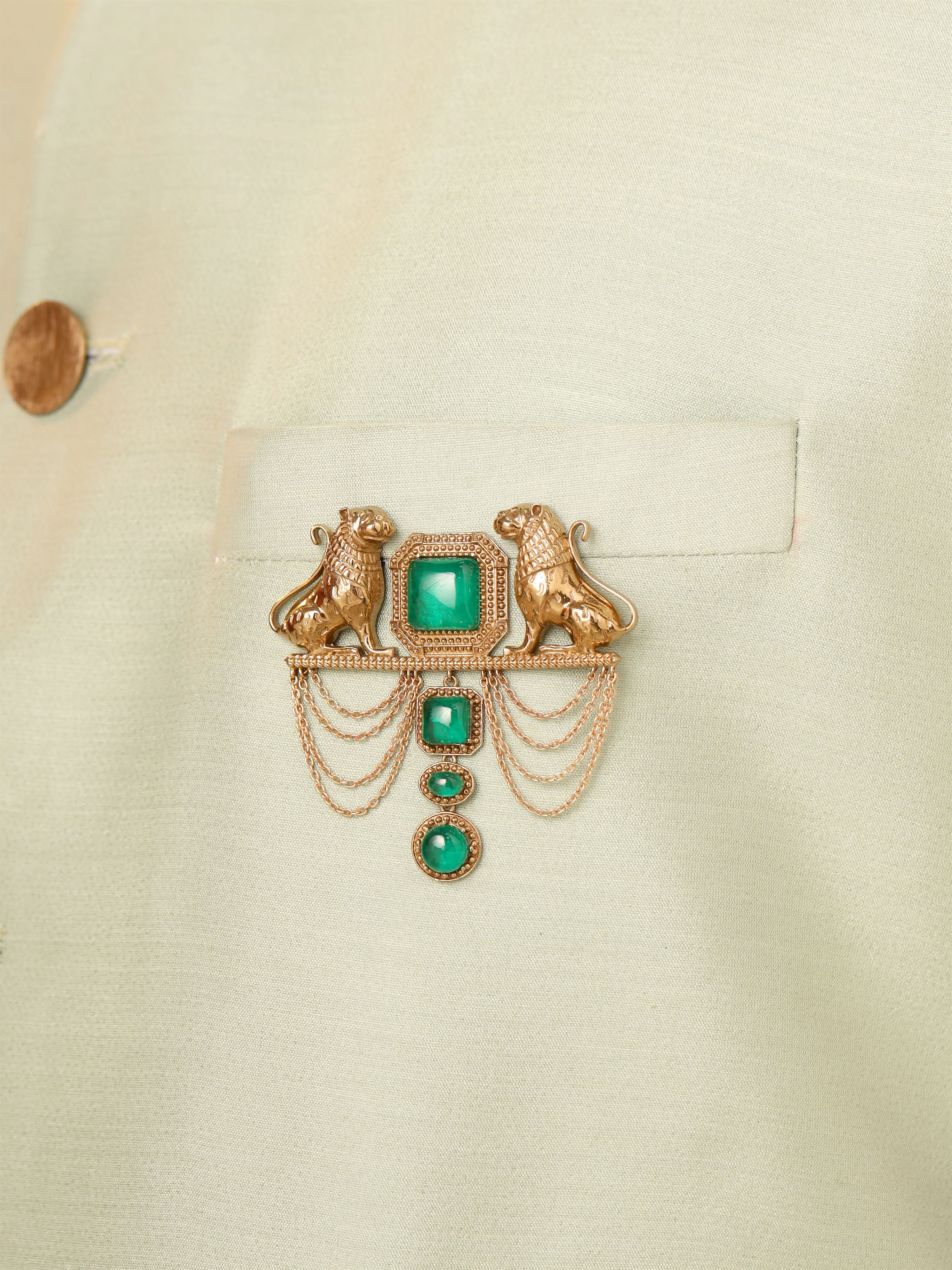 The Sher-e-Shaan Brooch, adorned with regal red gemstones, emanates an aura of majesty and strength. Its design, bold yet elegant, offers a versatile embellishment that effortlessly enhances any attire.